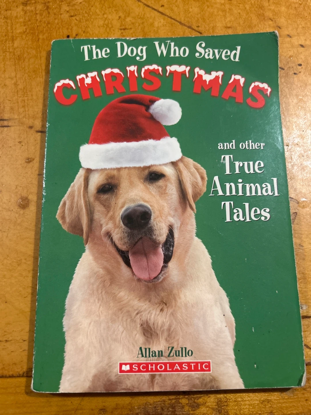 This book features "The Dog Who Saved Christmas" and other true animal stories. It's published by Scholastic and written by Allan Zullo. Stories about animals.