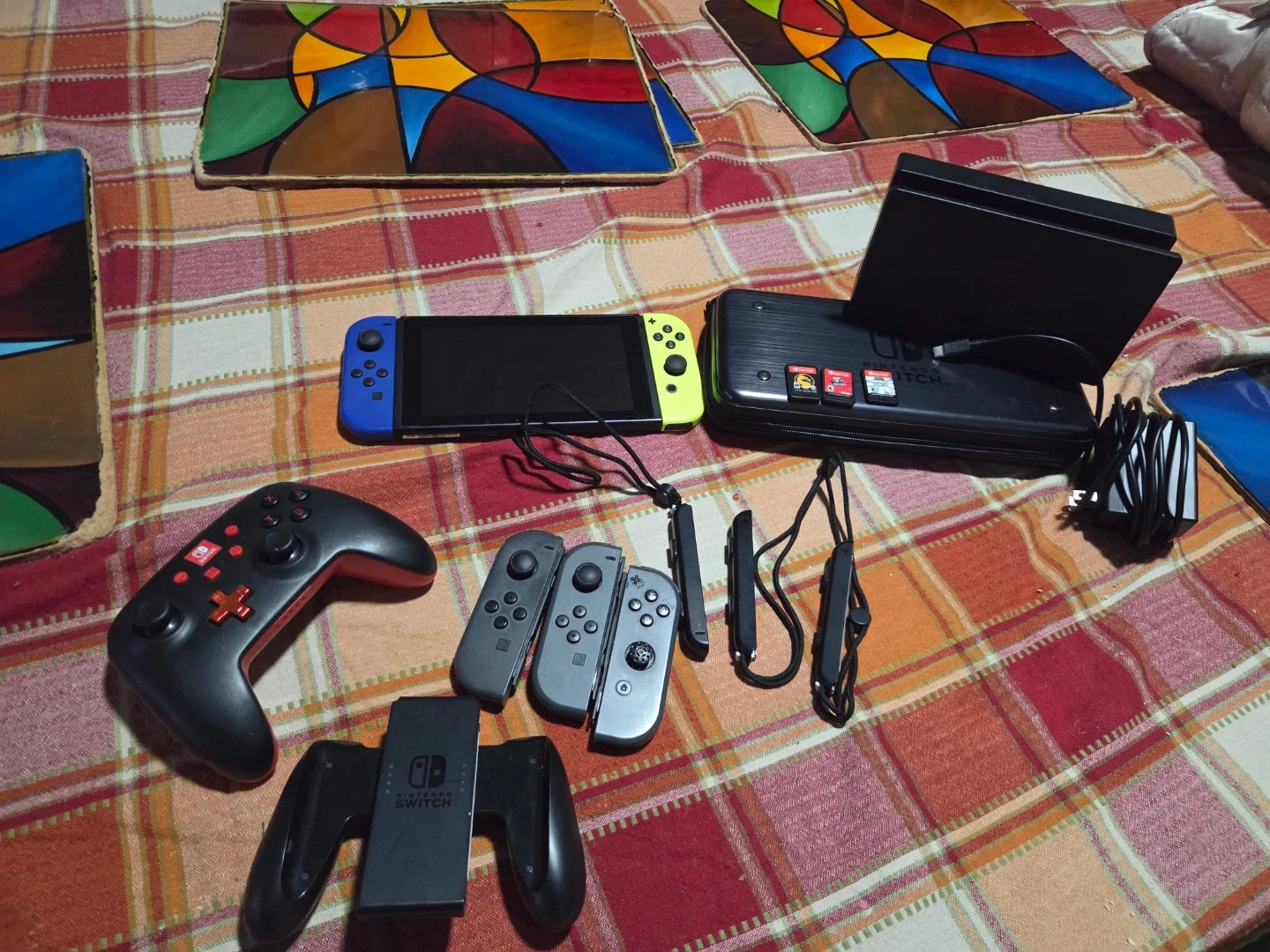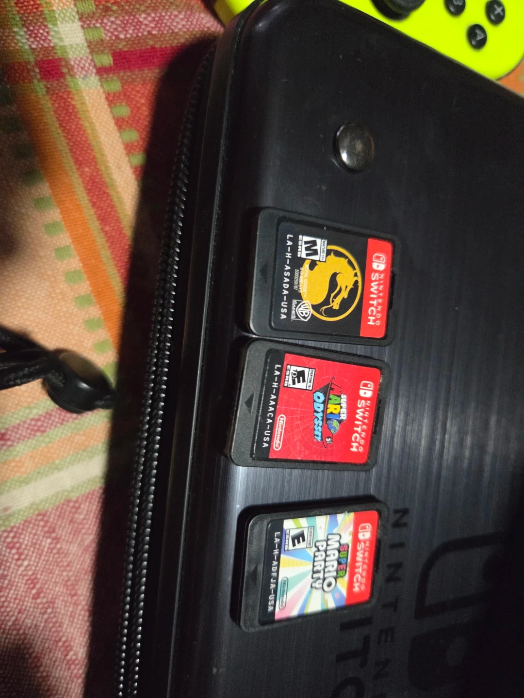Selling a Nintendo Switch console bundle! Includes the console, dock, Joy-Cons, a Pro Controller, and a carrying case. Also comes with three games: Mortal Kombat, Super Mario Odyssey, and Super Mario Party