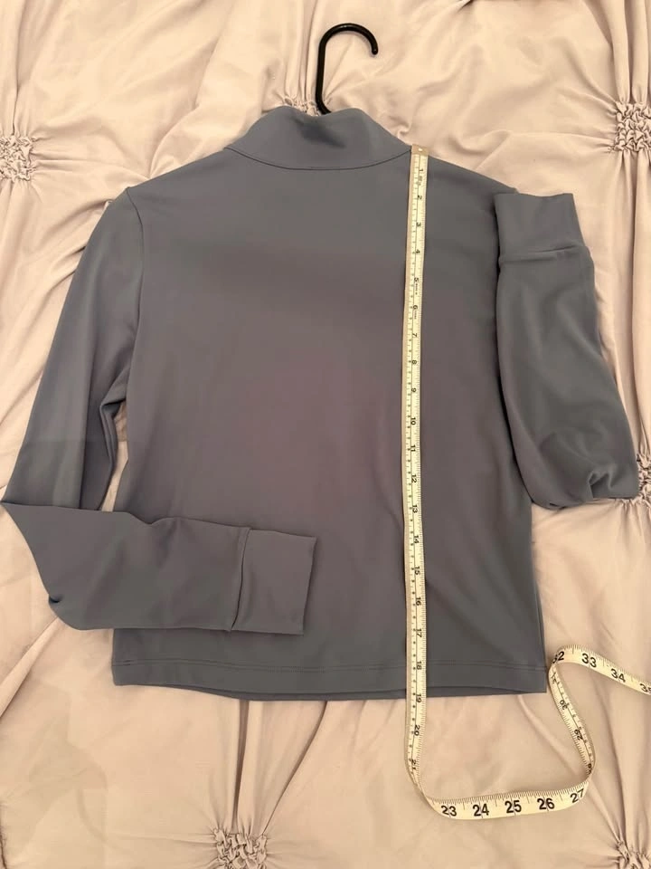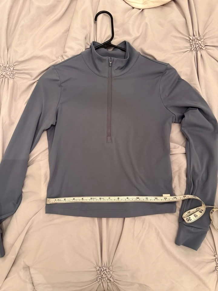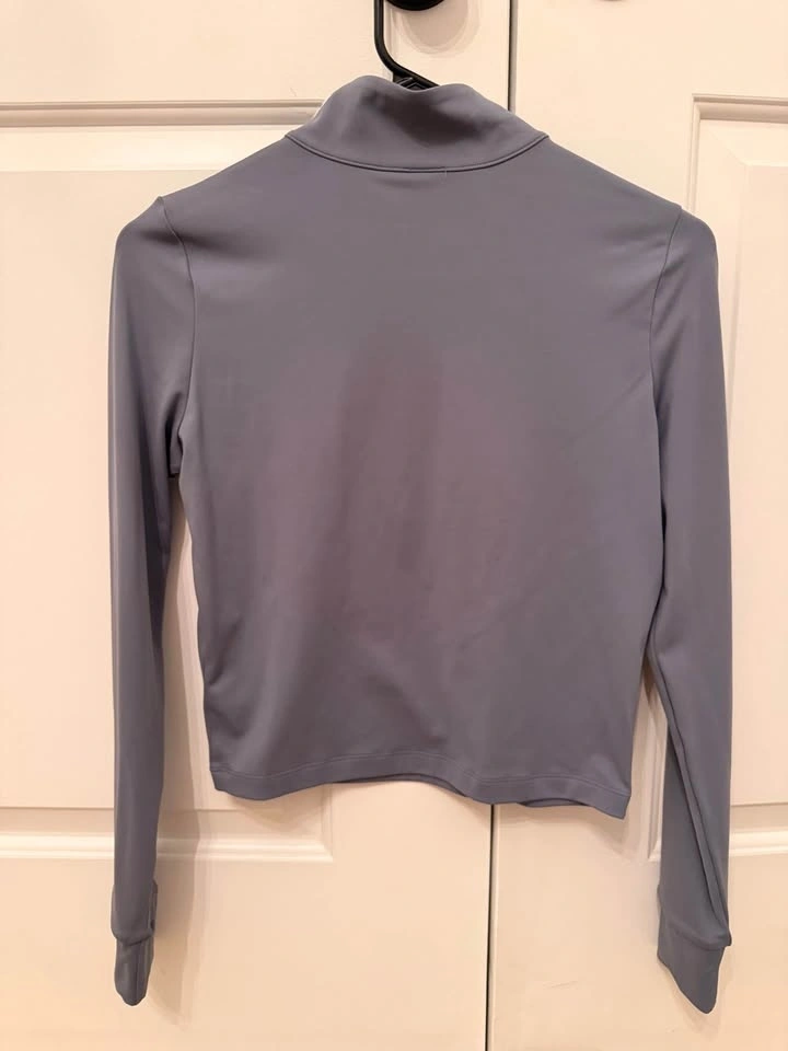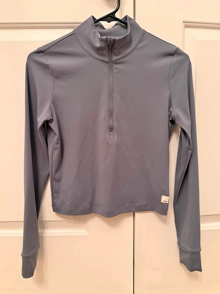 Vuori women’s cropped half-zip pullover in a sleek slate/blue-gray shade. Soft, smooth and stretchy with a stand collar, quarter/half zip front, and a clean minimalist look—perfect for workouts, tennis, hiking, or everyday athleisure. Size S. Like new condition (5/5).