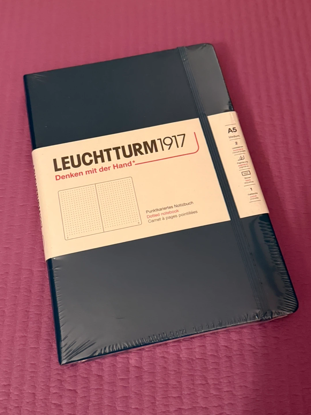 This is a Leuchtturm1917 A5 notebook. It's a dot grid notebook with 251 numbered pages and 80gsm paper. It includes a table of contents and pocket.