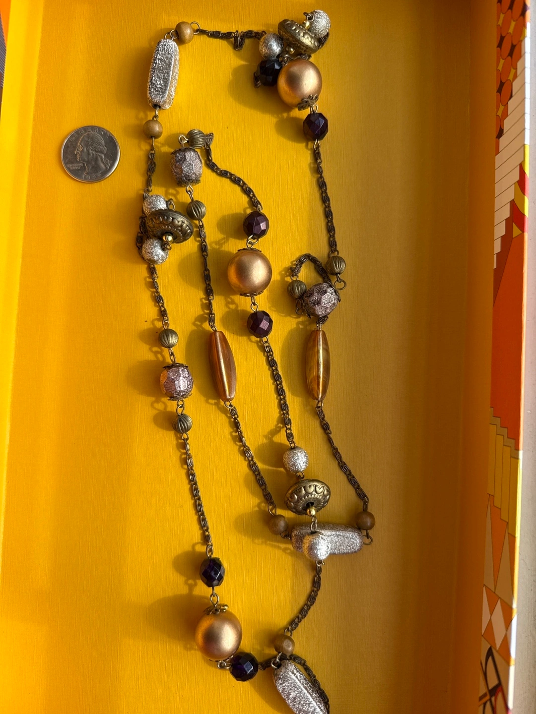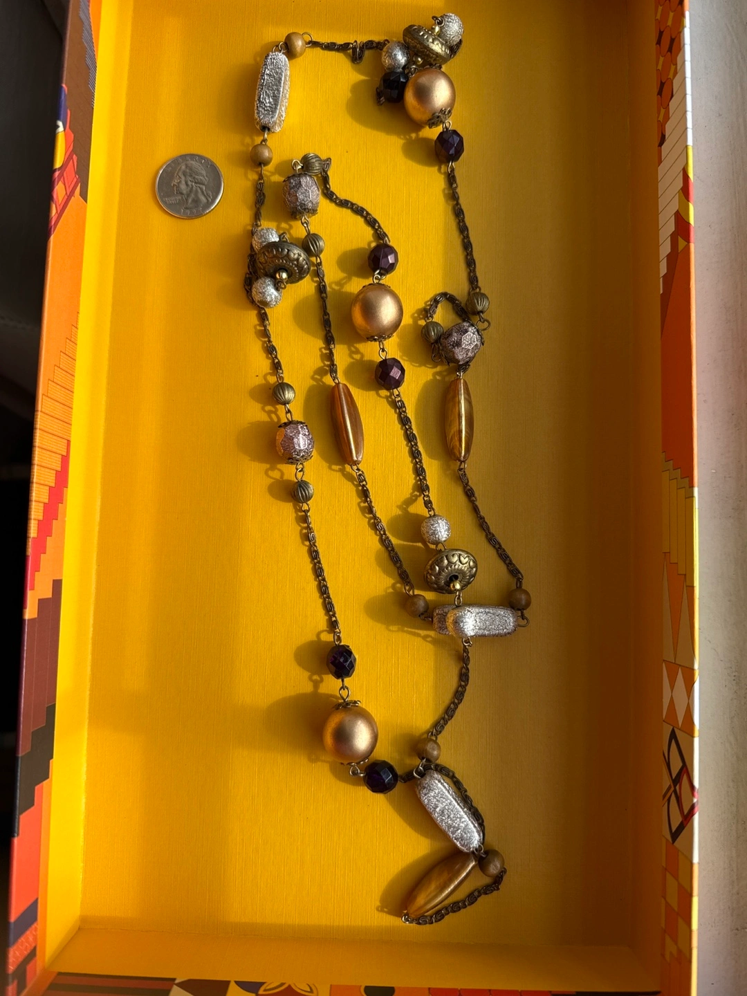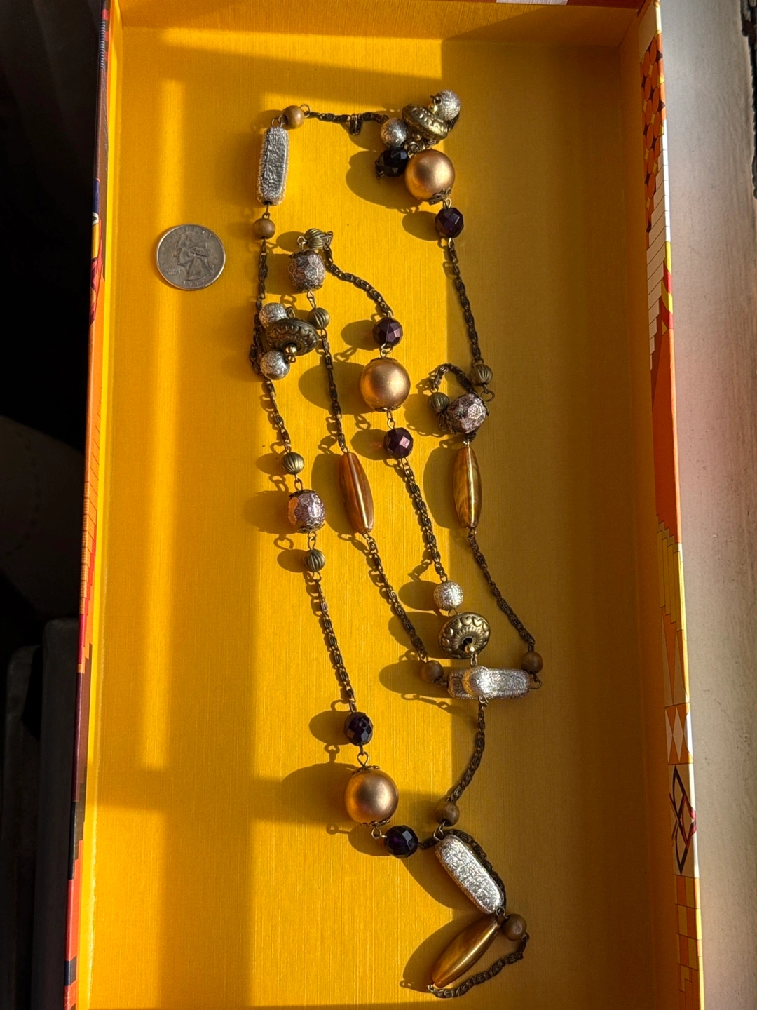 Selling a unique beaded necklace! It features a variety of shapes and colors, including gold, silver, and purple beads. This necklace is perfect for adding a touch of bohemian flair to any outfit