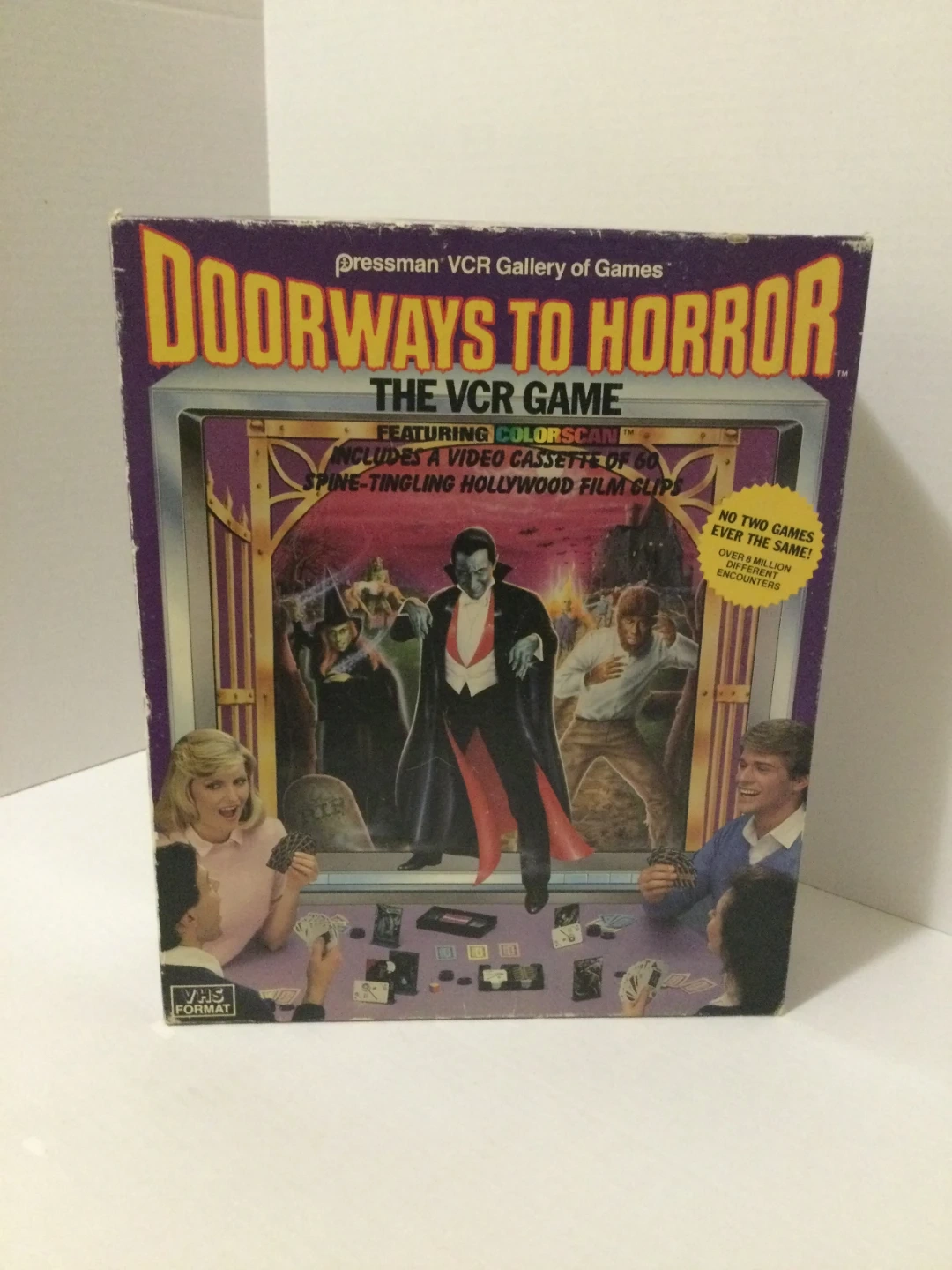 The following post is for a vintage, never used Vcr Board game "Doorways To Horror." Comes complete in original (though beat-up) box, with sealed tape, chips, cards, dice, money, faded instructions and everything else needed in a weathered broken plastic packaging. If this item isn't exactly what you're looking for, please check my other listings for similar alternatives. Its packed and ready to be shipped.