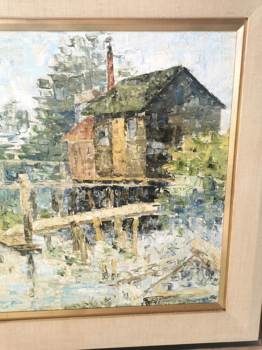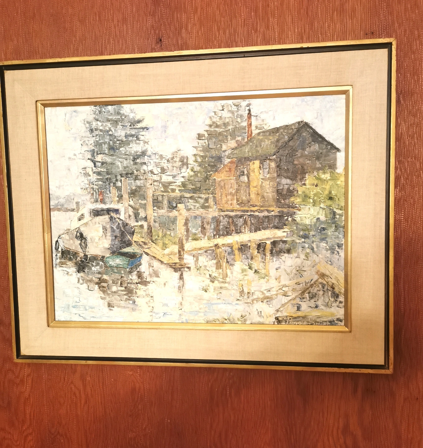 This original oil painting by Peggy Smith, created in 1974, depicts a waterfront living scene in a realistic style in New Brunswick Canada.