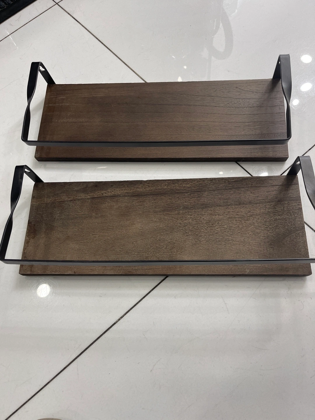Selling a set of two stylish brown wood shelves! They're perfect for adding a touch of rustic charm to any room. The shelves feature a sturdy construction and a sleek design that complements various decor styles. They're in great condition and ready to be mounted
