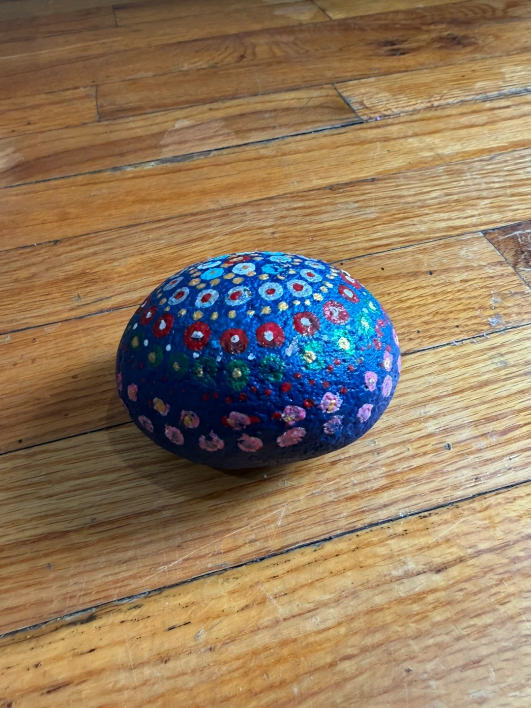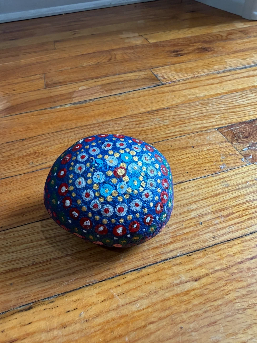 This is a unique, hand-painted rock with a vibrant blue base and colorful dotted patterns. It's been decorated with red, white, gold, and light blue circles and dots. It's smooth to the touch and has a glossy finish. It's roughly the size of a palm.