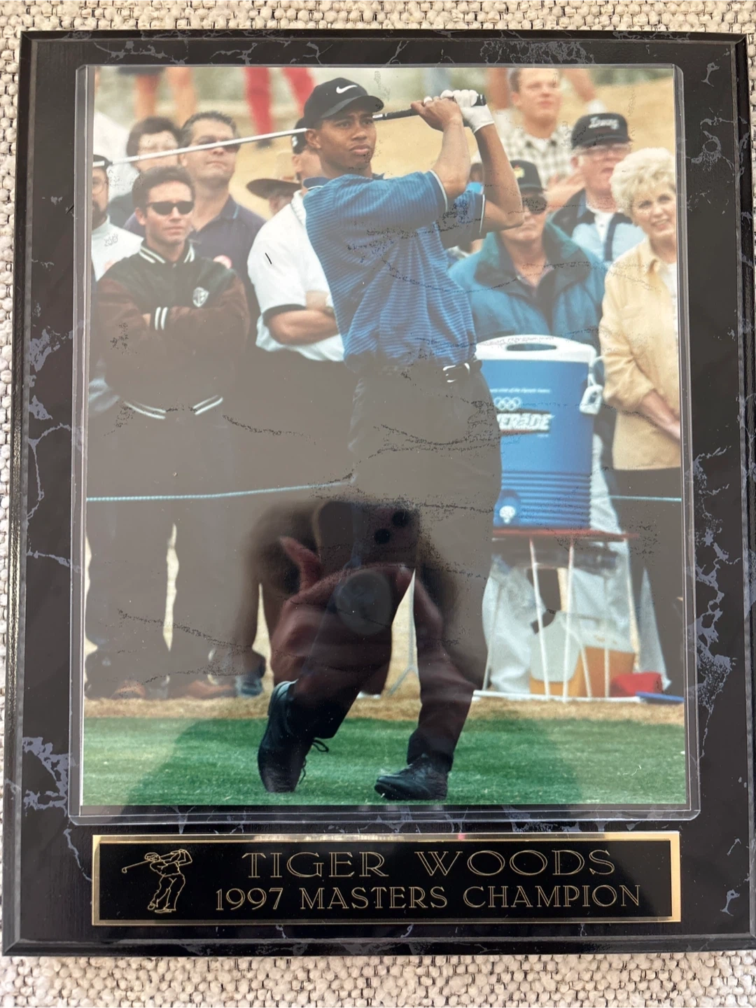 This is a framed photo commemorating Tiger Woods' 1997 Masters Championship win. The plaque below the image reads 'Tiger Woods 1997 Masters Champion'. It's a great piece for any golf memorabilia collector!