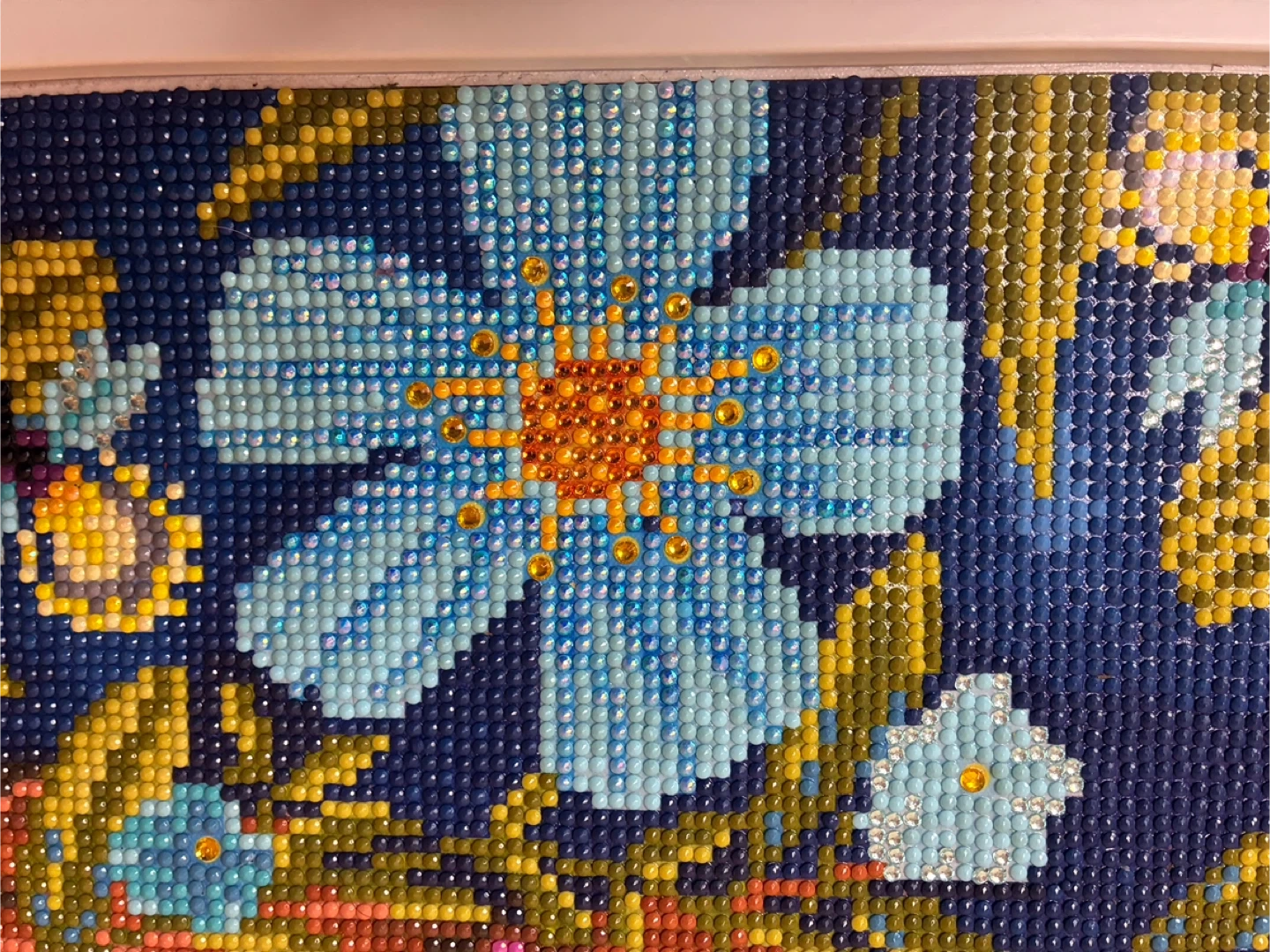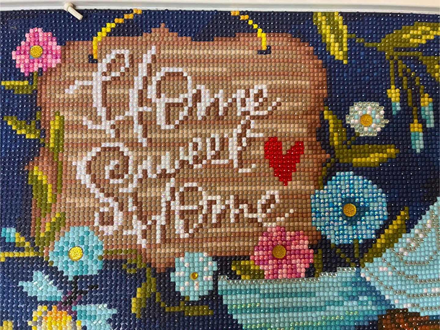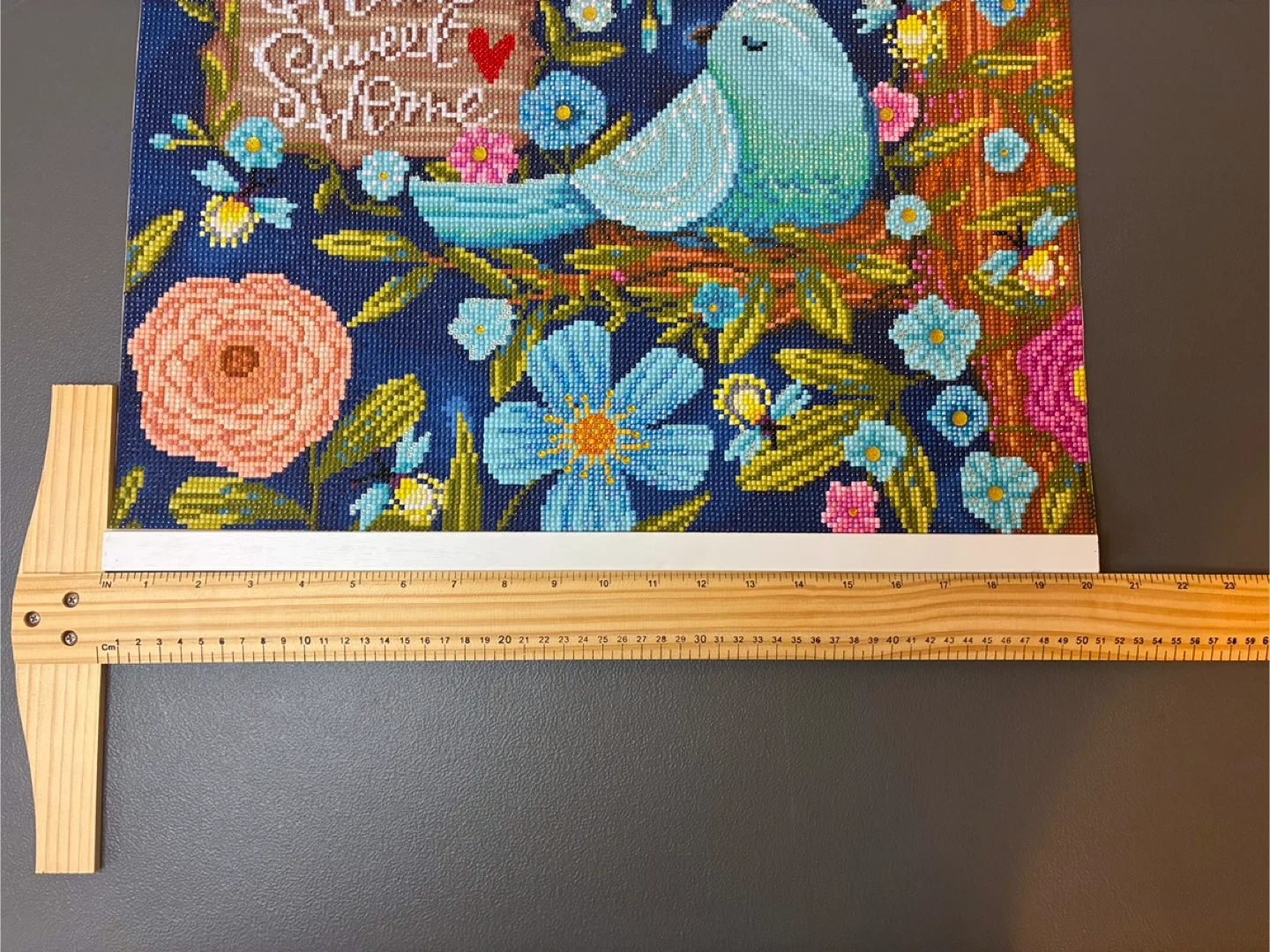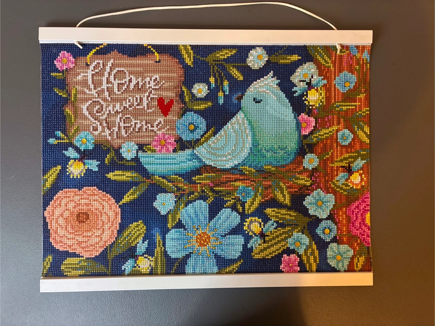 This is a diamond painting featuring a bluebird and 'Home Sweet Home' text. The artwork's finished size is approximately 12x16 inches. It's a fun craft project for anyone who enjoys detailed artistic creations!