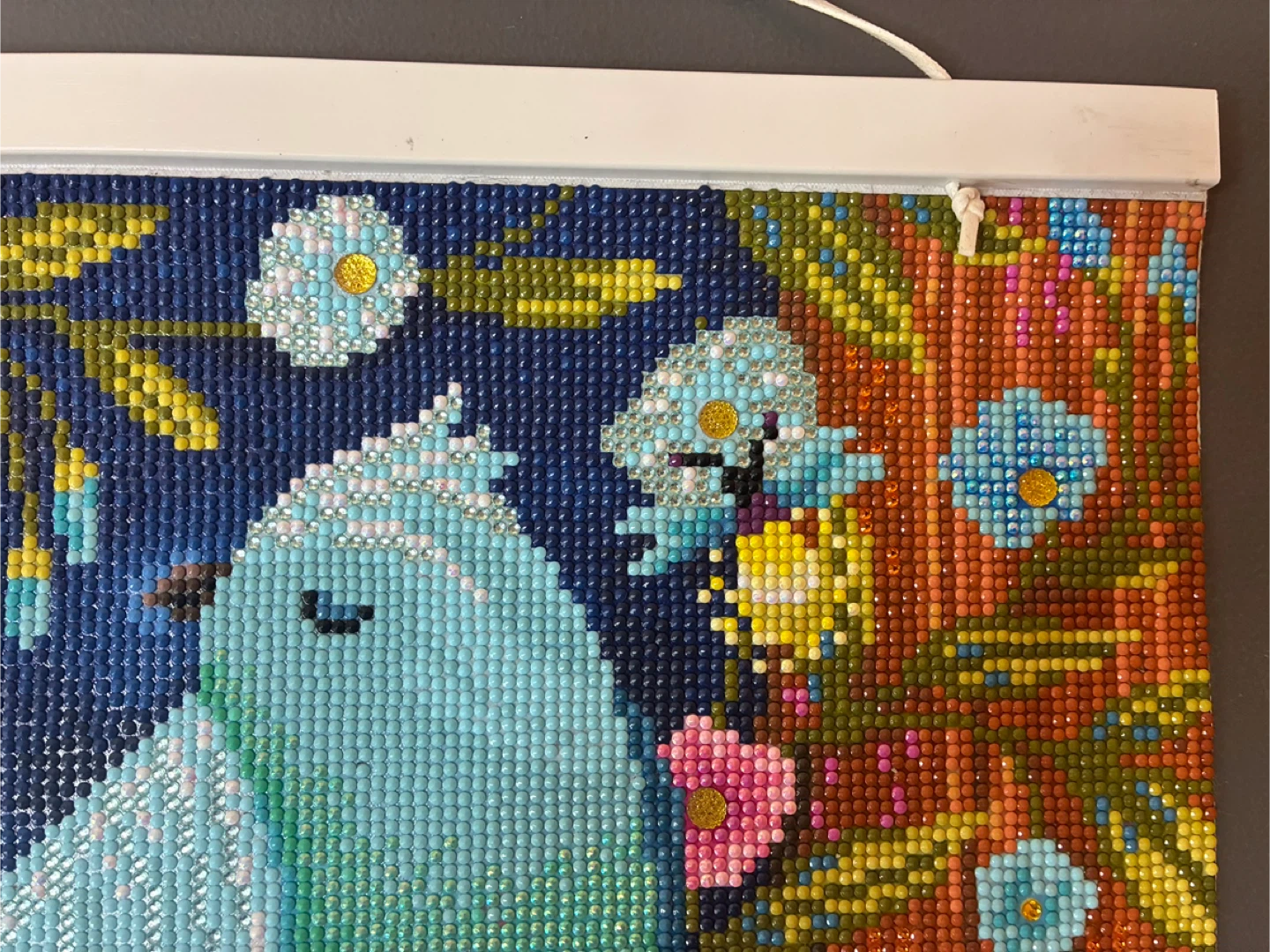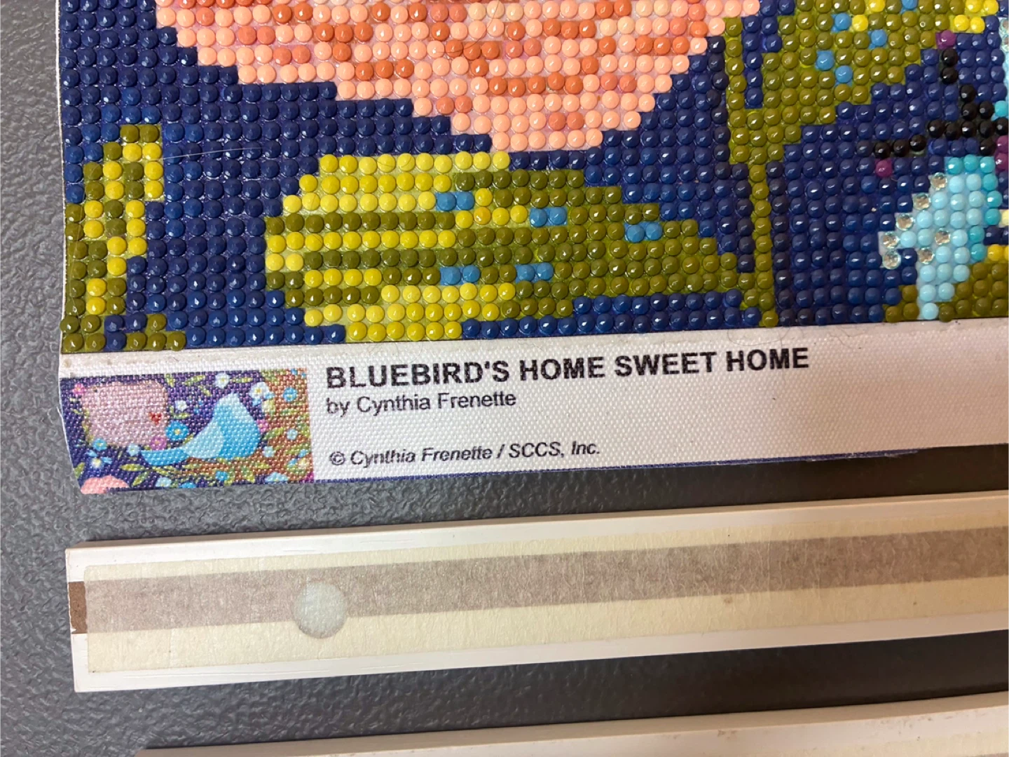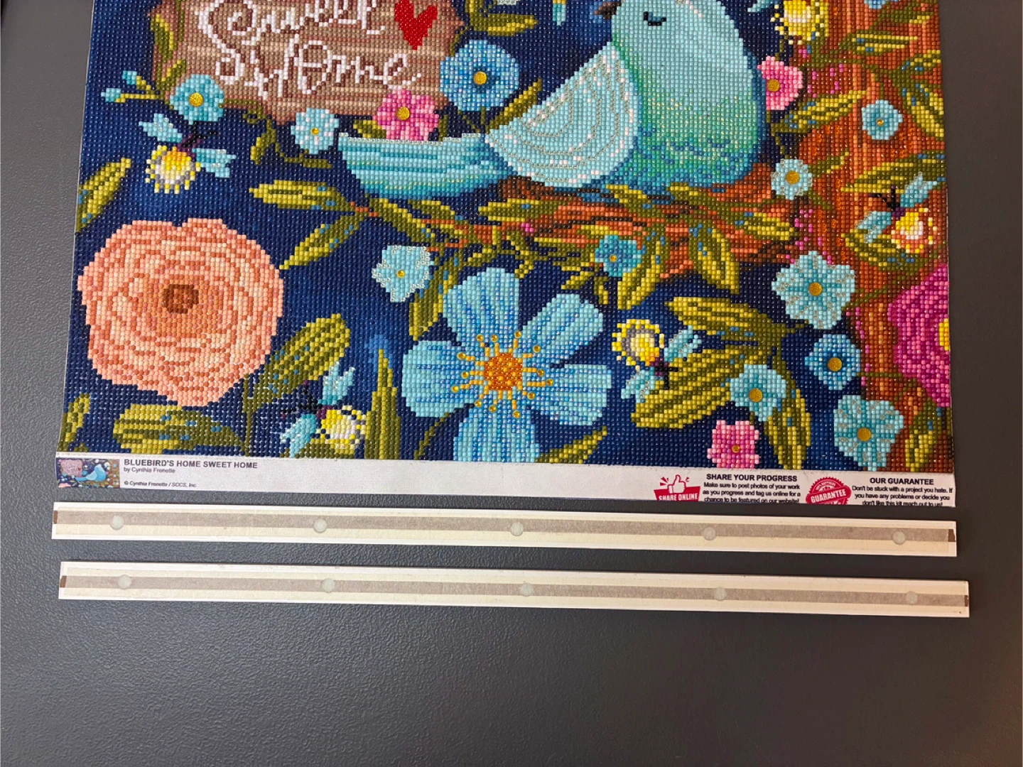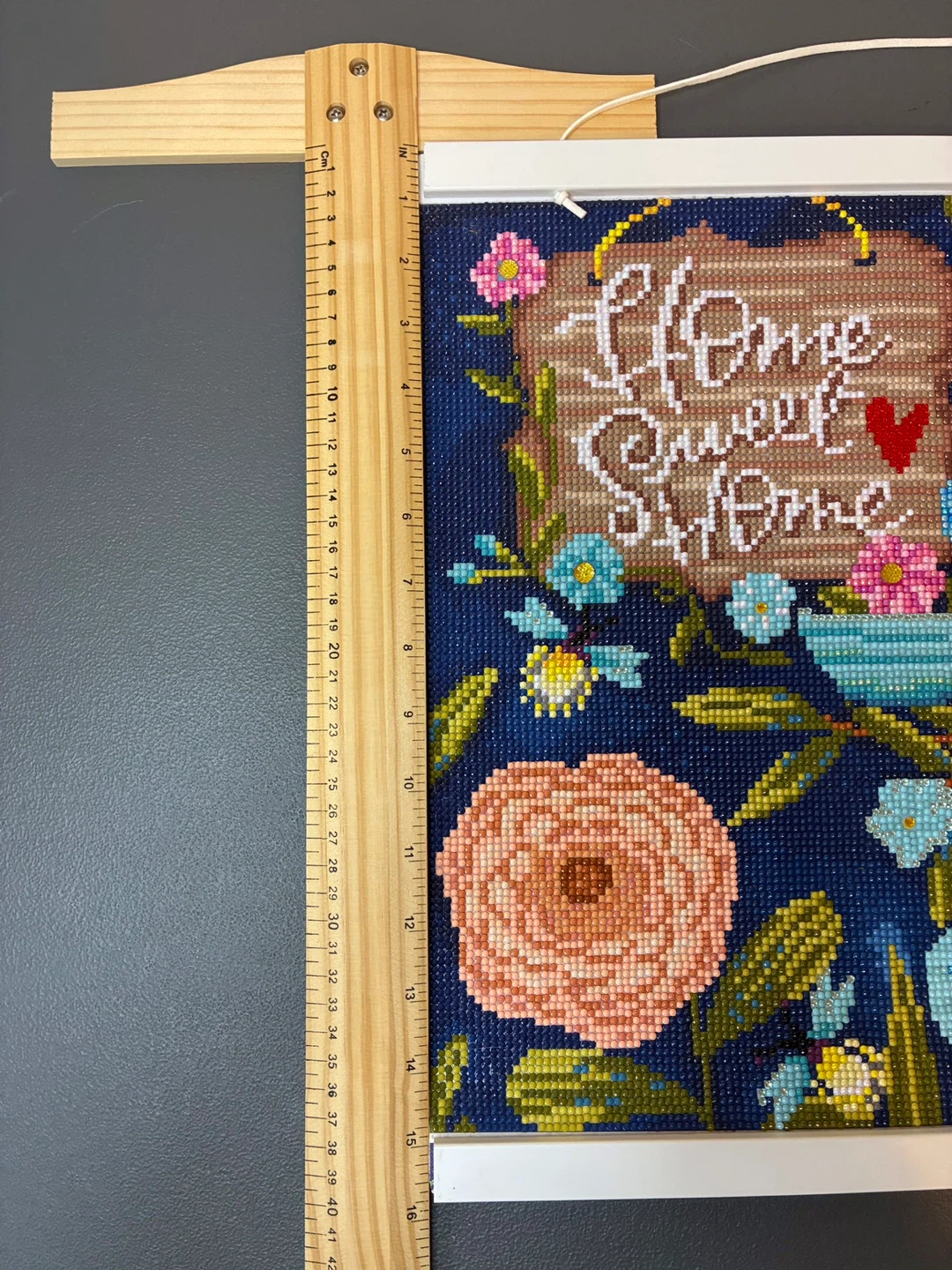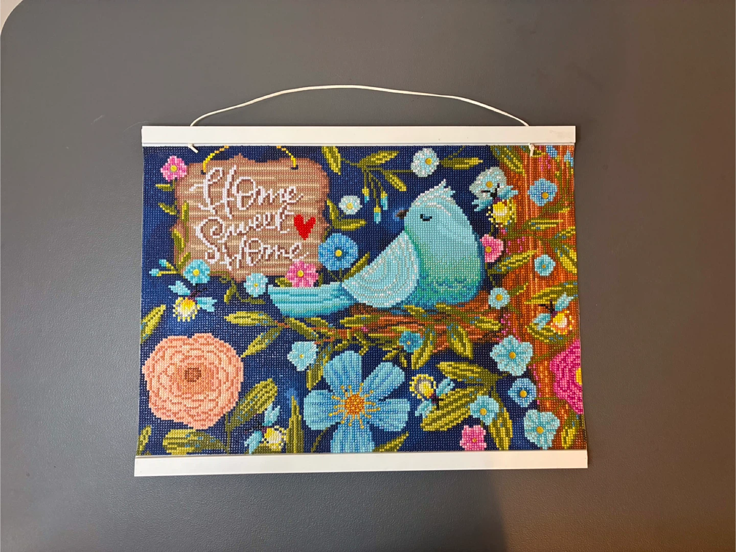 This is a diamond painting featuring a bluebird and 'Home Sweet Home' text. The artwork's finished size is approximately 12x16 inches. It's a fun craft project for anyone who enjoys detailed artistic creations!