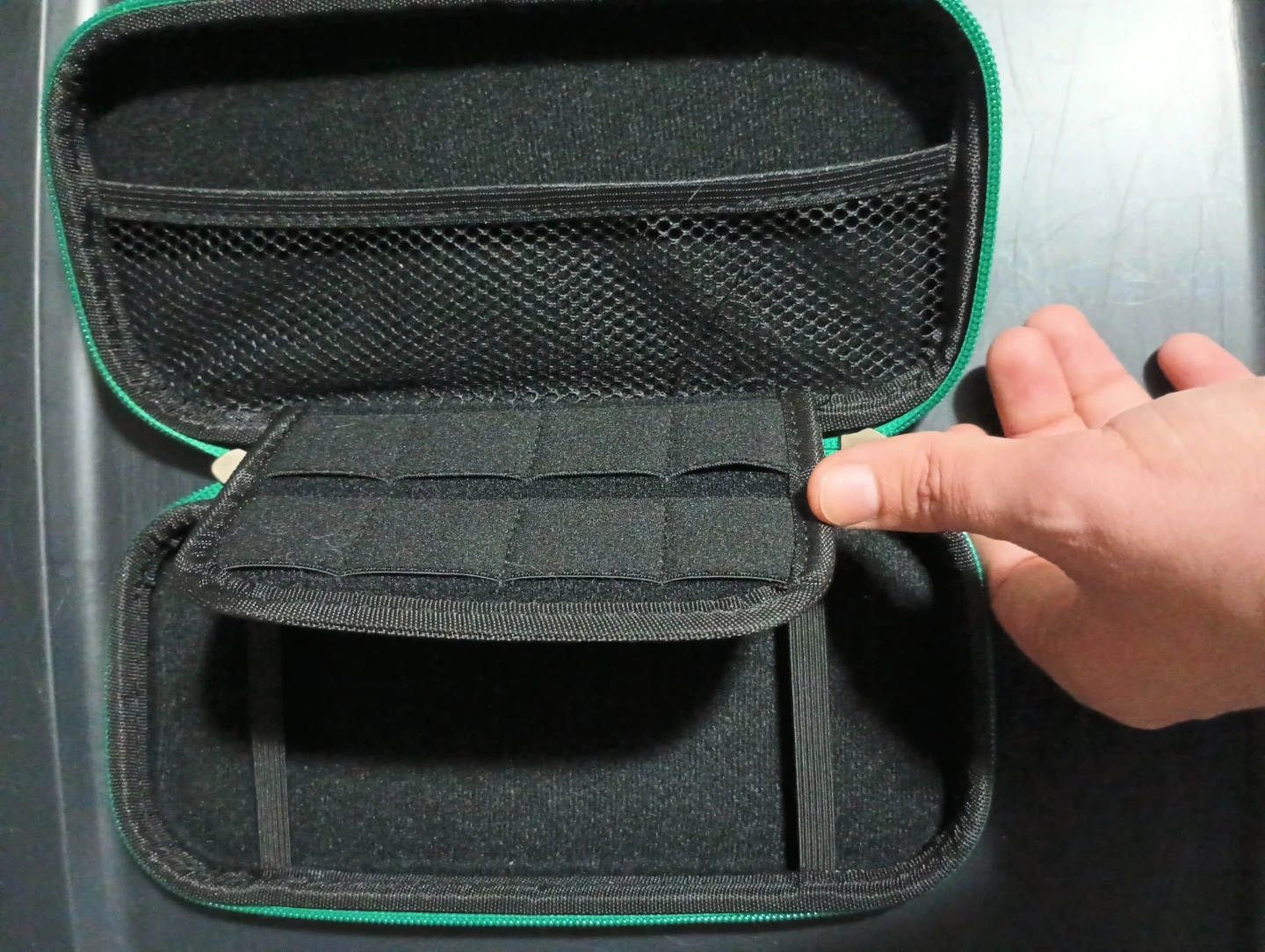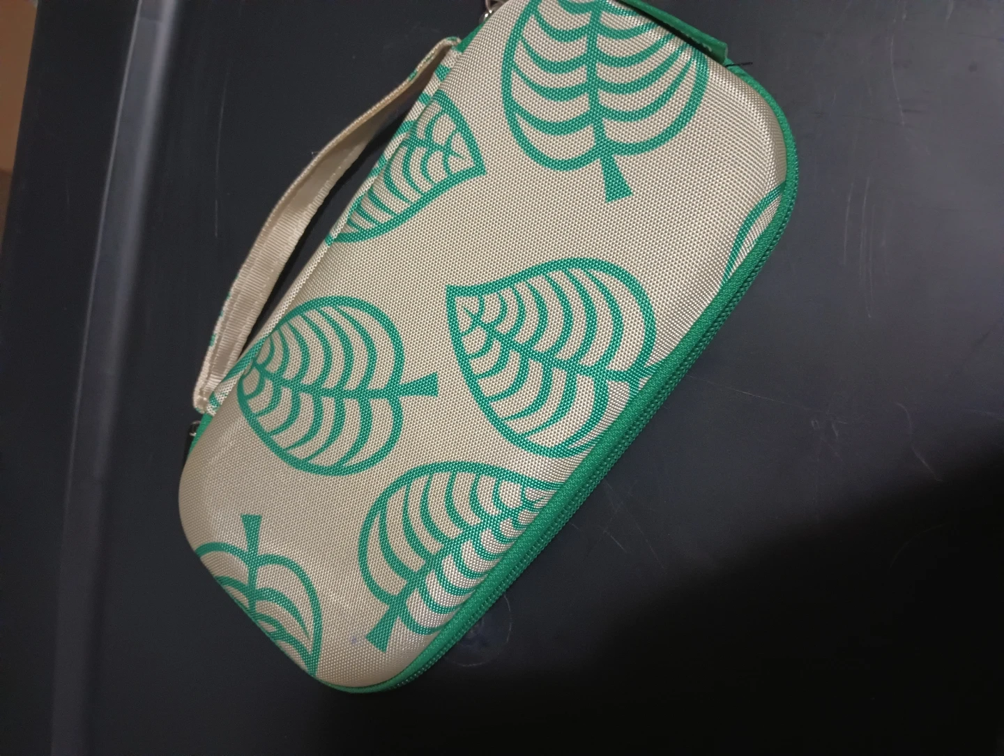 This case holds Nintendo Switch games and cartridges. It's designed with a distinctive leaf pattern and features a zippered closure for security. The interior has elastic straps and mesh pockets for organization.