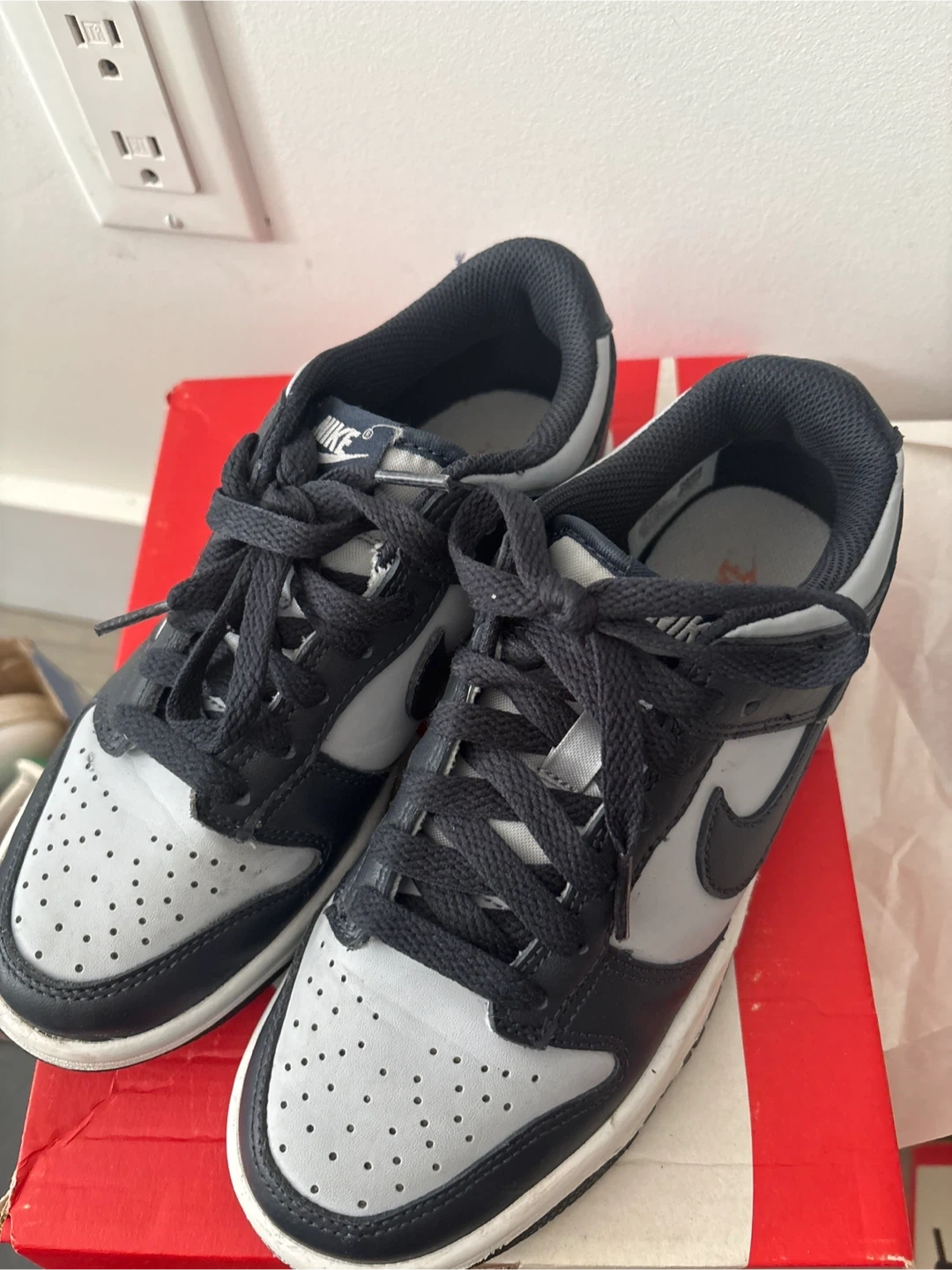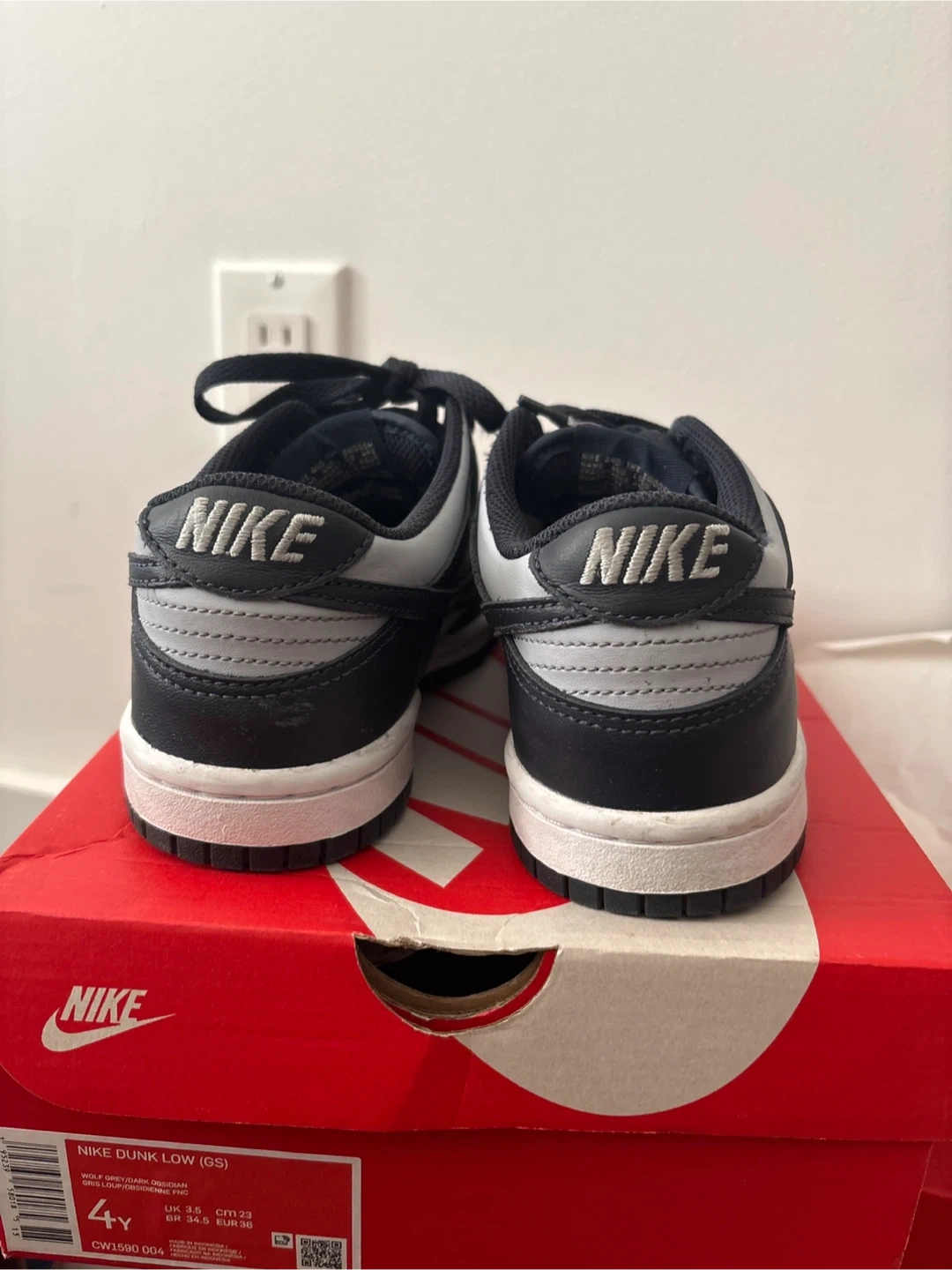These are Nike Dunk Low GS sneakers in a Wolf Grey, Black, and White colorway. They're designed with a durable leather upper and a rubber sole. Includes original box. Perfect for kids' everyday wear!