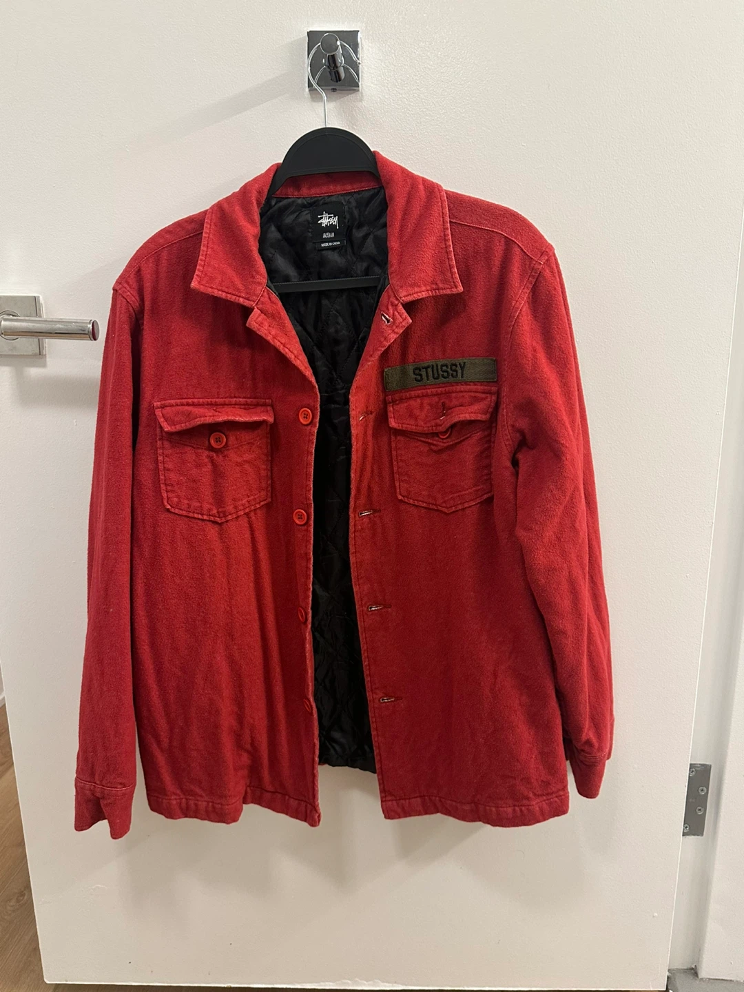 This is a red Stussy shirt jacket with a quilted black lining. It features two chest pockets and button closures. The material feels soft and warm, perfect for cooler weather. Can iron it before pickup!