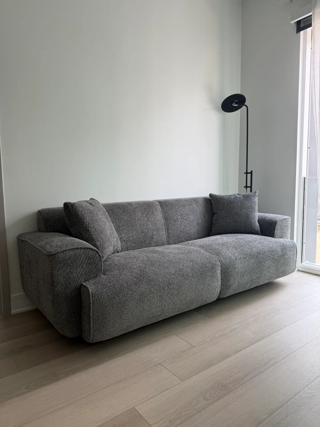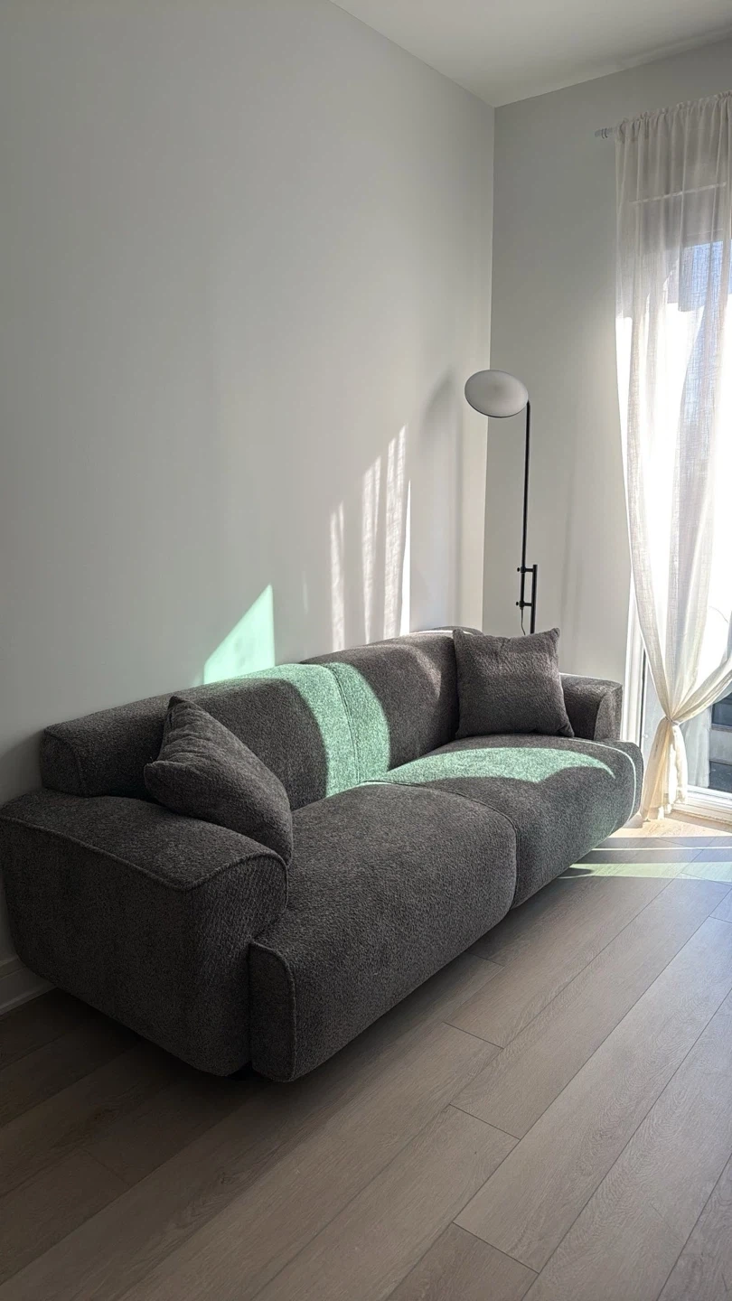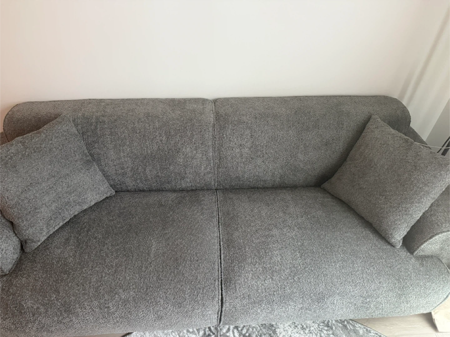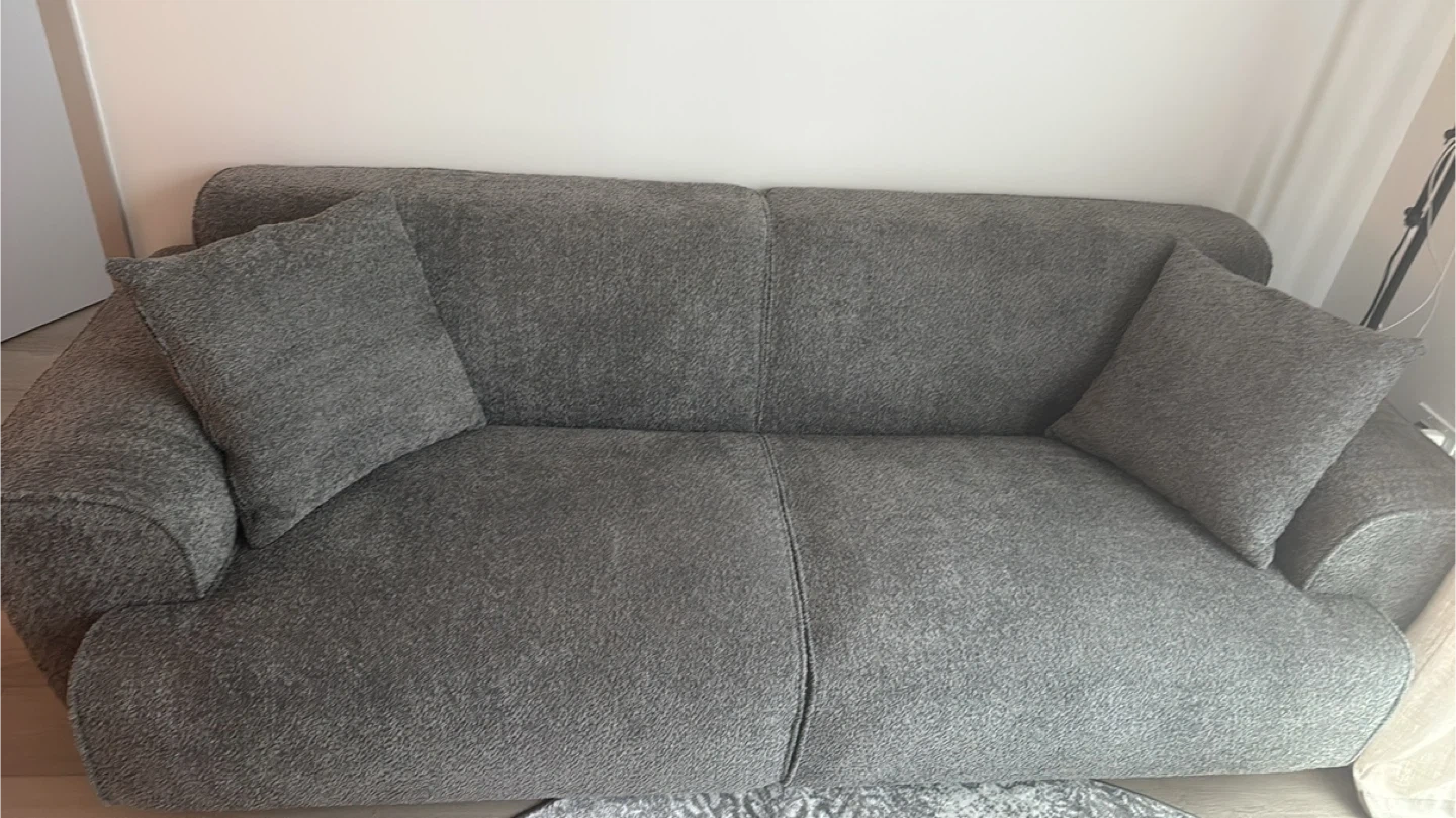 Modern gray sofa featuring a textured fabric. It includes two matching throw pillows for added comfort. This sofa's clean lines make it a versatile addition to any living space.