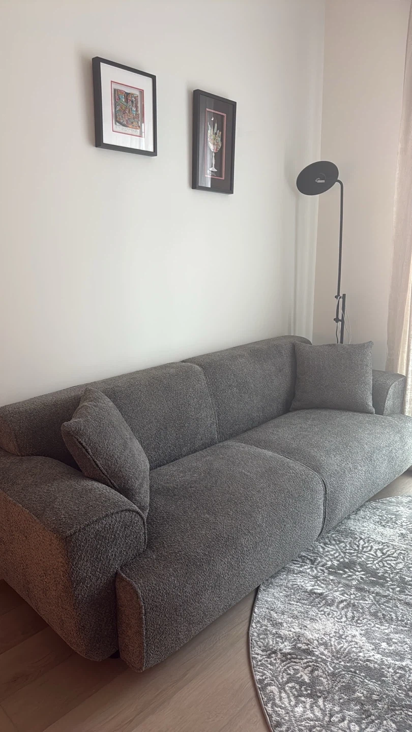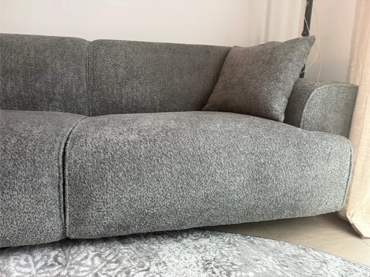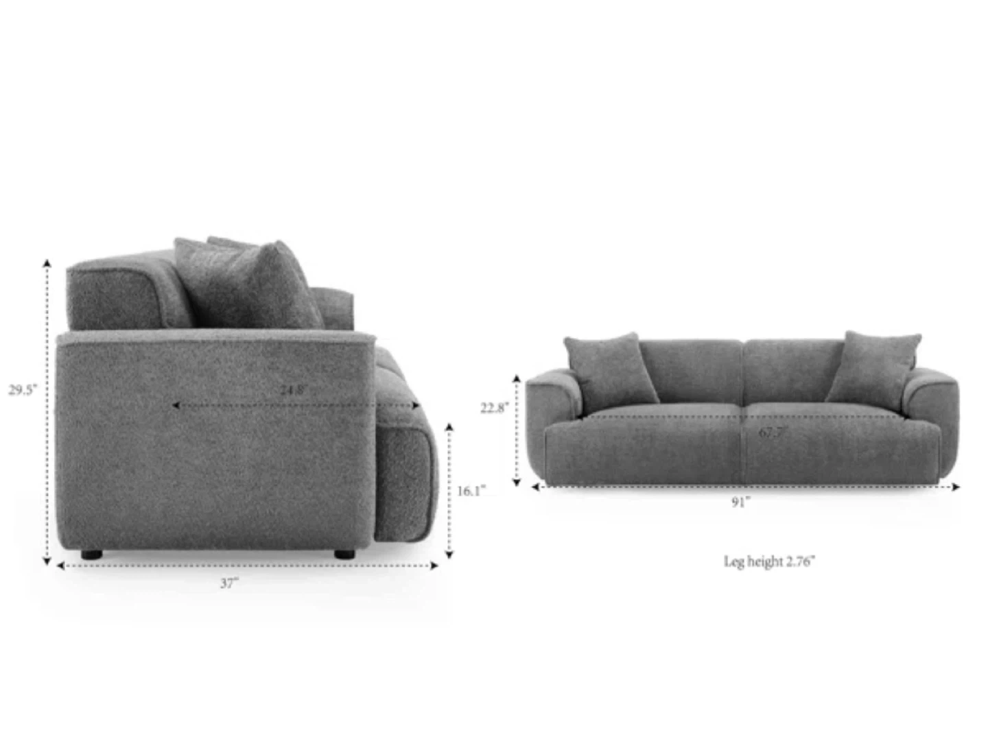 Modern gray sofa featuring a textured fabric. It includes two matching throw pillows for added comfort. This sofa's clean lines make it a versatile addition to any living space.