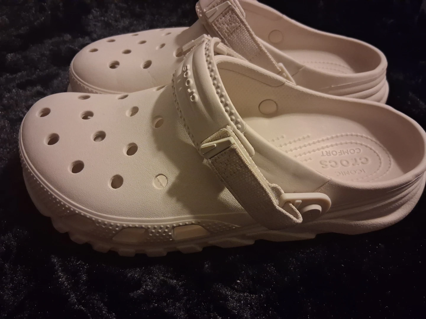 Crocs Classic All-Terrain Clogs in a light cream color. These clogs feature the iconic Crocs comfort with a rugged sole for added traction. Includes an adjustable strap for a secure fit.