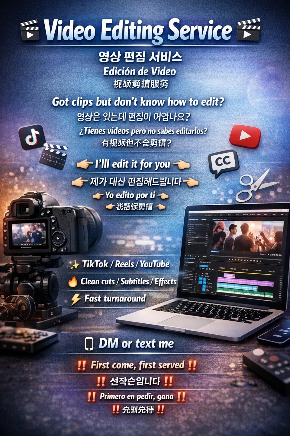 Need video editing for your TikTok, Reels, or YouTube content? I offer clean cuts, subtitles, and effects with fast turnaround. DM or text me to get started! First come, first served.