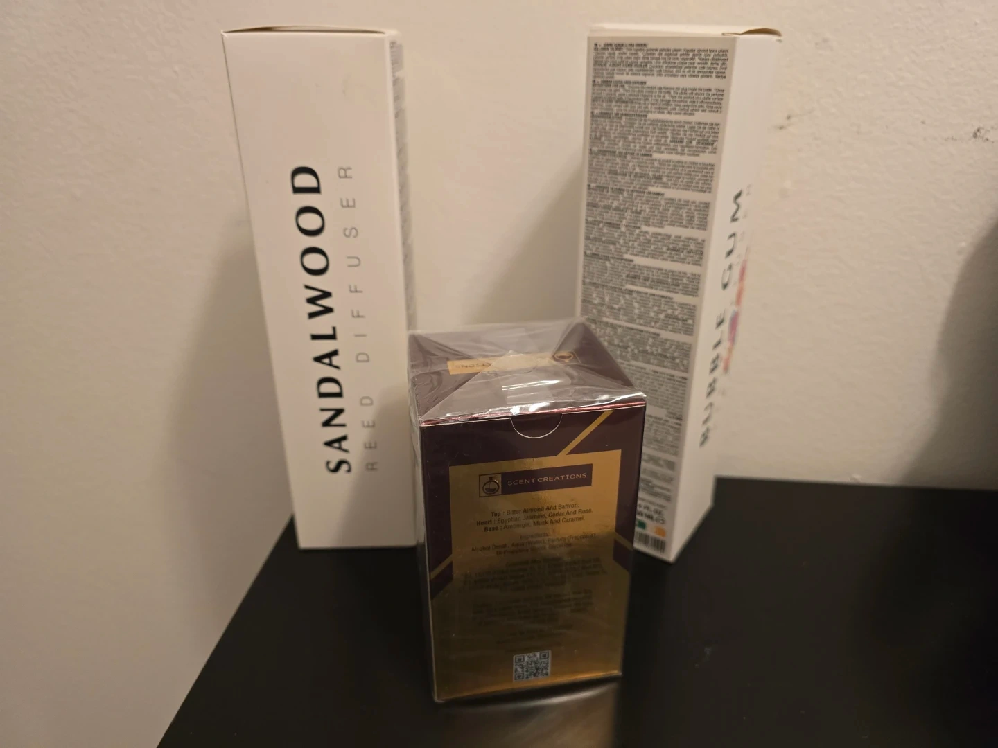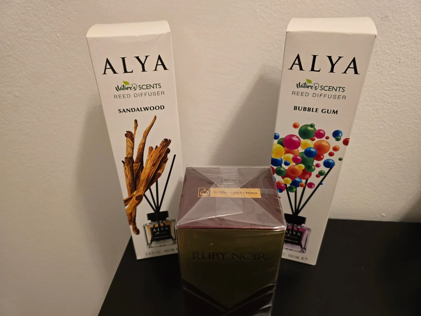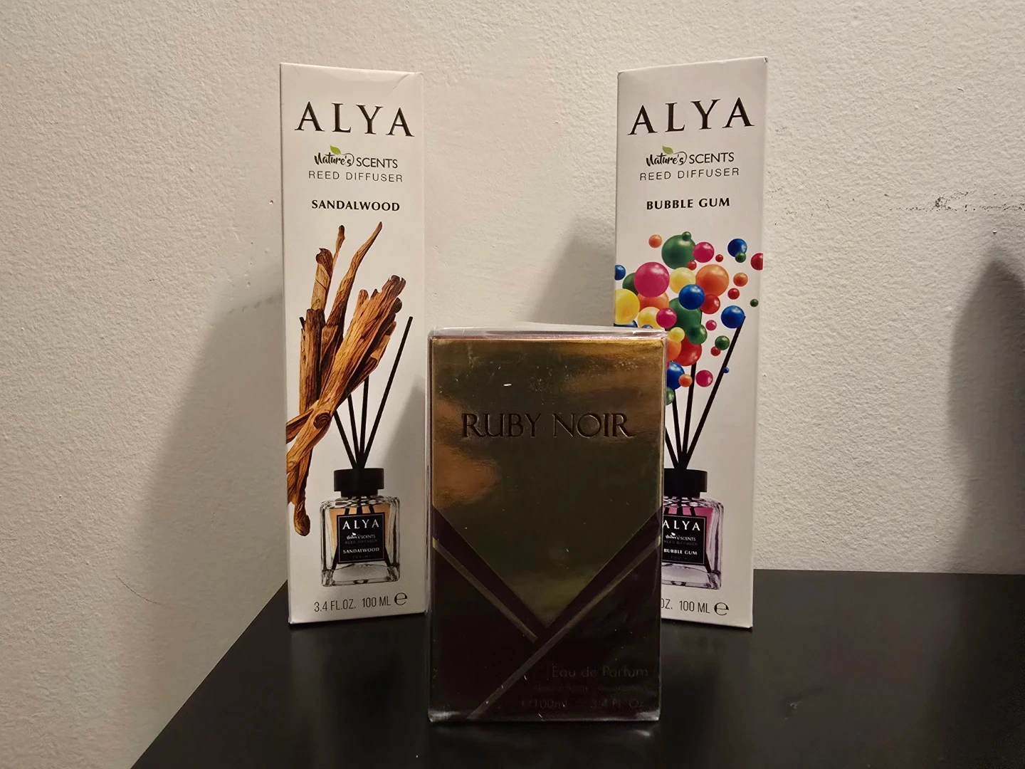 This set includes two Alya reed diffusers in Sandalwood and Bubble Gum scents, each 3.4 fl oz (100 ml). Also included is a sealed Ruby Noir Eau de Parfum, 3.4 fl oz (100 ml). These items are perfect for home fragrance and personal scent.