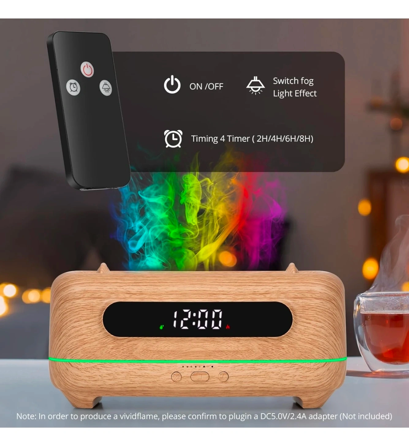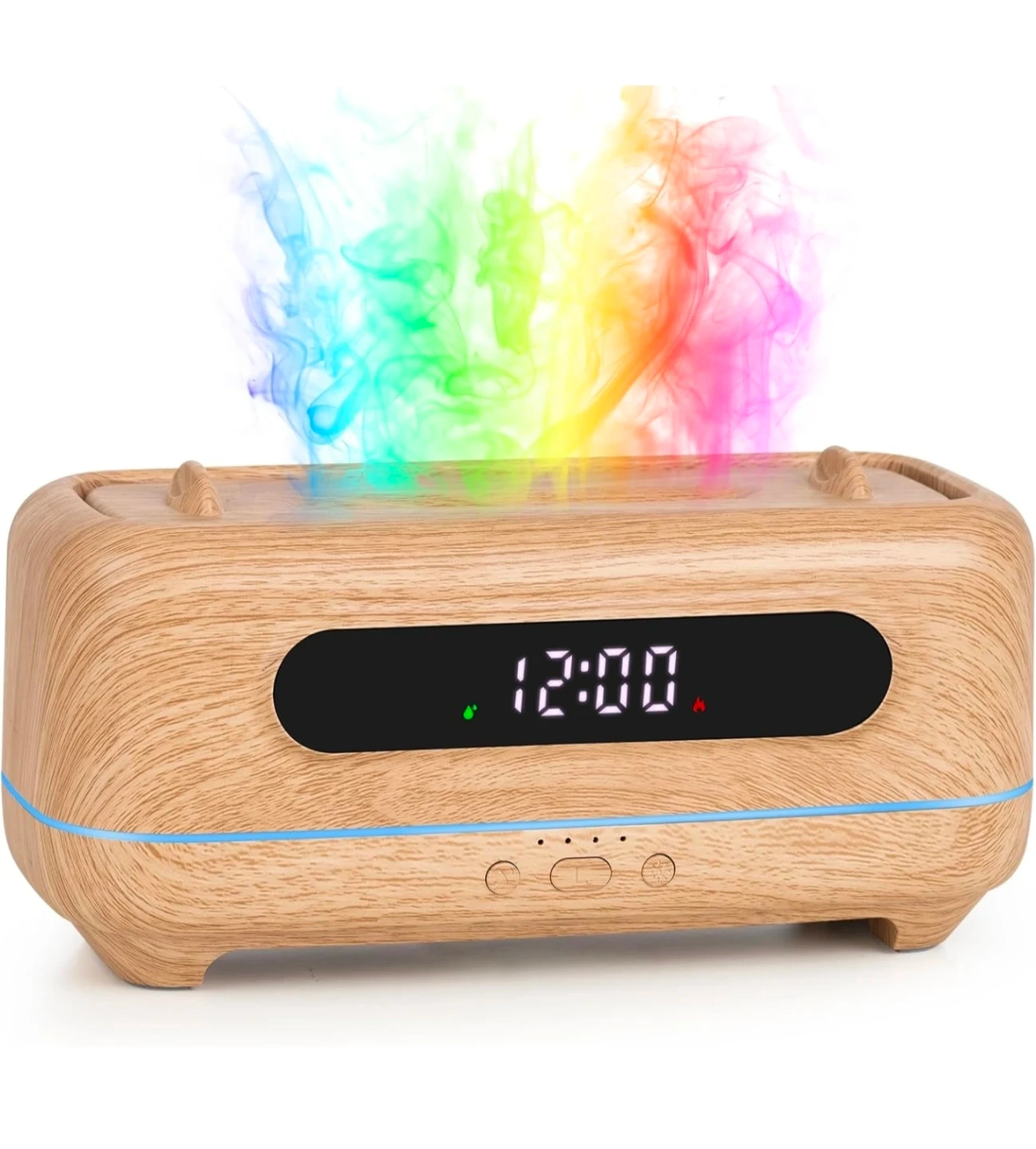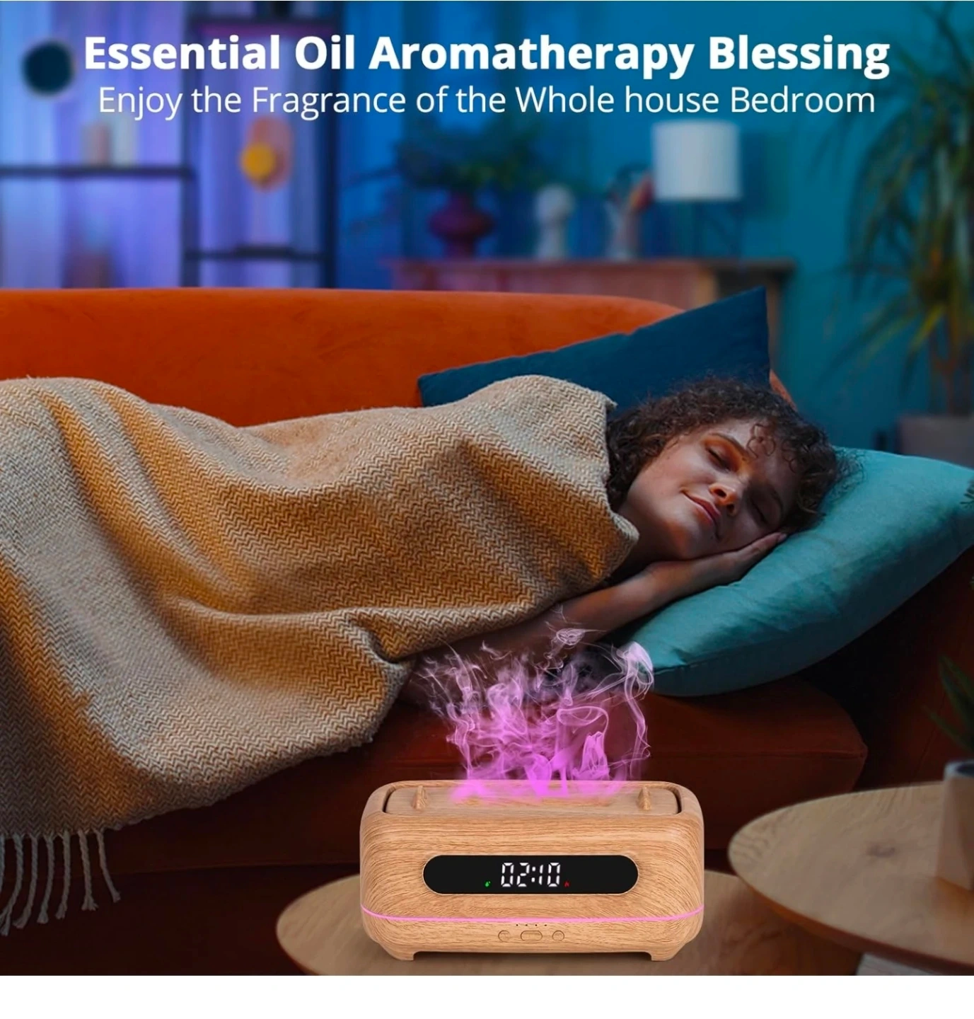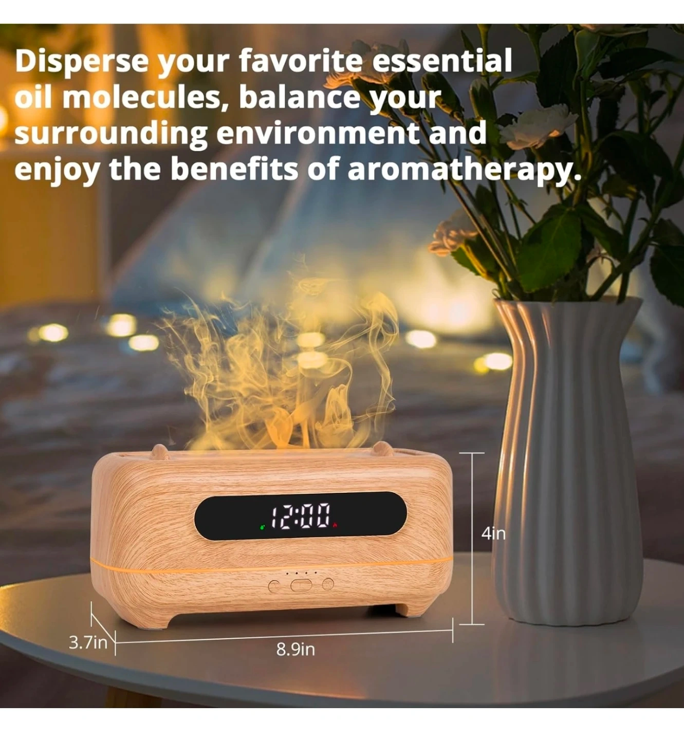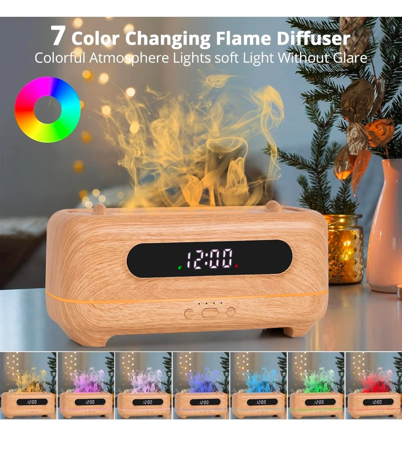 Flame Effect Aromatherapy Diffuser with Alarm Clock, 250ml Ultrasonic Essential Oil Humidifier, 4-Speed Timer, 7-Color Dimming, and Auto-Shutdown Home Fragrance (Wood Grain)