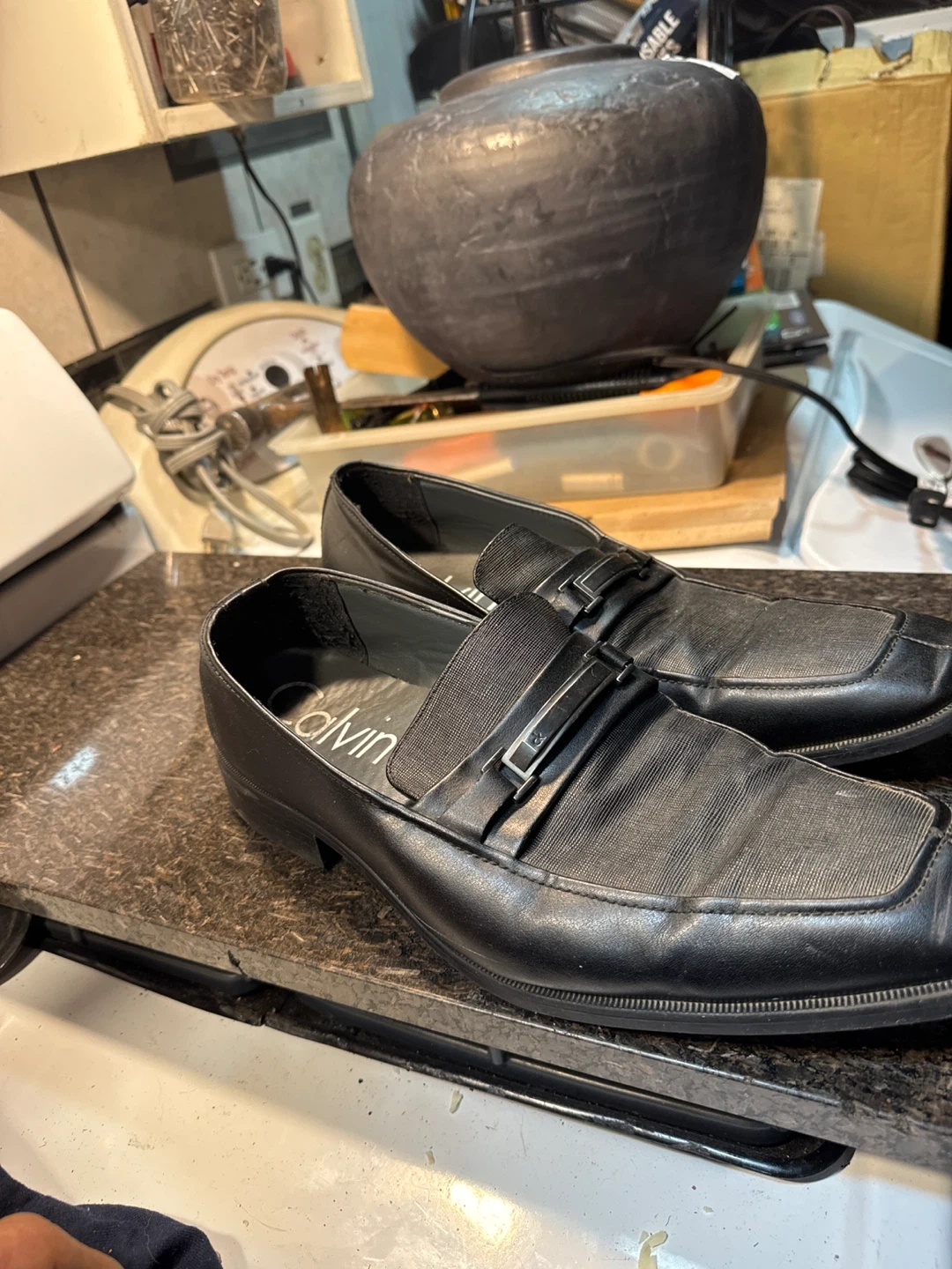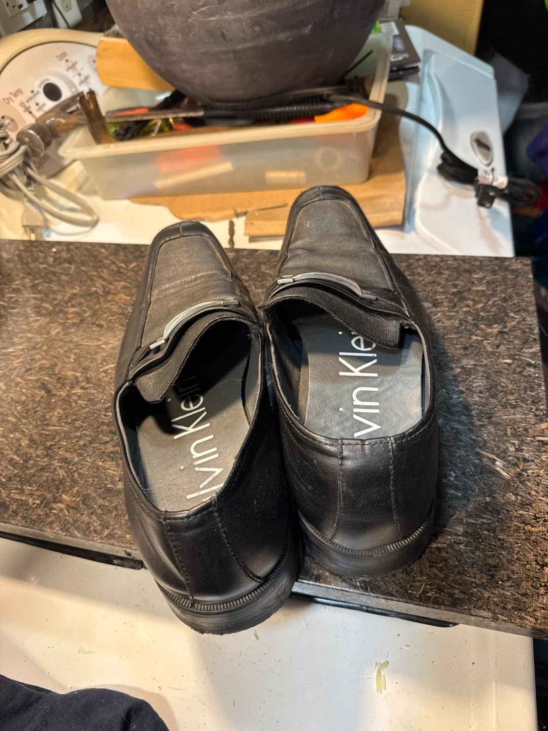 Men's black Calvin Klein Gino loafer shoes. These slip-on shoes have a faux leather upper with decorative buckle detail. Made with manmade materials. Size 10.