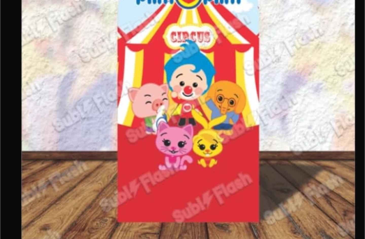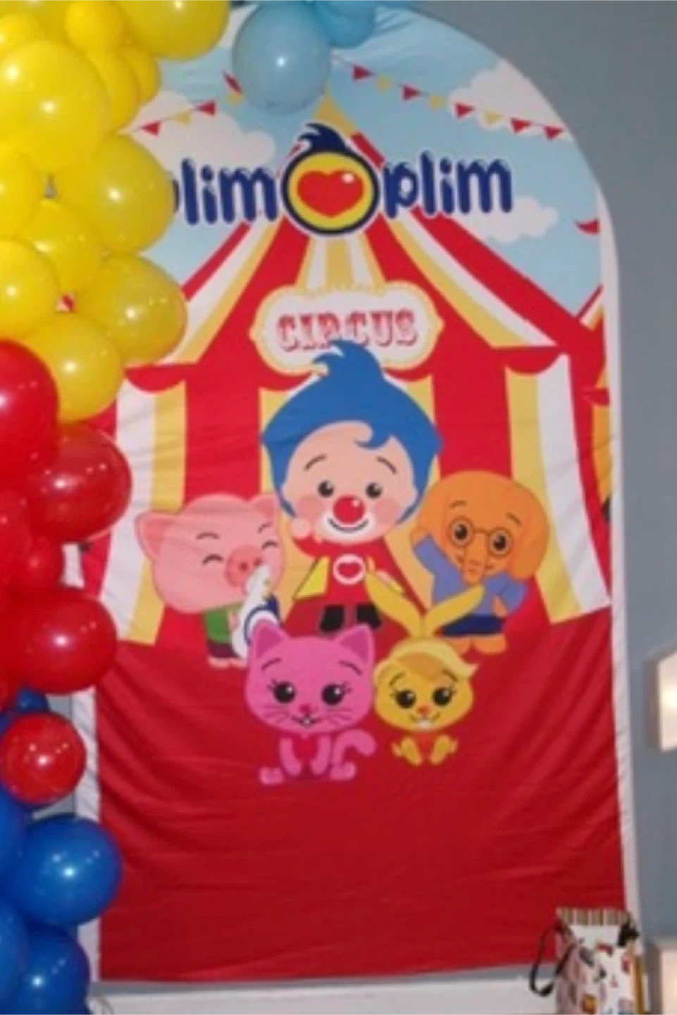 This Plim Plim circus-themed backdrop banner is perfect for a kid's birthday party! It features vibrant characters and a circus tent design. Great for creating a festive atmosphere!