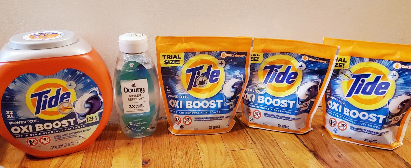 I have a 32 XL Tide Oxi Boost Power Pods container, three 9XL Tide Oxi Boost Power Pods, and a bottle of Downy Rinse & Refresh 25.5oz.