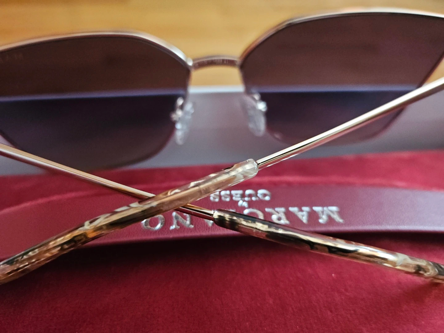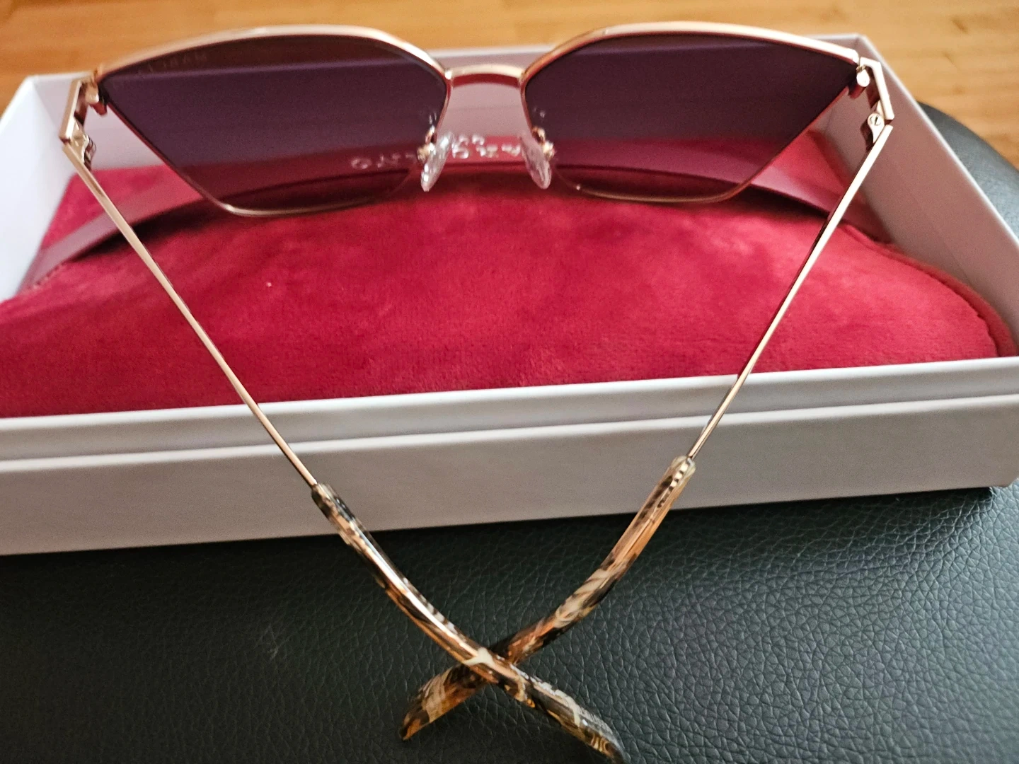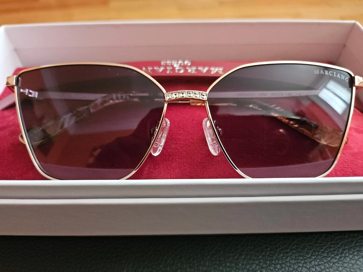 Stylish Guess Marciano cat-eye sunglasses. Features a rose gold metal frame with tortoise pattern on the temples. Comes in original box with a protective pouch.