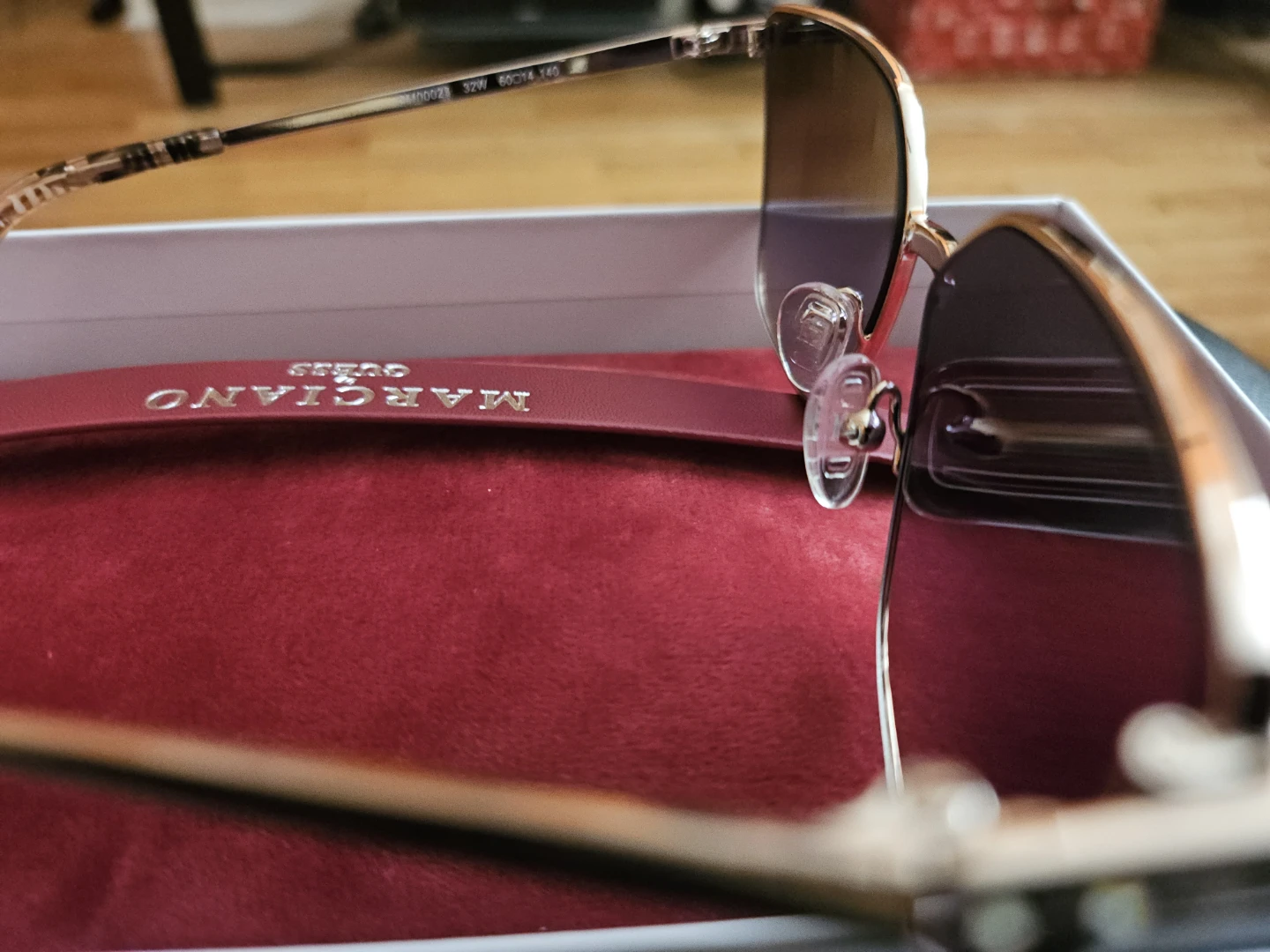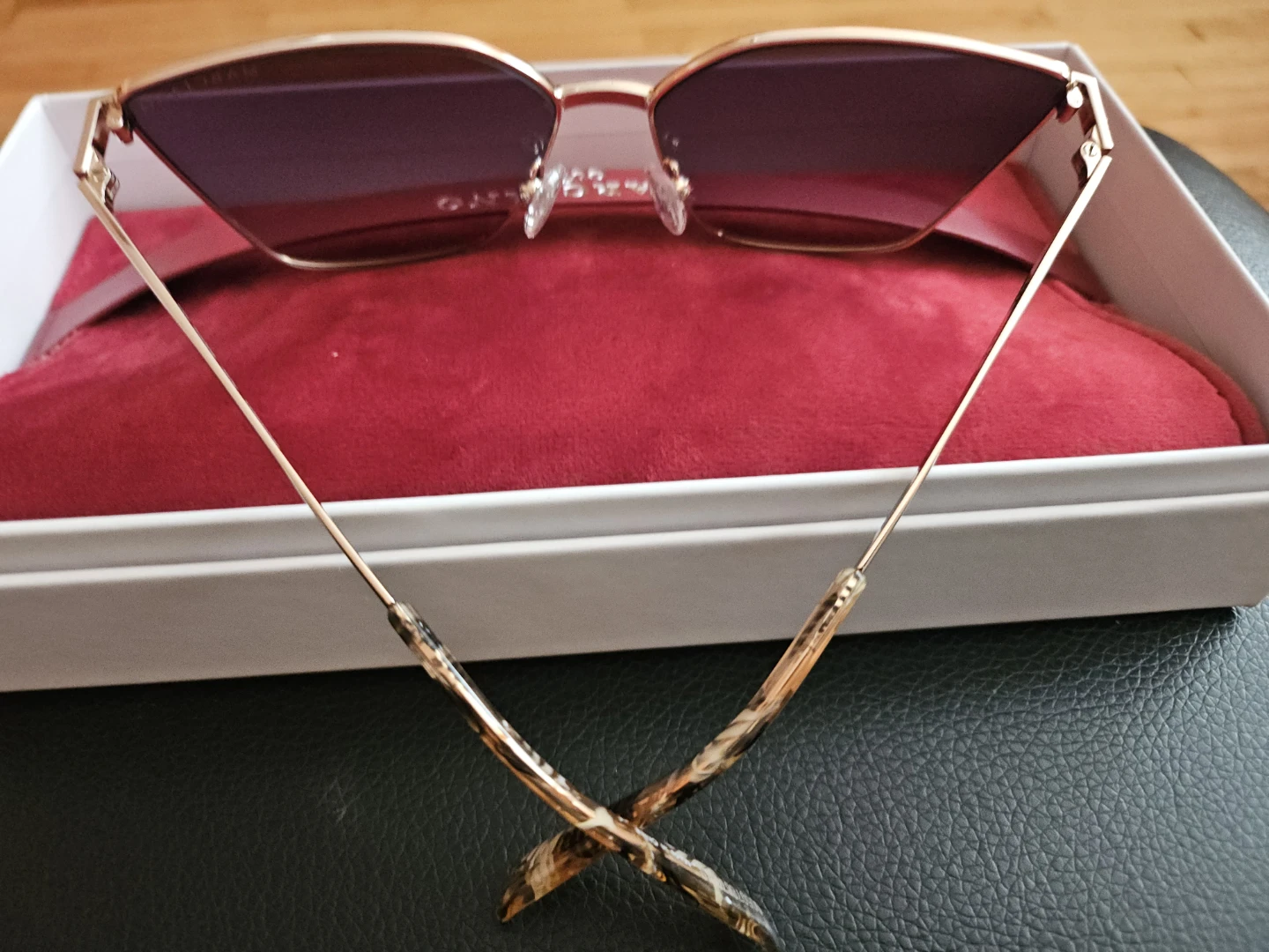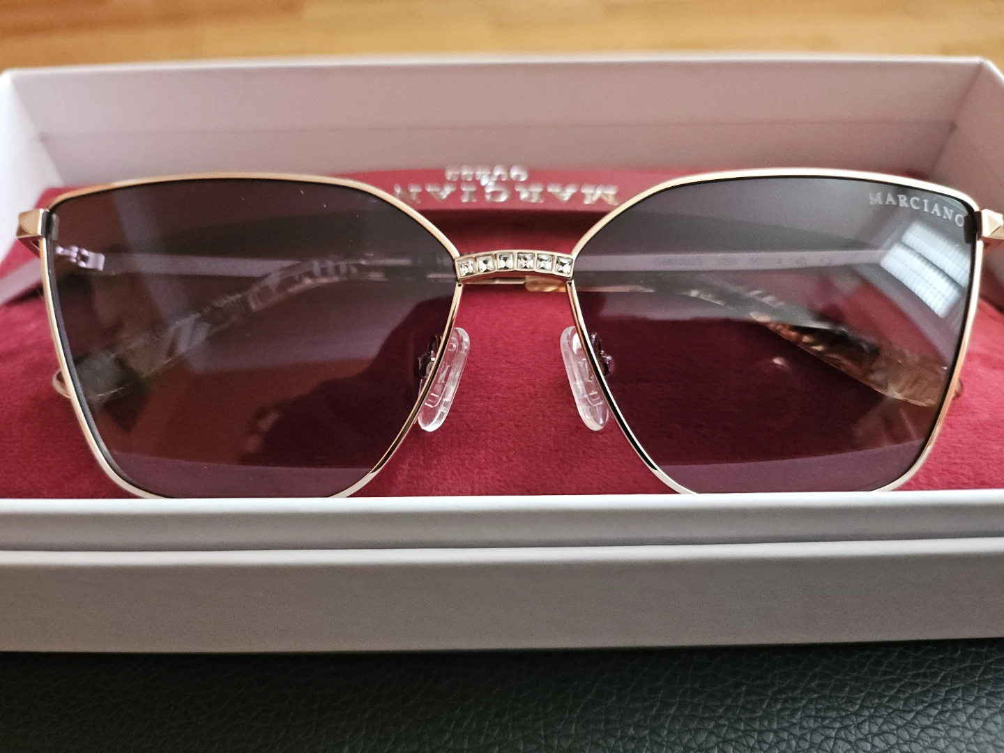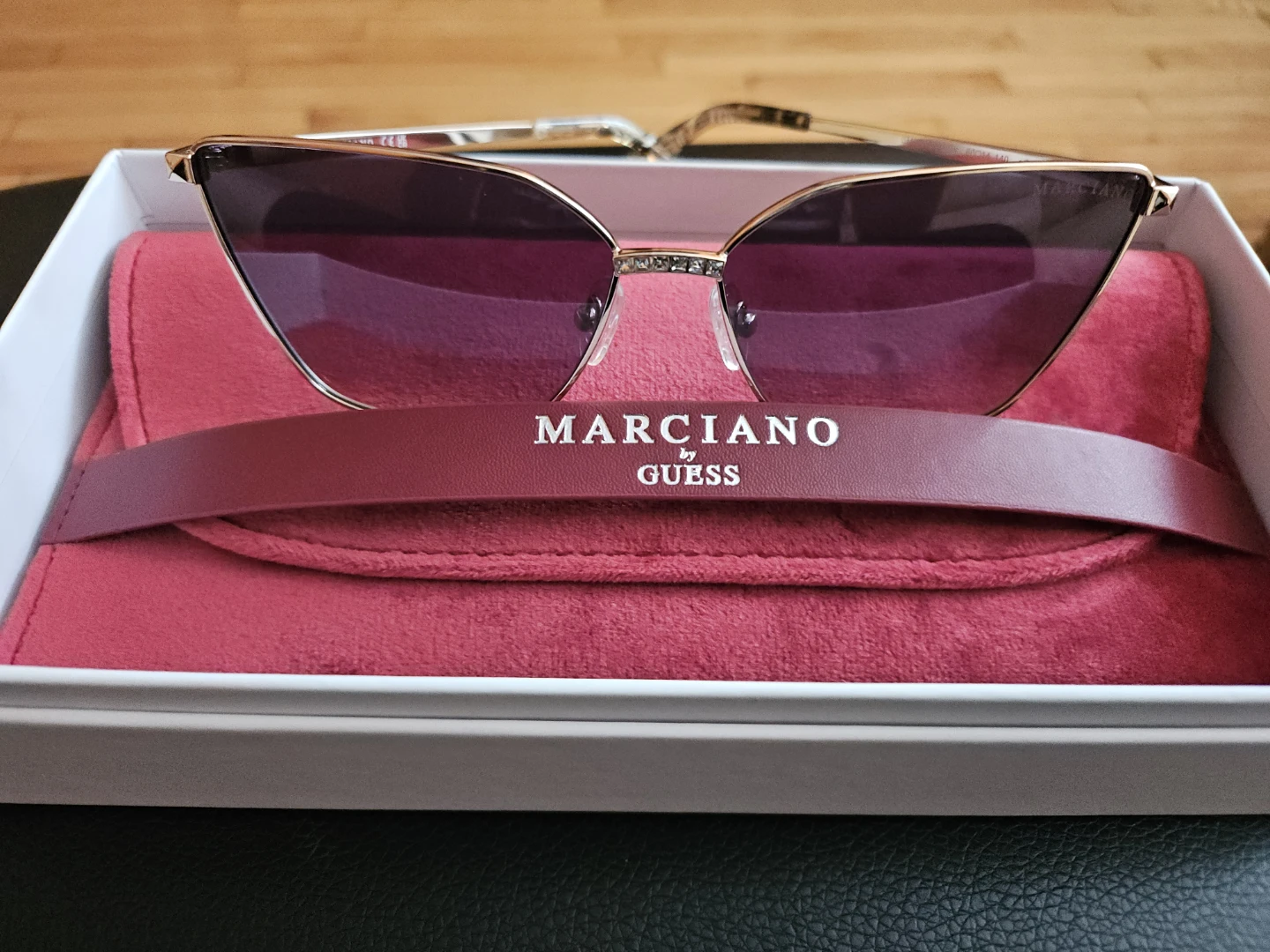 Stylish Guess Marciano cat-eye sunglasses. Features a rose gold metal frame with tortoise pattern on the temples. Comes in original box with a protective pouch.