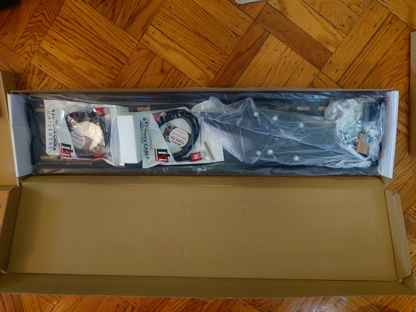 This is a DECO MOUNT TV Wall Mount for screens 37" to 100". It includes 2 HDMI cables, a cleaning spray, and a microfiber cloth. The mount is designed for versatile TV placement.