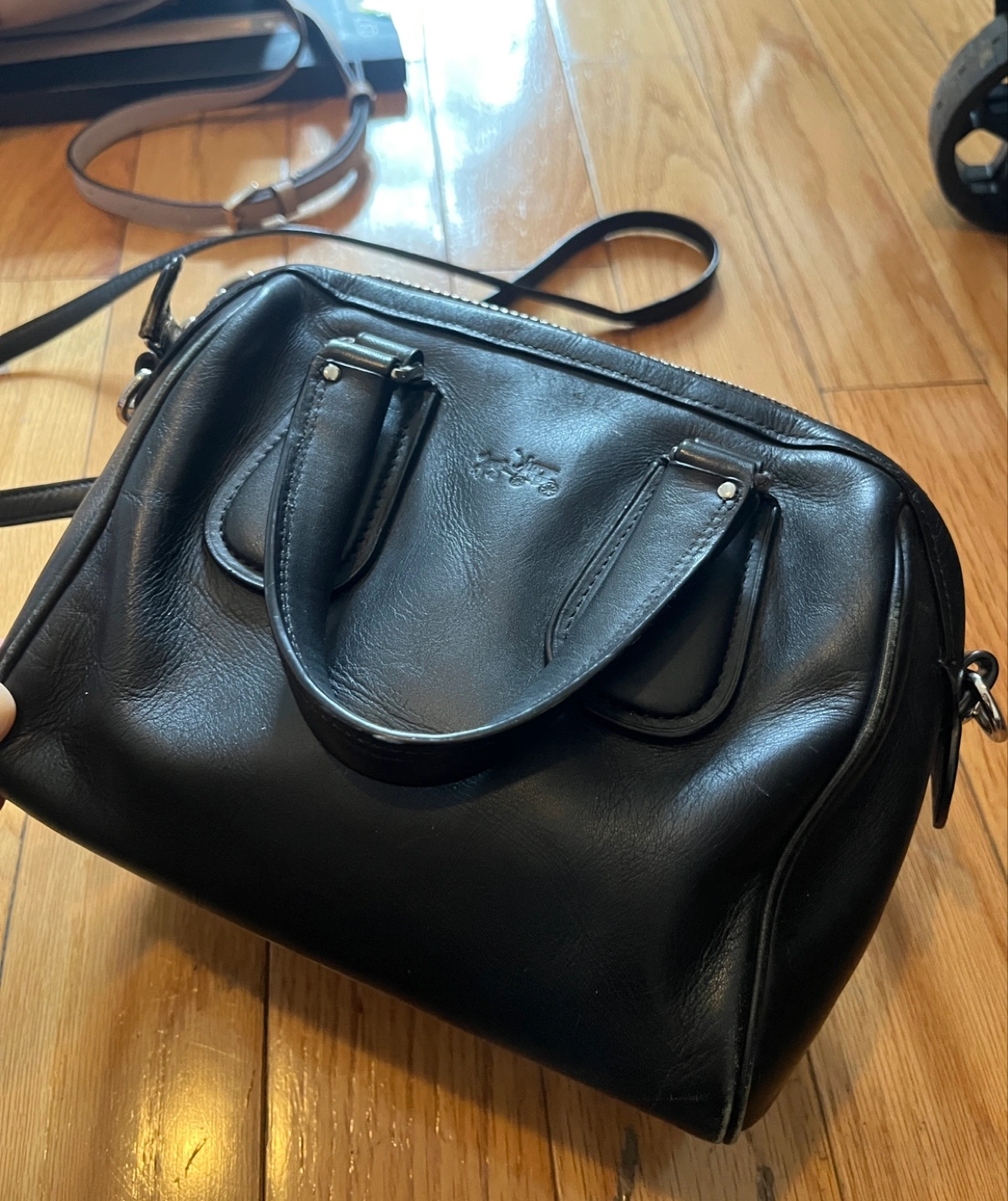 Small black leather handbag. Top zip closure. Double top handles and long shoulder strap. Excellent for everyday use.