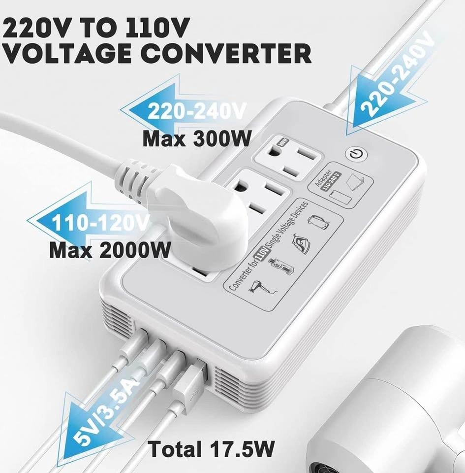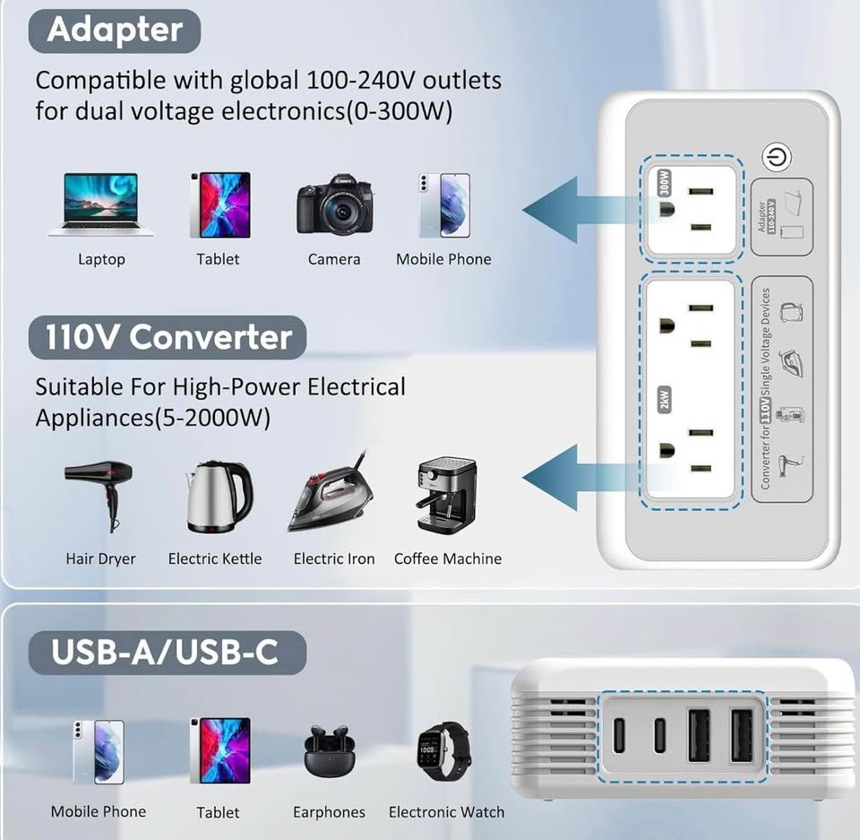 This 220v to 110v Converter has 3 AC sockets, 2 USB-A ports and 2 USB-C ports. It's designed for high-power appliances up to 2000W, like hair dryers, coffee makers, kettles, and flat-irons. The 300W adapter is for dual-voltage devices like laptops, phones, and cameras, and can also use the USB ports. This combination works quietly without disturbing you. It uses physical cooling, so there's no fan noise. The converter auto-shuts down for surge protection, overheat, over-current, over-temperature, or short circuit to ensure your safety. It has passed UL Test and includes overcurrent, overload, overheating, and short circuit protections. It's sturdy and compact with an LED warning light. Certified by CE, EMC, ROHS, and FCC for quality and safety. It's small and lightweight, saving space in your luggage.