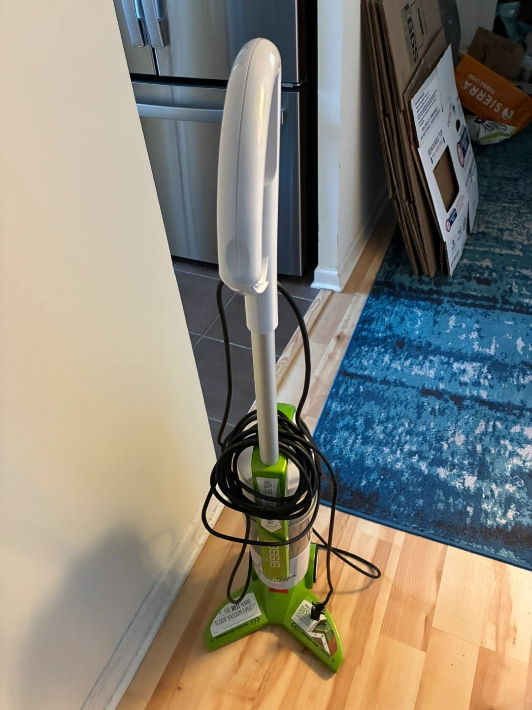 This is a Bissell brand hard floor vacuum. It's designed for effective cleaning on hard surfaces. The cord wraps around the unit for easy storage.