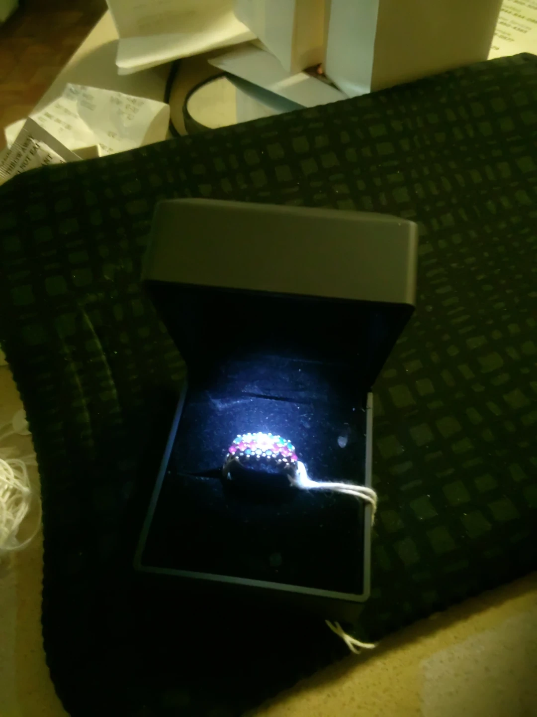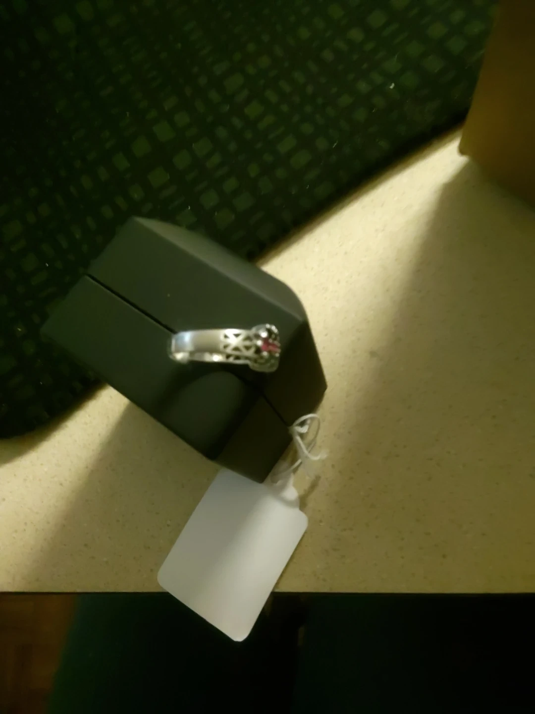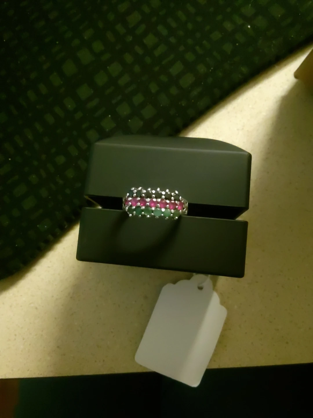Sterling silver band ringsize 8 with alternating rubies Sapphire and emeralt stones. Ring comes in a black velvet jewelry box with a light. It's a beautiful piece for any occasion!