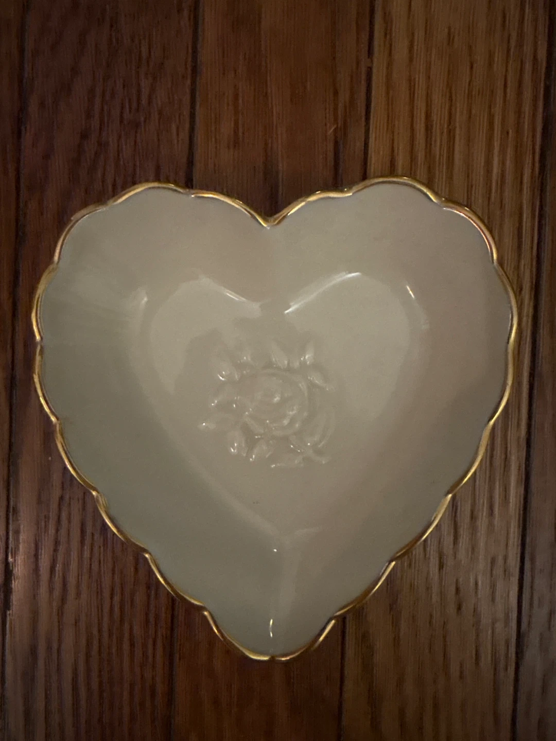 Beautiful Lenox trinket dish in a heart shape. Features a raised rose design in the center and a delicate gold trim around the scalloped edge. It's perfect for holding small jewelry or keepsakes.