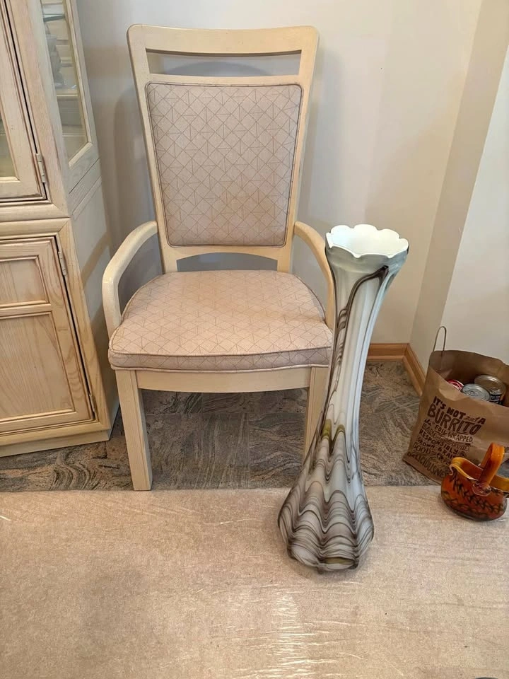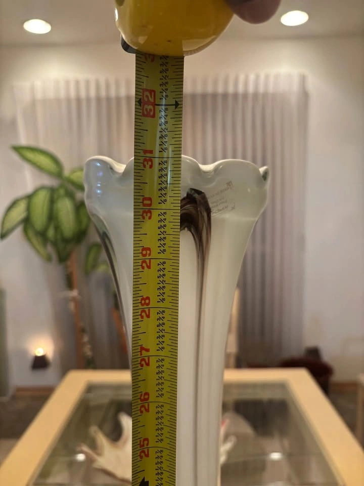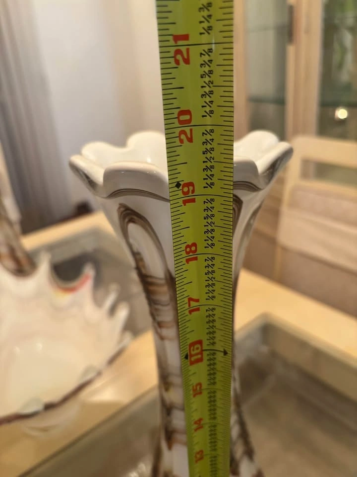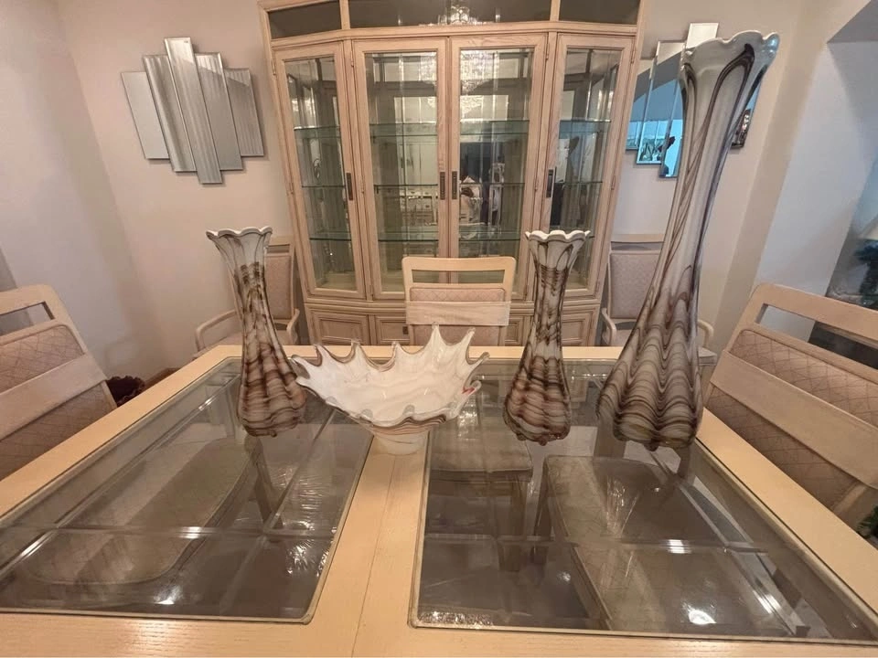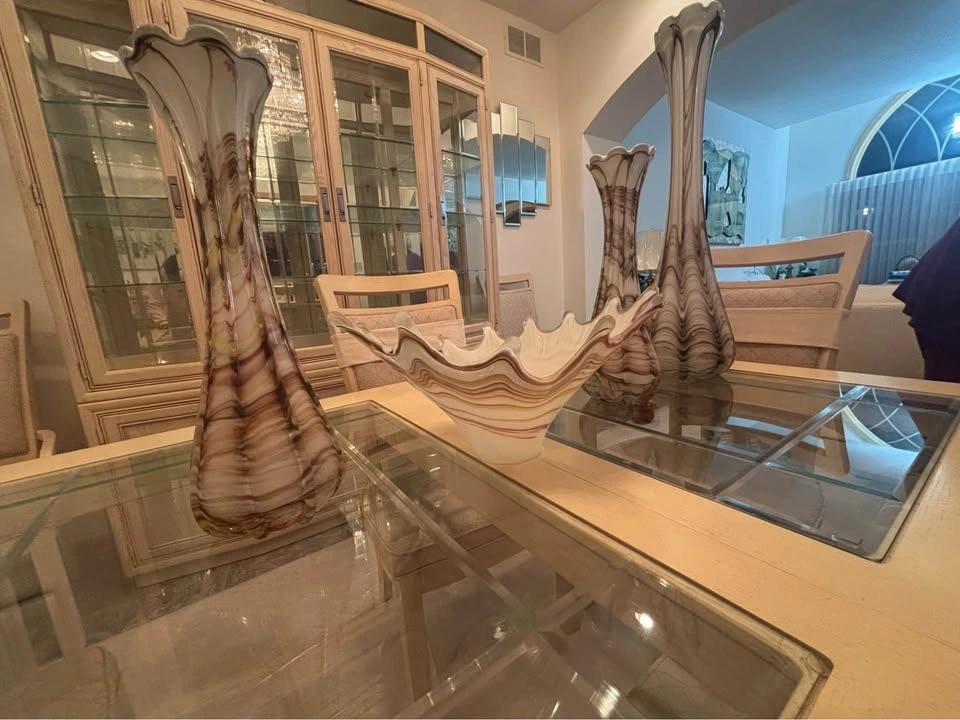 Beautiful 4-piece hand-blown art glass decorative set featuring elegant brown, taupe, and white swirl detailing. This coordinated set includes 1 tall statement floor vase, 2 medium vases, and one sculptural ruffled bowl. The tall vase measures approximately 30–32 inches high, ideal as floor pieces or large decorative accents. The glass has a look that complements neutral, modern, transitional, or contemporary interiors.