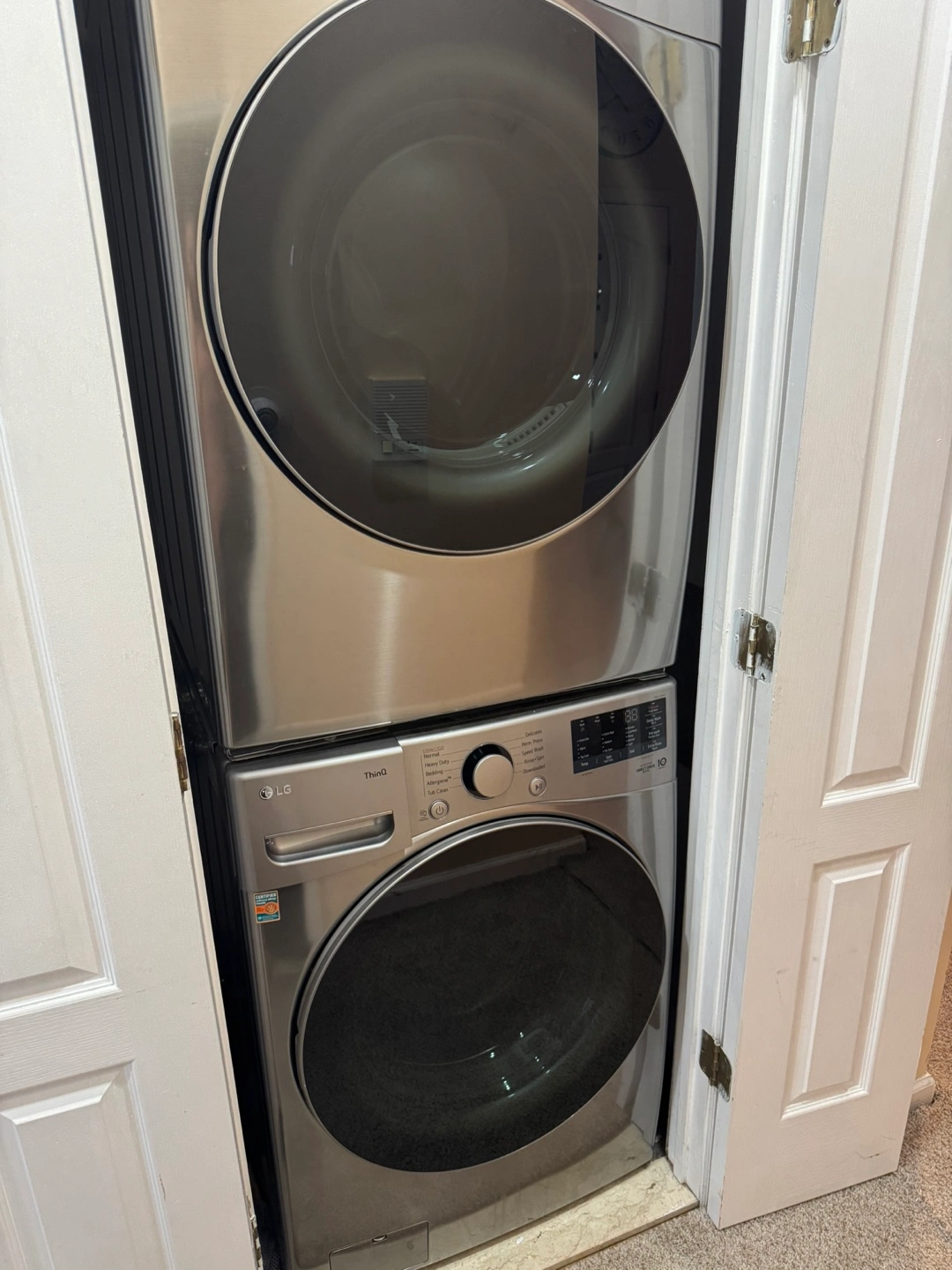 A wonderful stackable washer and dryer unit. Stainless steel finish. Features a circular door. An essential for any home; imagine relaxing while your laundry gets done.