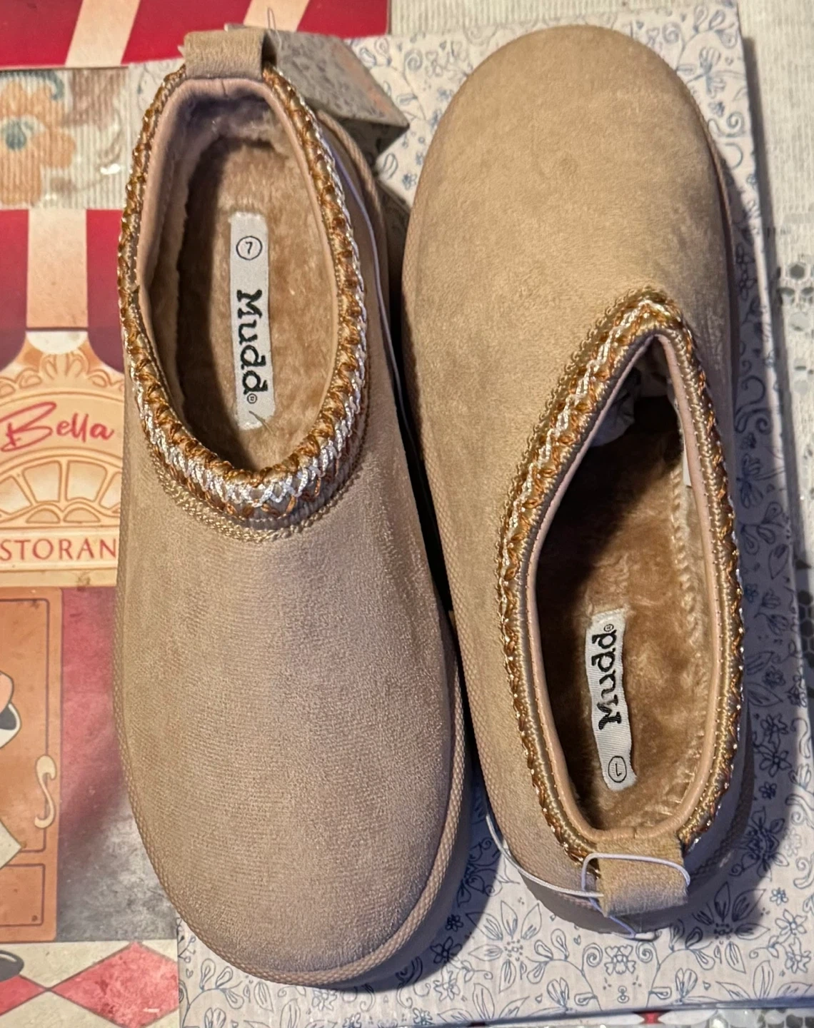 Stylish tan slip-on shoes with a comfortable Stitched design. NWT Mudd suede platform slippers clogs. Extremely comfortable and soft foot wear. Perfect for casual wear. Size 7 Platform 1 1/8" Lining 100% Faux Fur Comes with the original box