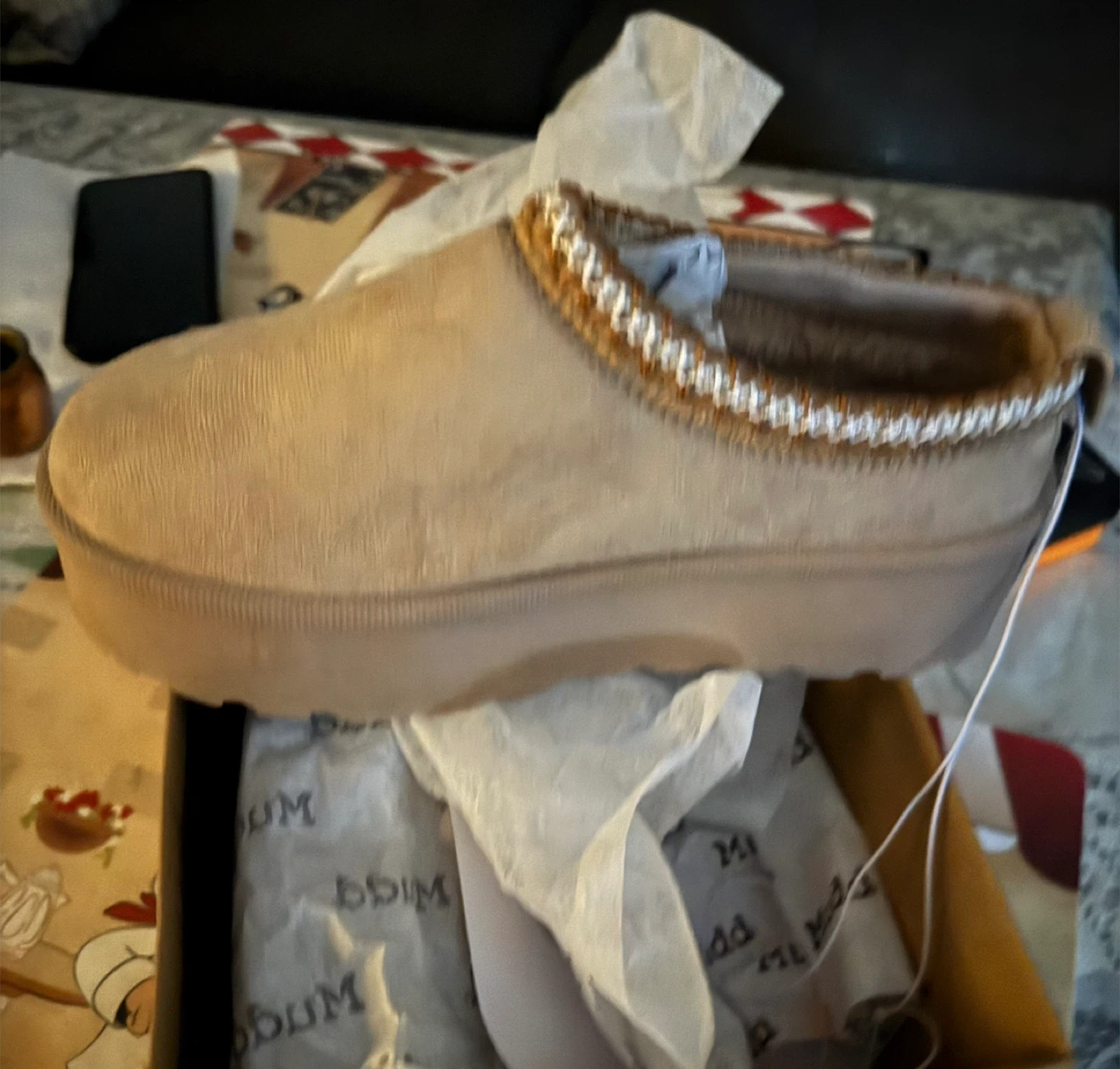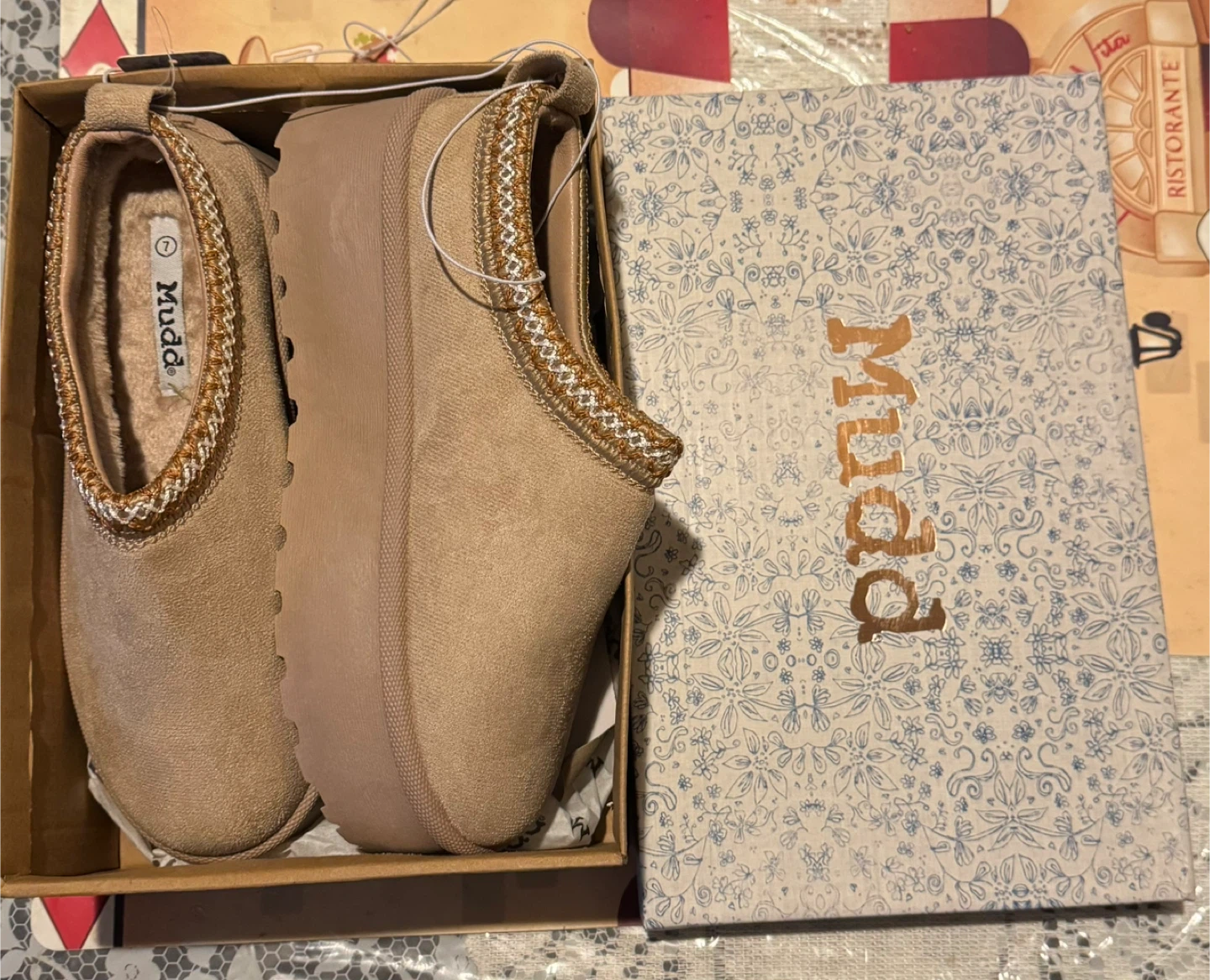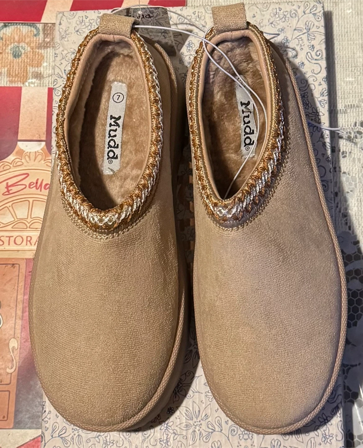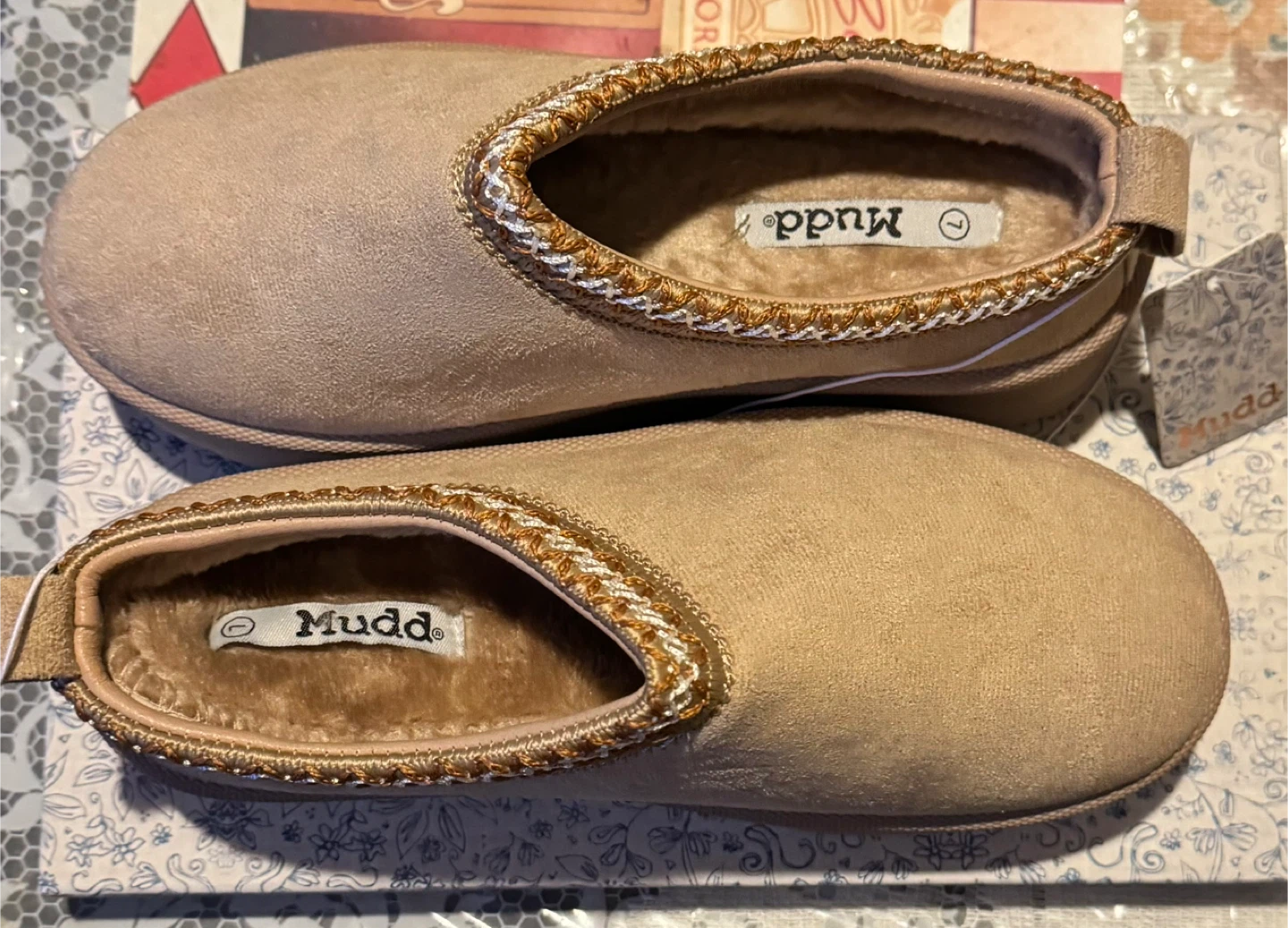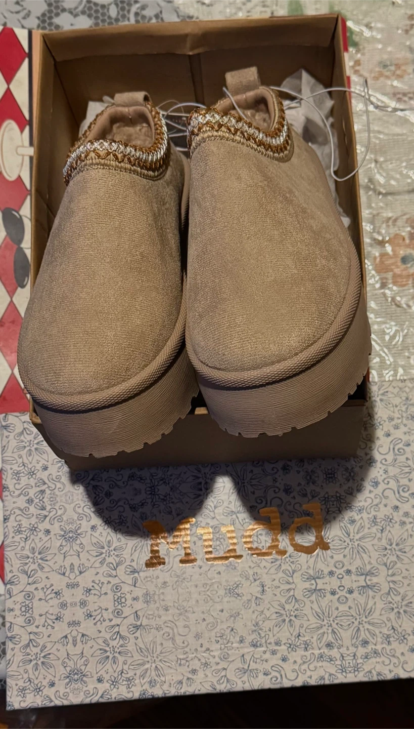 Stylish tan slip-on shoes with a comfortable Stitched design. NWT Mudd suede platform slippers clogs. Extremely comfortable and soft foot wear. Perfect for casual wear. Size 7 Platform 1 1/8" Lining 100% Faux Fur Comes with the original box