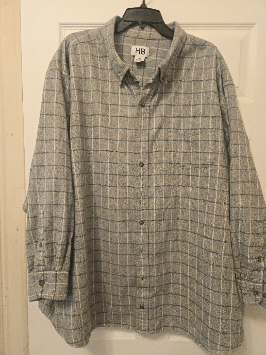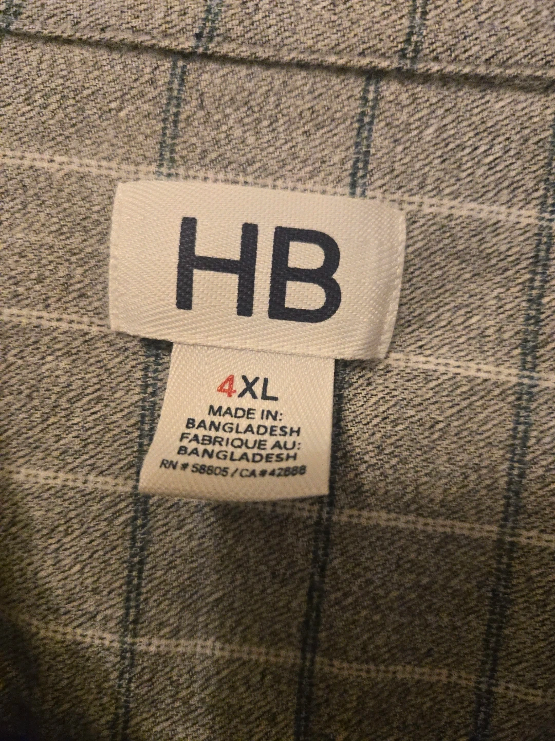 This HB button-up shirt is size 4XL. It features a classic plaid pattern. Made in Bangladesh.
