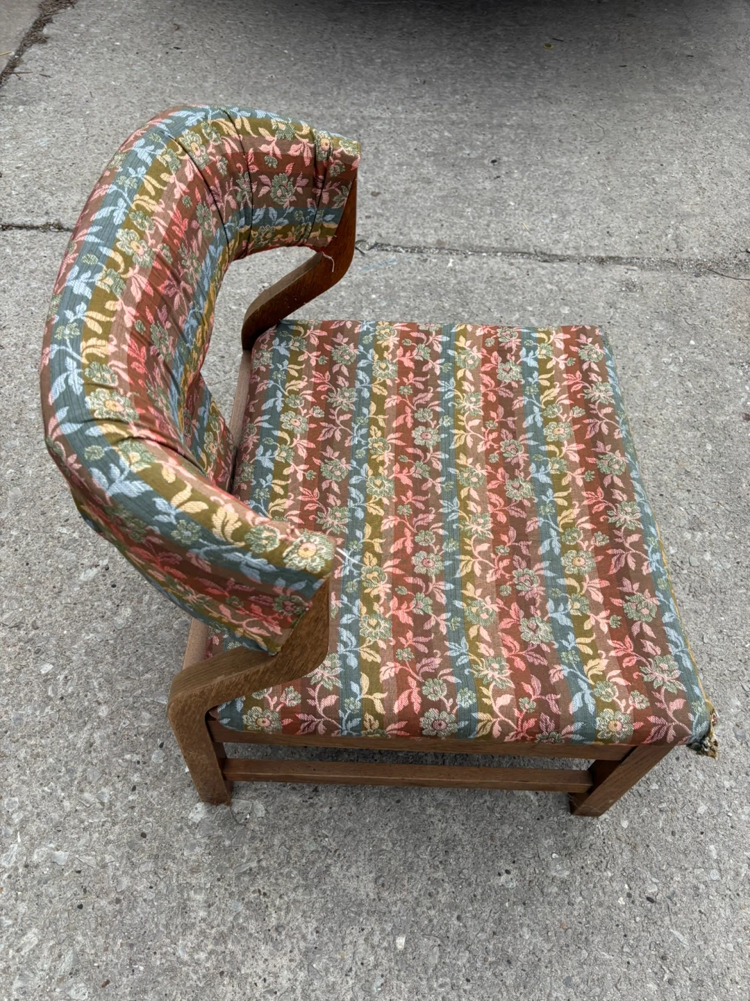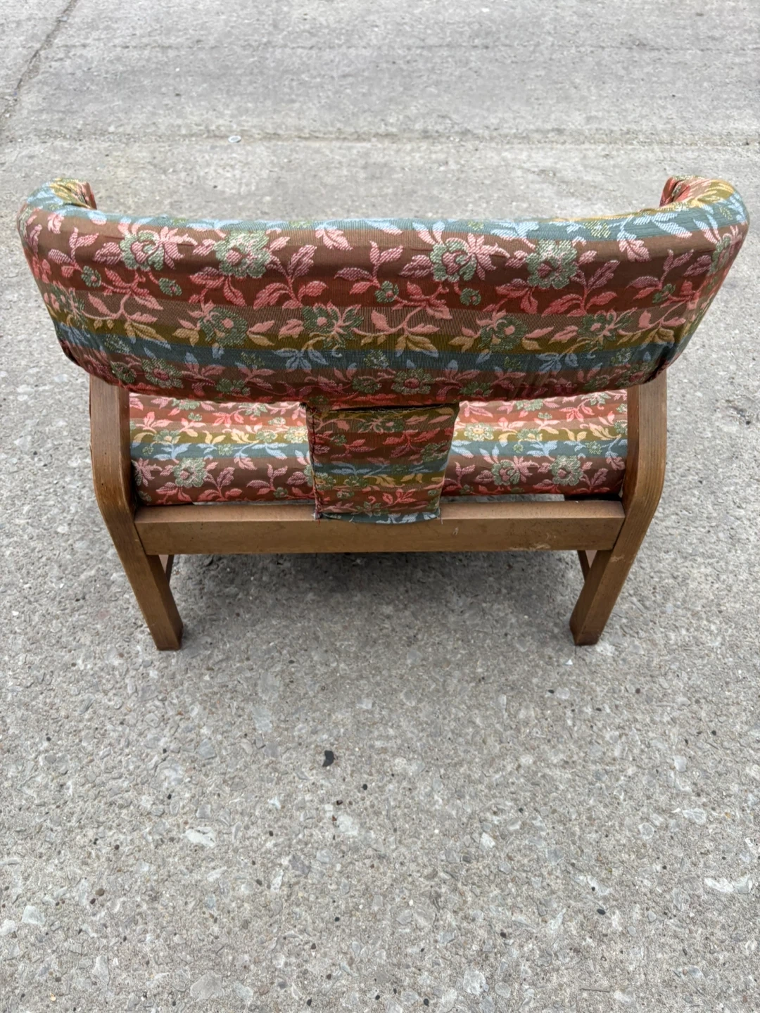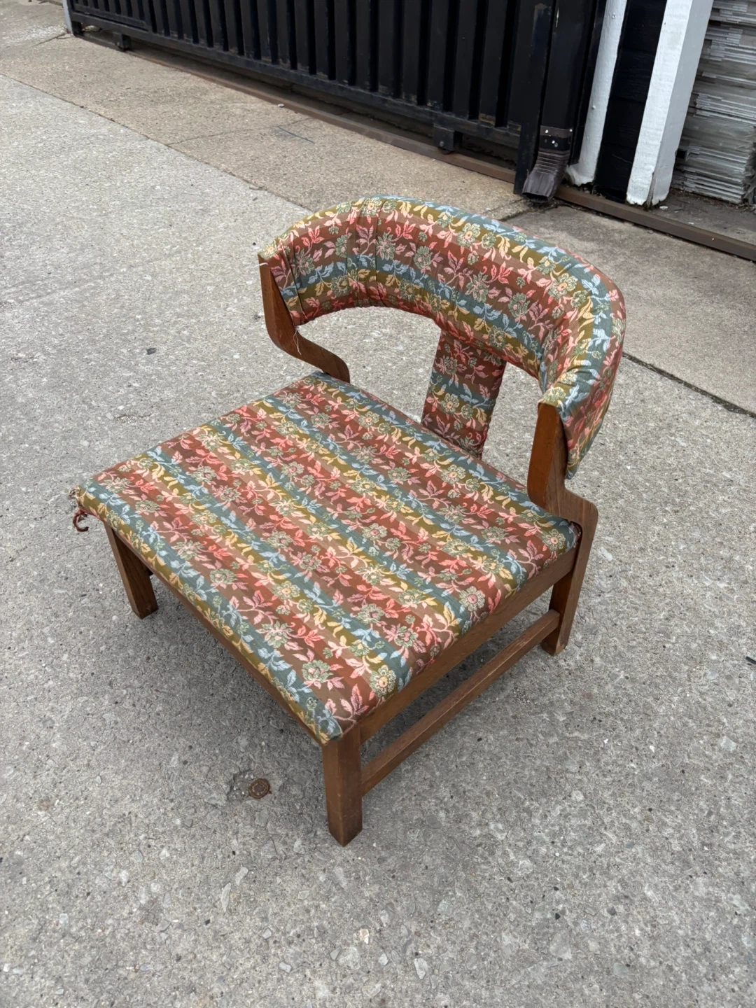 Charming accent chair with a vintage floral print upholstery. Wooden frame with curved armrests. Perfect for adding a pop of color to any room! Very unique, Offers open