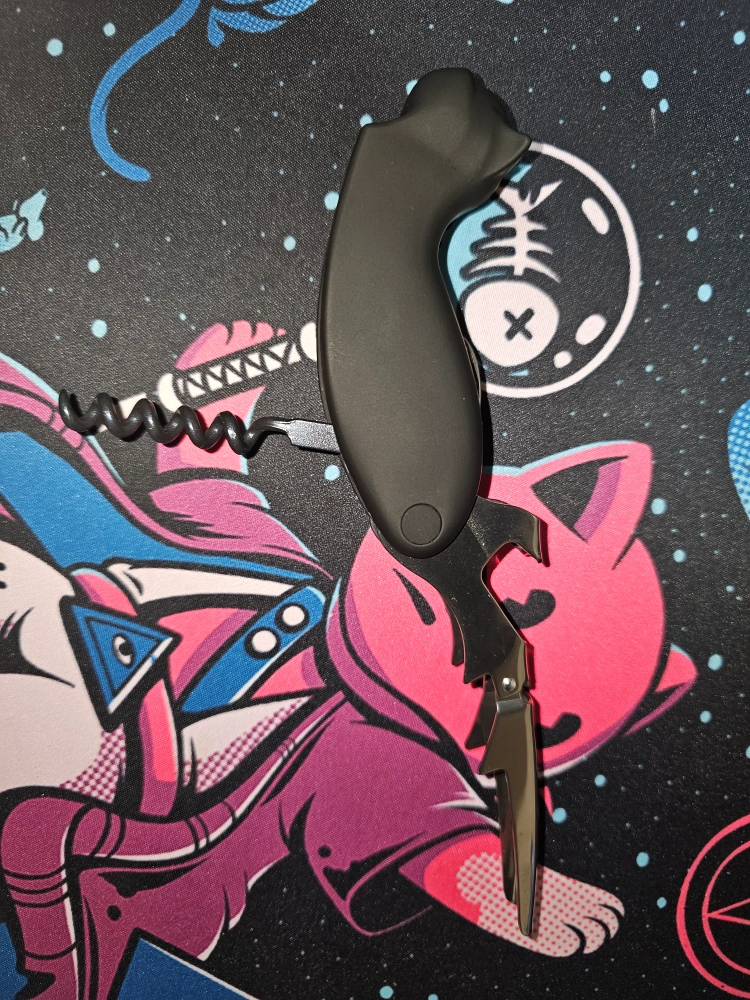 I'm selling a fun wine opener! It's shaped like a black cat, which makes it a unique addition to any bar or kitchen. It's in great condition and ready to help you open your favorite bottles of wine with a touch of whimsy