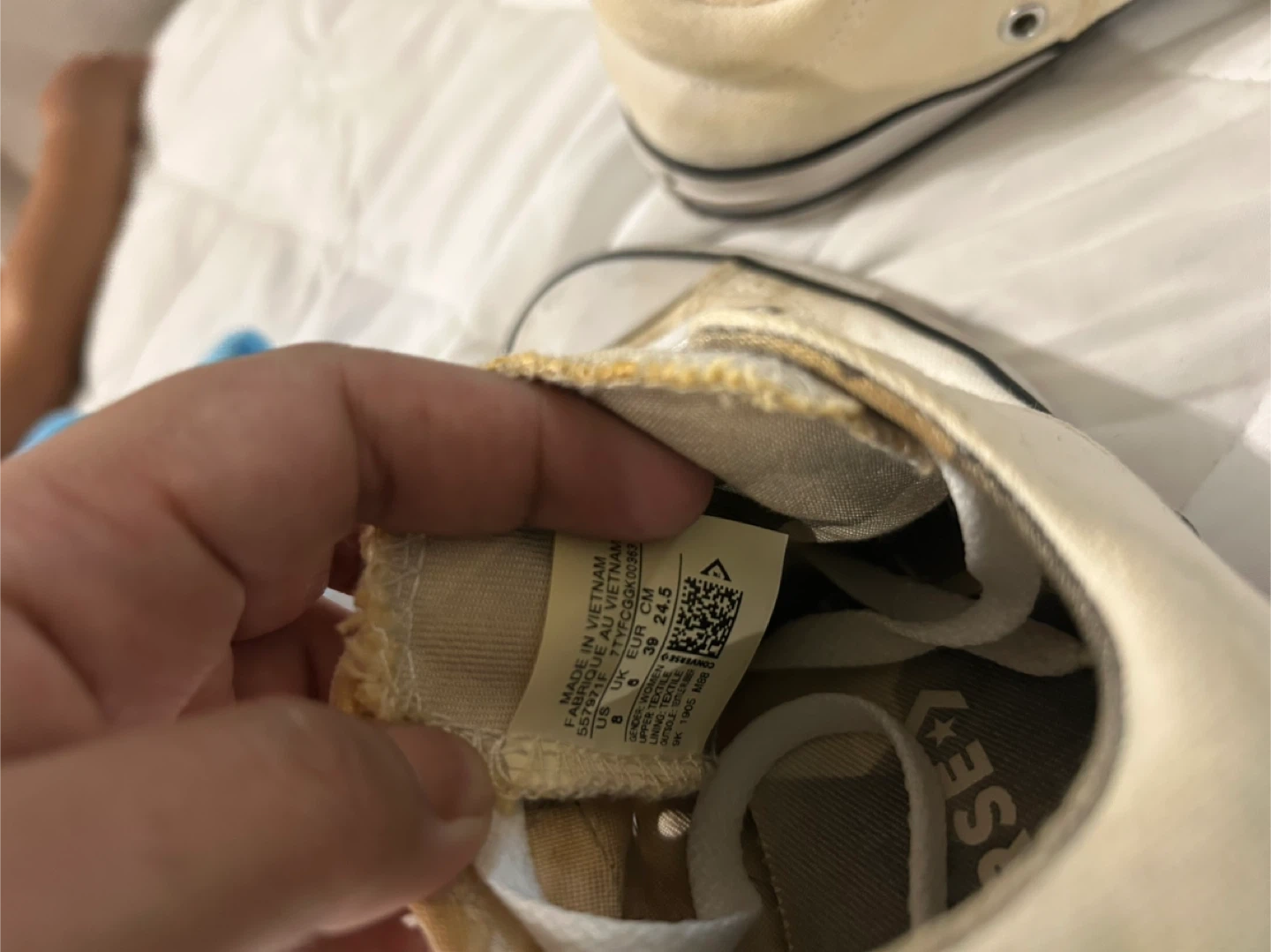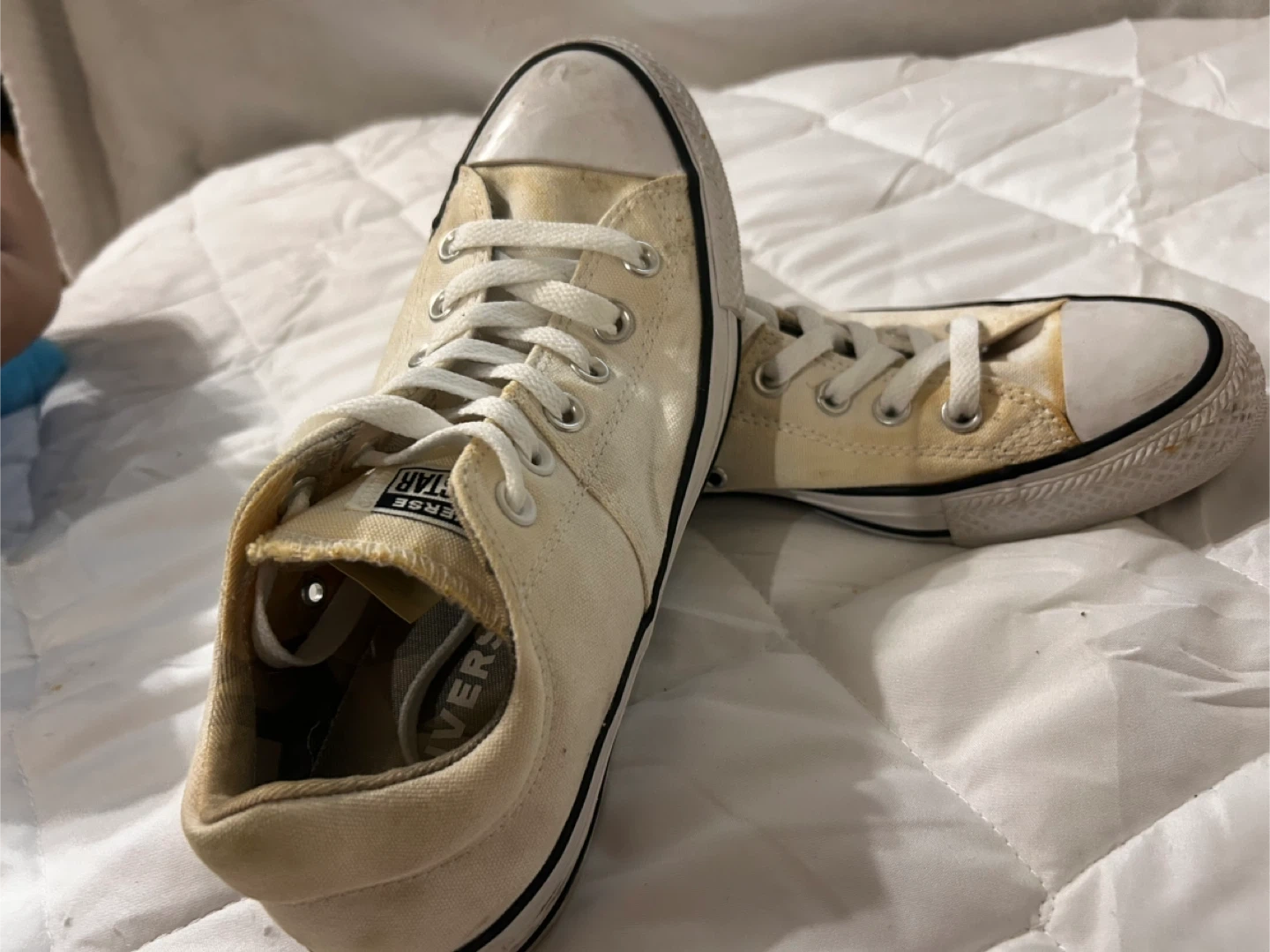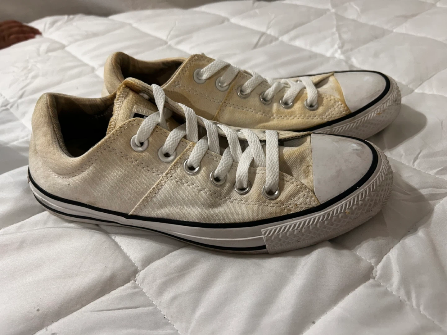 Selling a pair of Converse All Star low top sneakers in a light cream color. They are a US size 8. There are some signs of wear, as shown in the photos, but they still have plenty of life left!