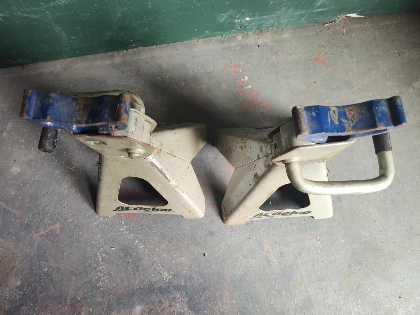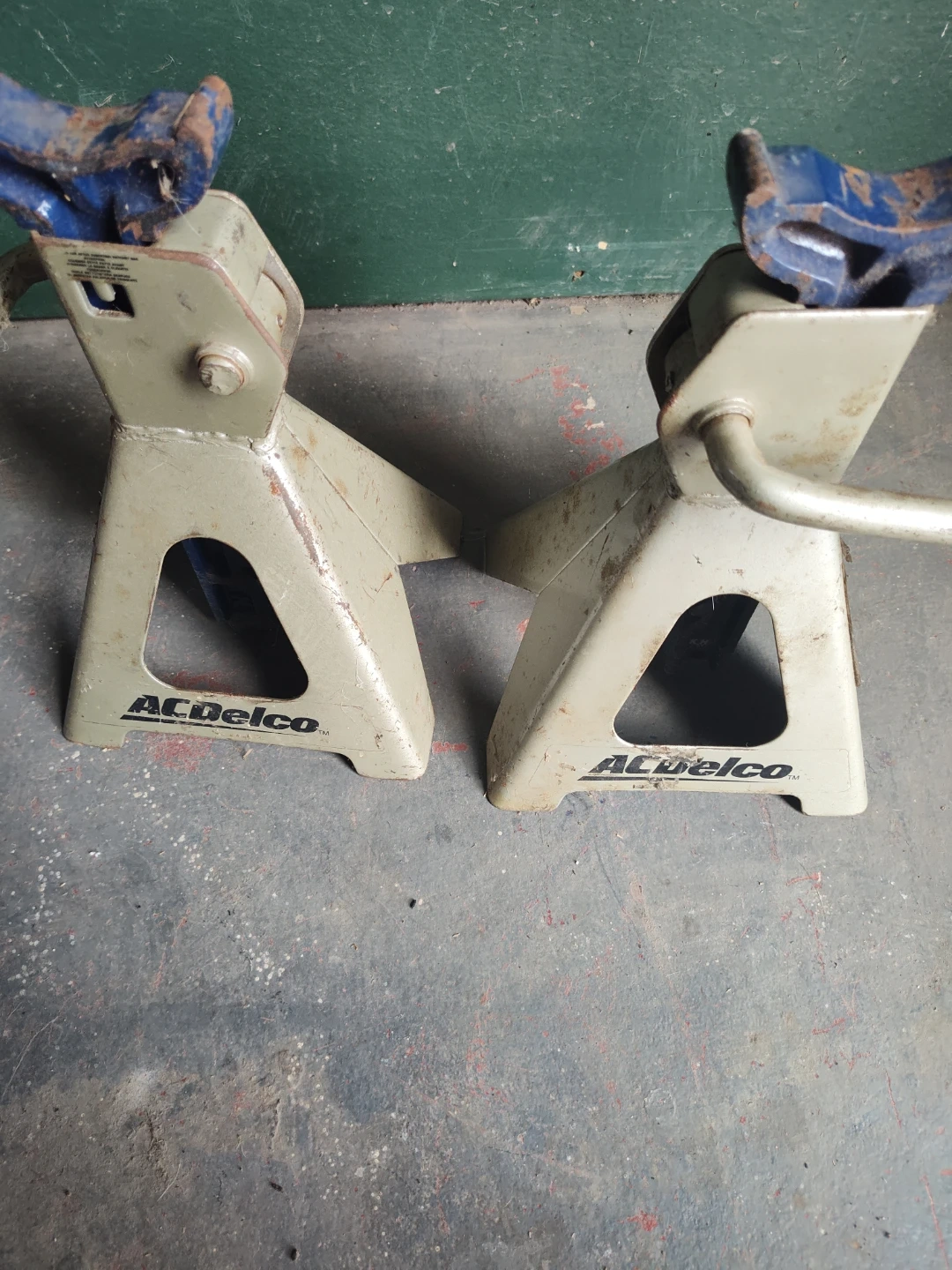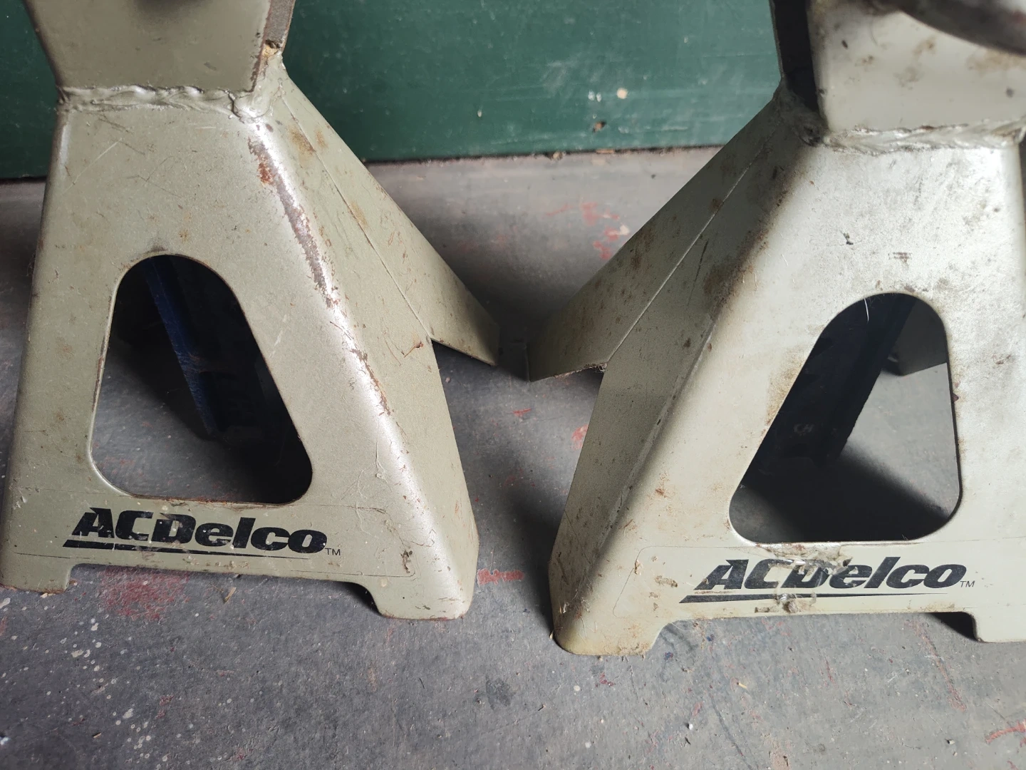 Pair of ACDelco jack stands for automotive use. They're made of sturdy metal construction. Included are the ratcheting mechanism for height adjustment. These stands are essential for safely lifting and supporting vehicles.