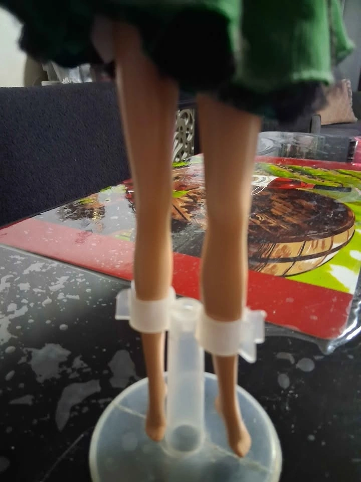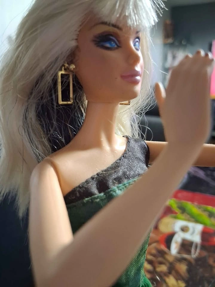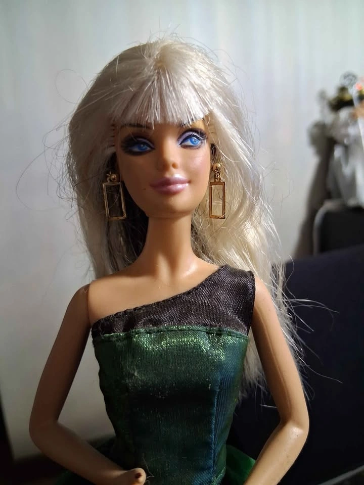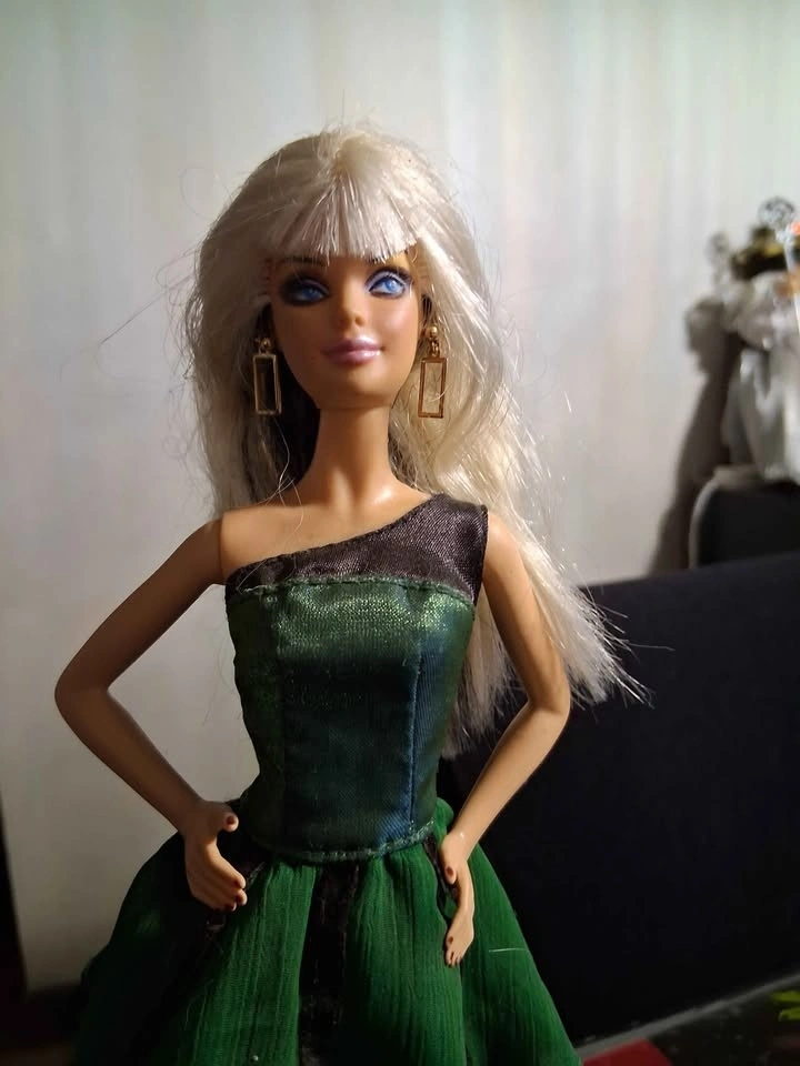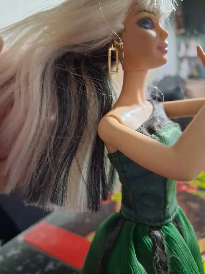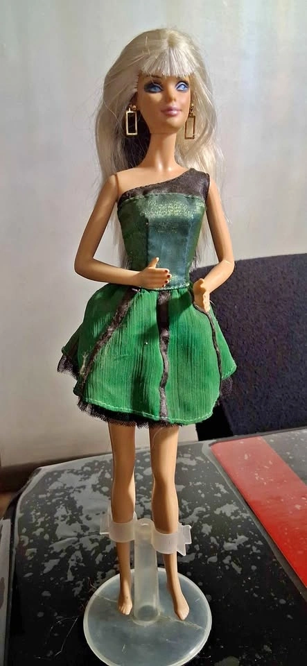 Beautiful Barbie doll with a short, two-toned dress and matching two-toned hair, rigid legs, and a pair of very pretty earrings. Does not include a stand or shoes. Feel free to message if you have any questions!