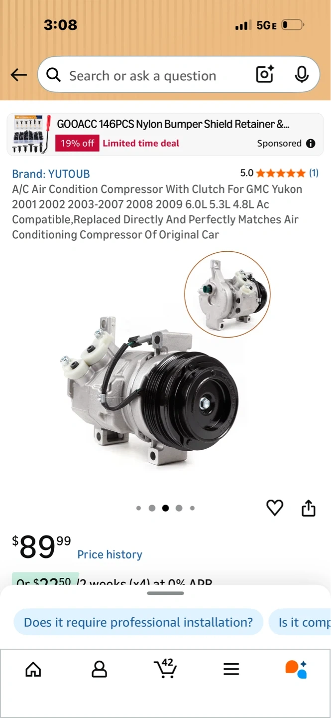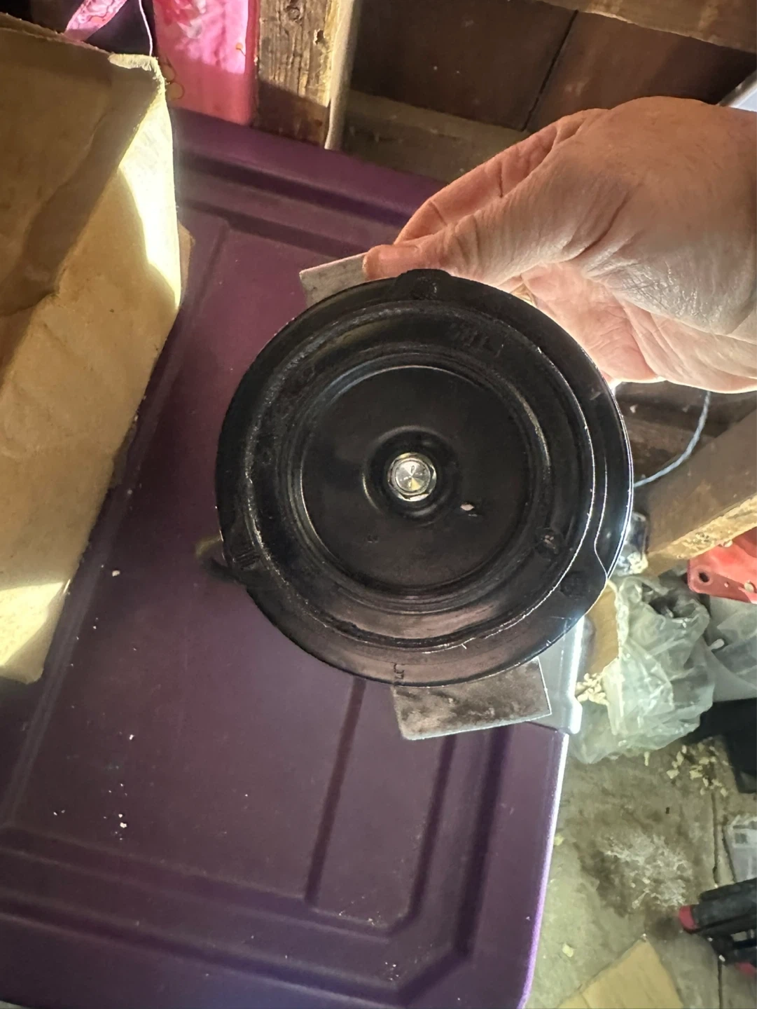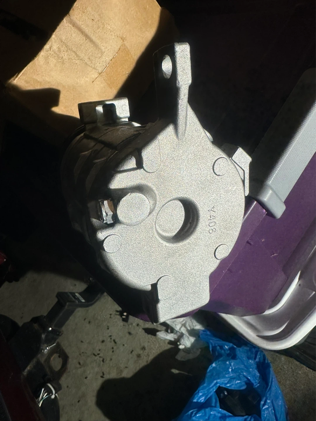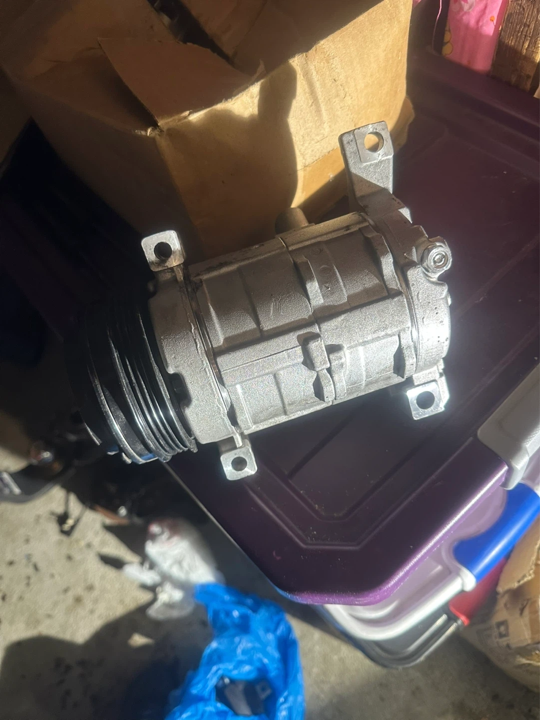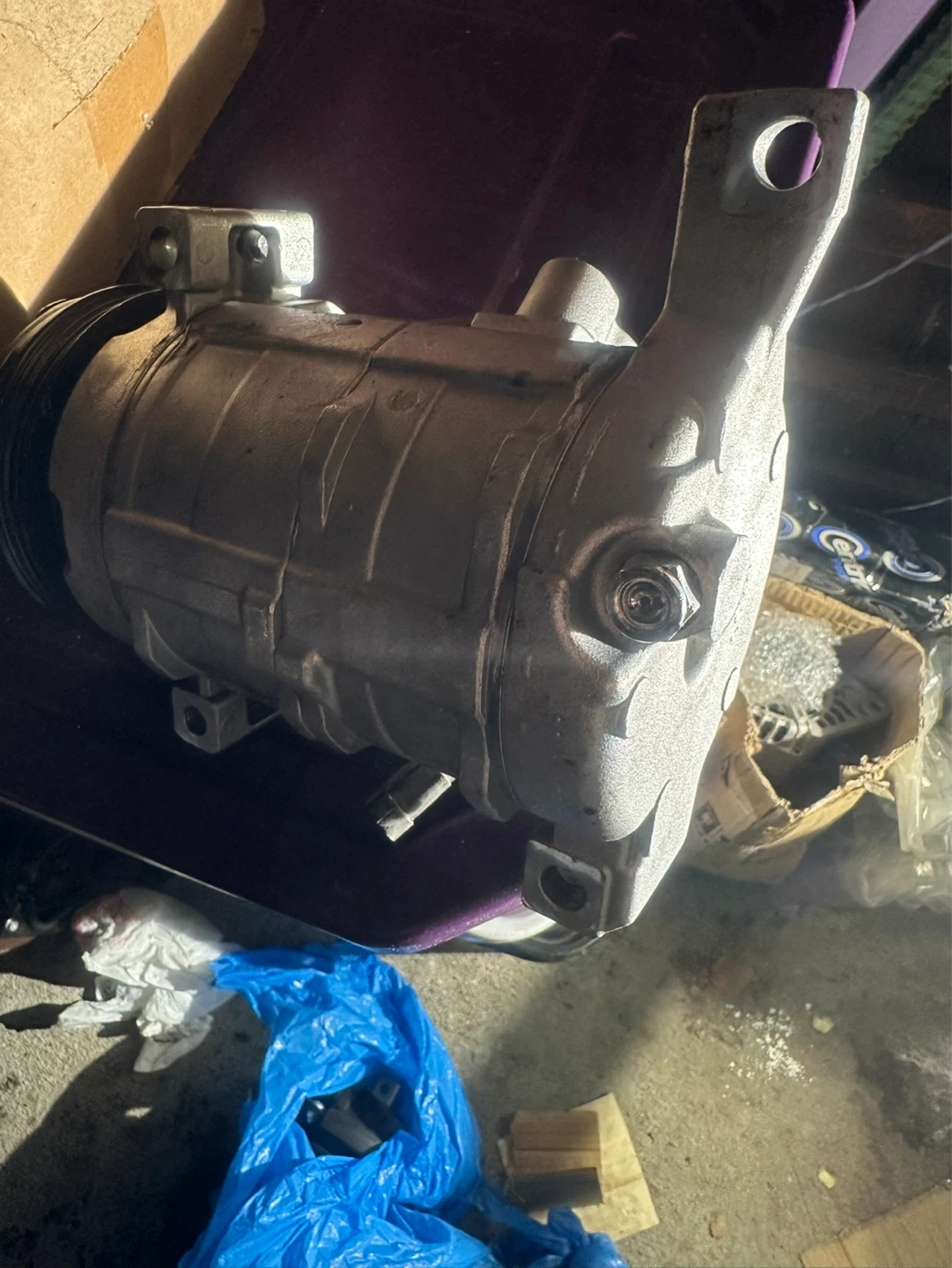 This is a used AC compressor. It's made of metal. This part would be useful for replacing a faulty AC compressor in a vehicle. It has mounting brackets and ports for refrigerant lines.