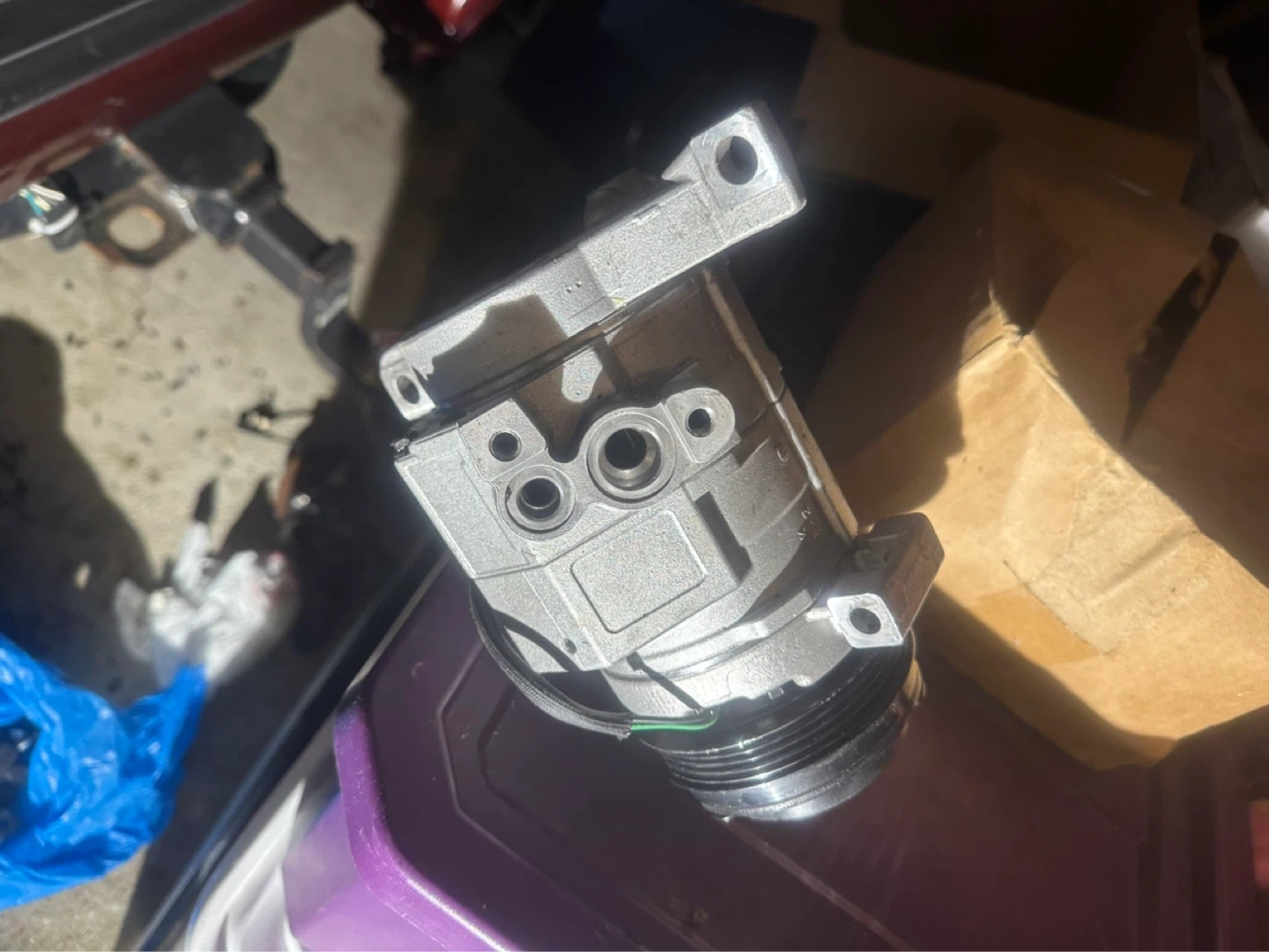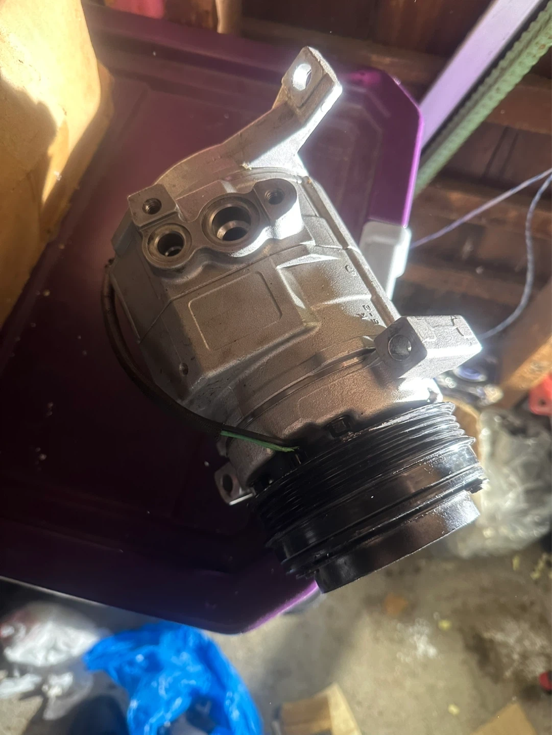 This is a used AC compressor. It's made of metal. This part would be useful for replacing a faulty AC compressor in a vehicle. It has mounting brackets and ports for refrigerant lines.