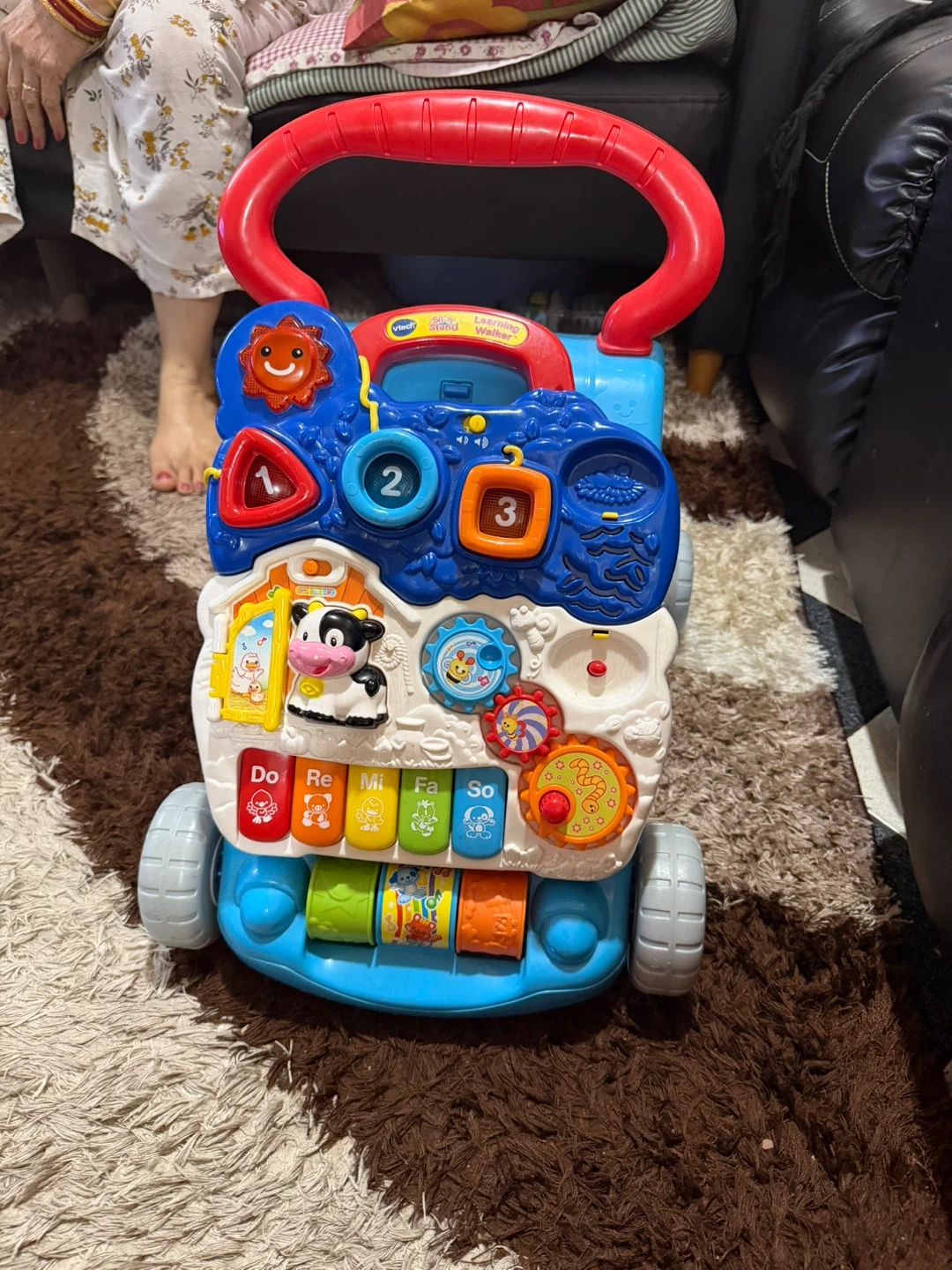 This VTech learning walker is designed for babies and toddlers. It features various interactive activities and sounds to engage young children. It's a great way for little ones to develop motor skills and learn through play. It includes a piano, gears, and animal sounds.