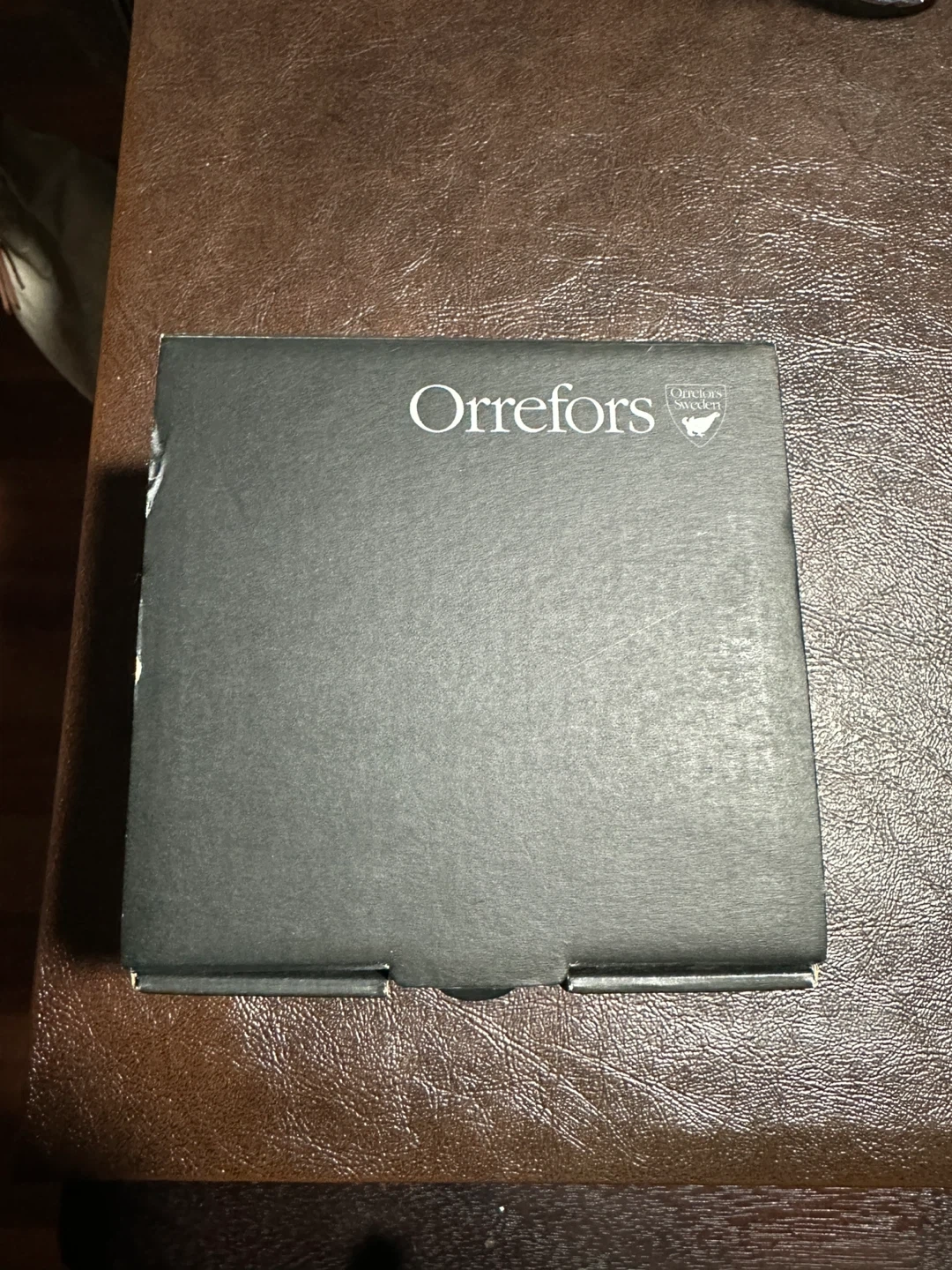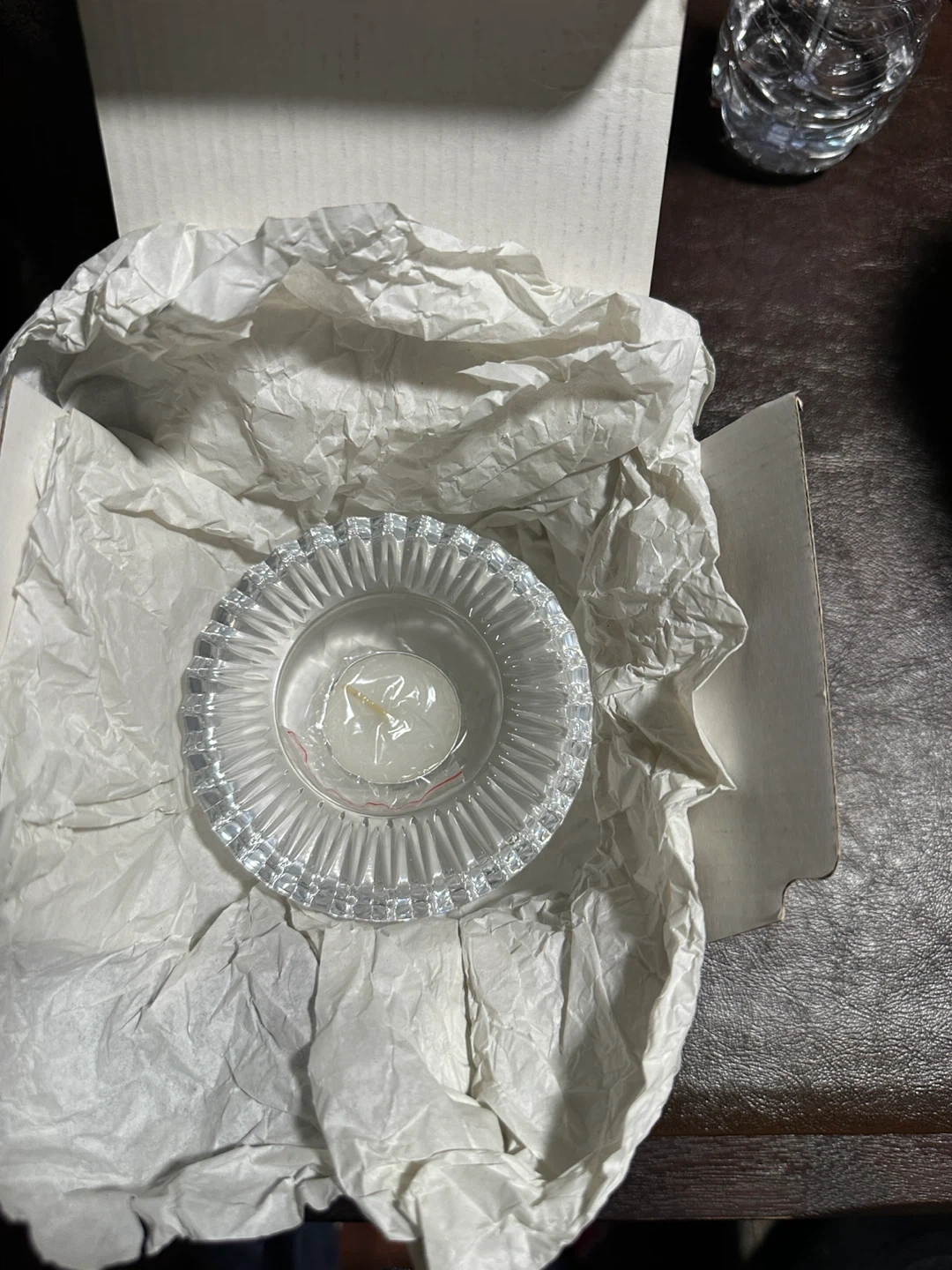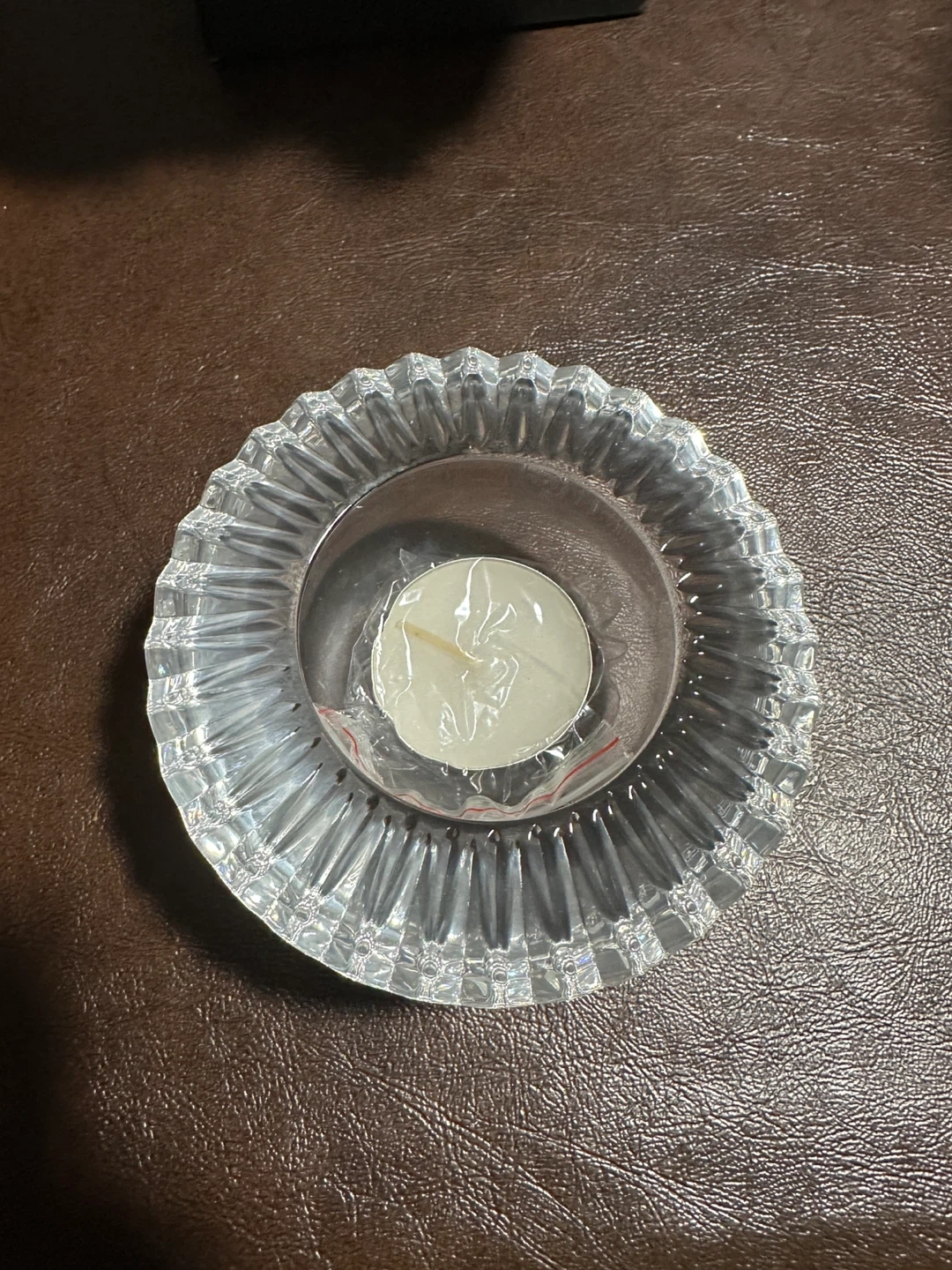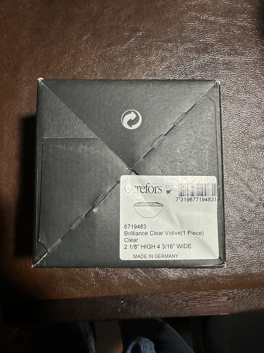 This Orrefors votive candle holder is made of clear glass. It measures 2 1/8" high and 4 3/16" wide. Includes one tea light candle. Made in Germany.