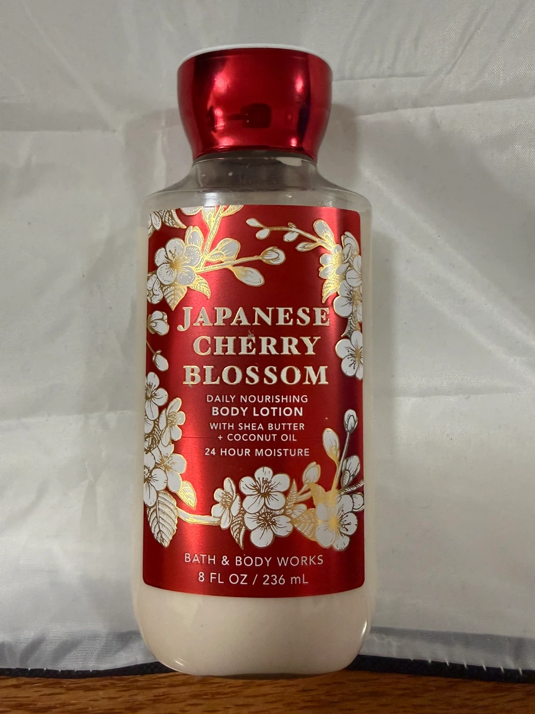 Bath & Body Works Japanese Cherry Blossom daily nourishing body lotion. It's made with shea butter and coconut oil for 24-hour moisture. 8 fl oz / 236 mL.