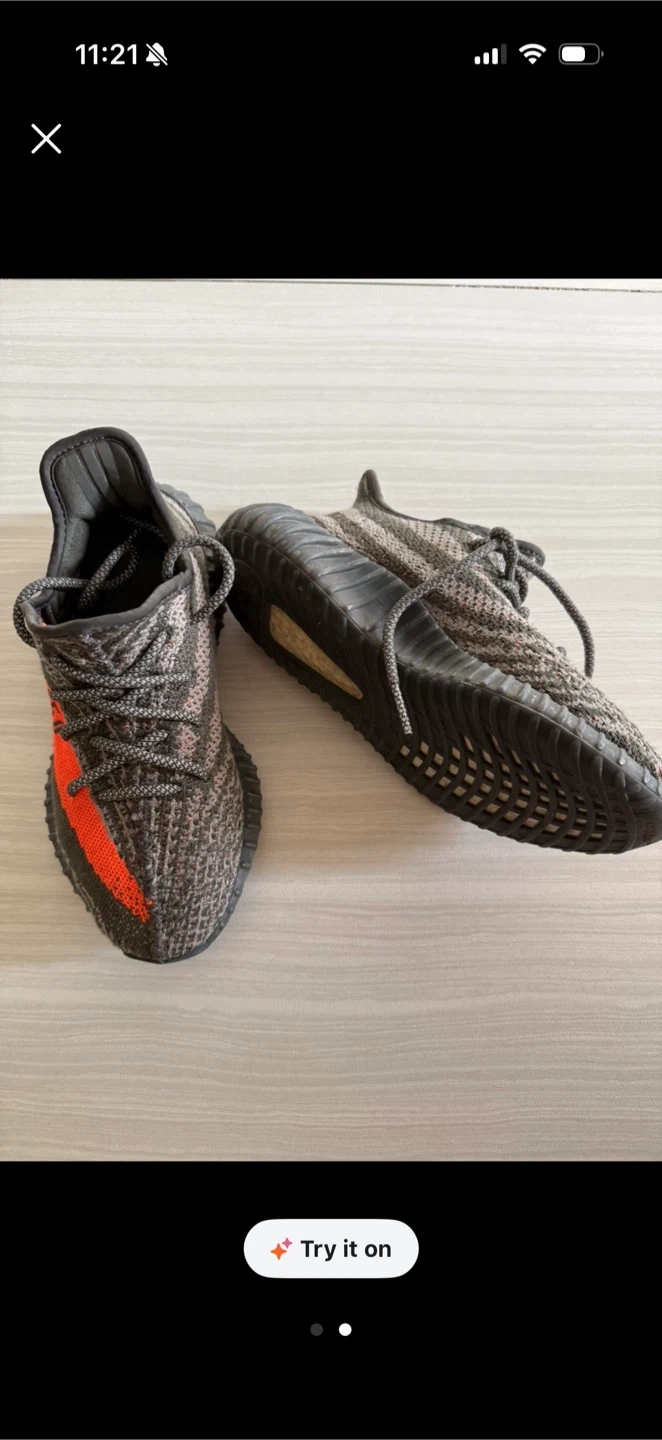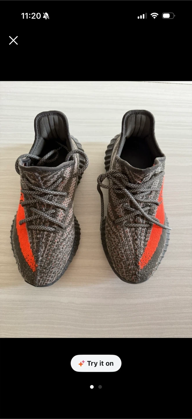 These Adidas Yeezy Boost 350 V2 "Beluga" sneakers feature a primeknit upper in a grey, black, and orange colorway. The iconic translucent side stripe is present. This popular model offers a comfortable and stylish fit. They're excellent for everyday wear!