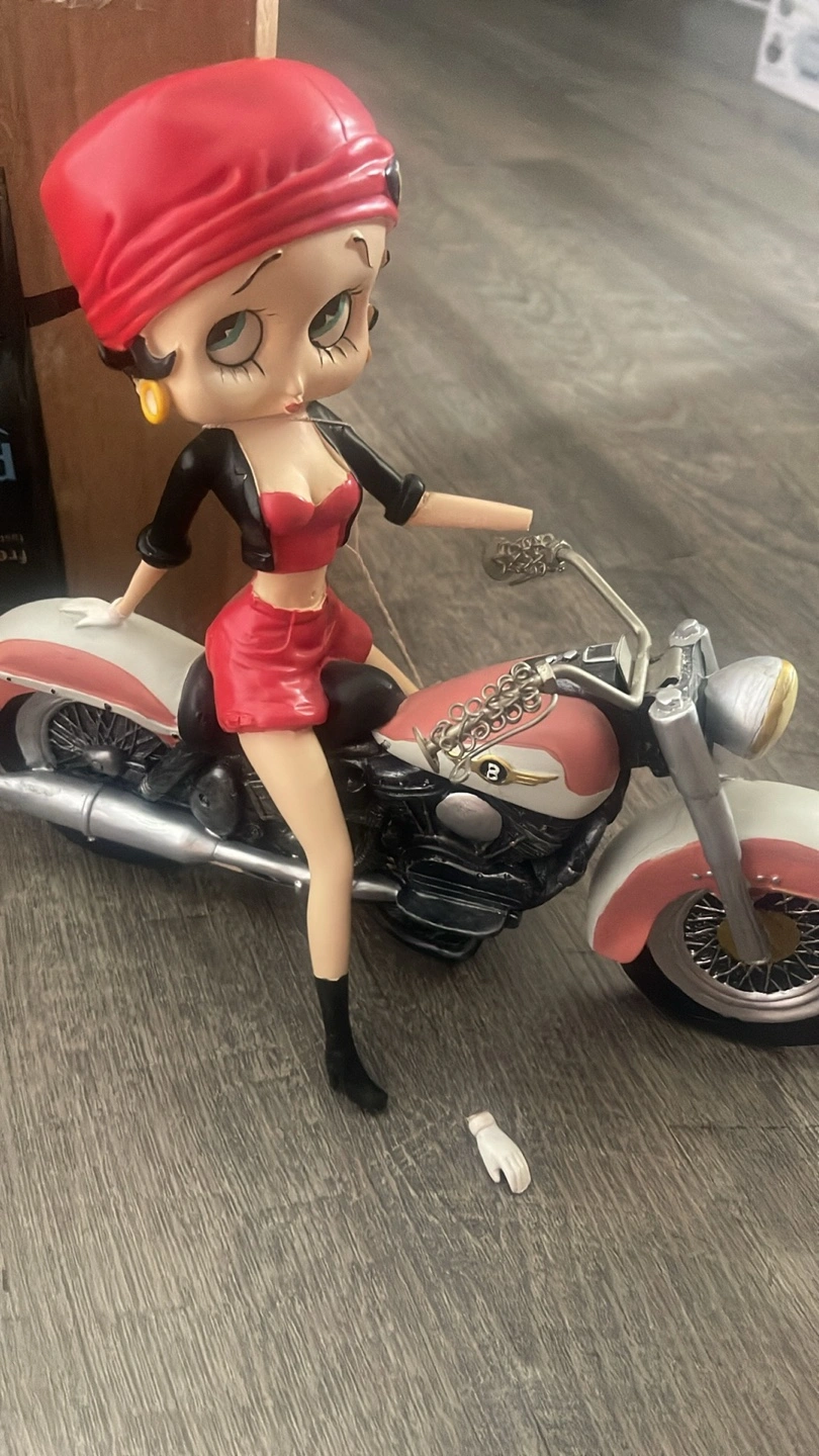 Selling a Betty Boop figurine on a motorcycle. It appears to be missing a hand, as shown in the photos. Great for collectors!