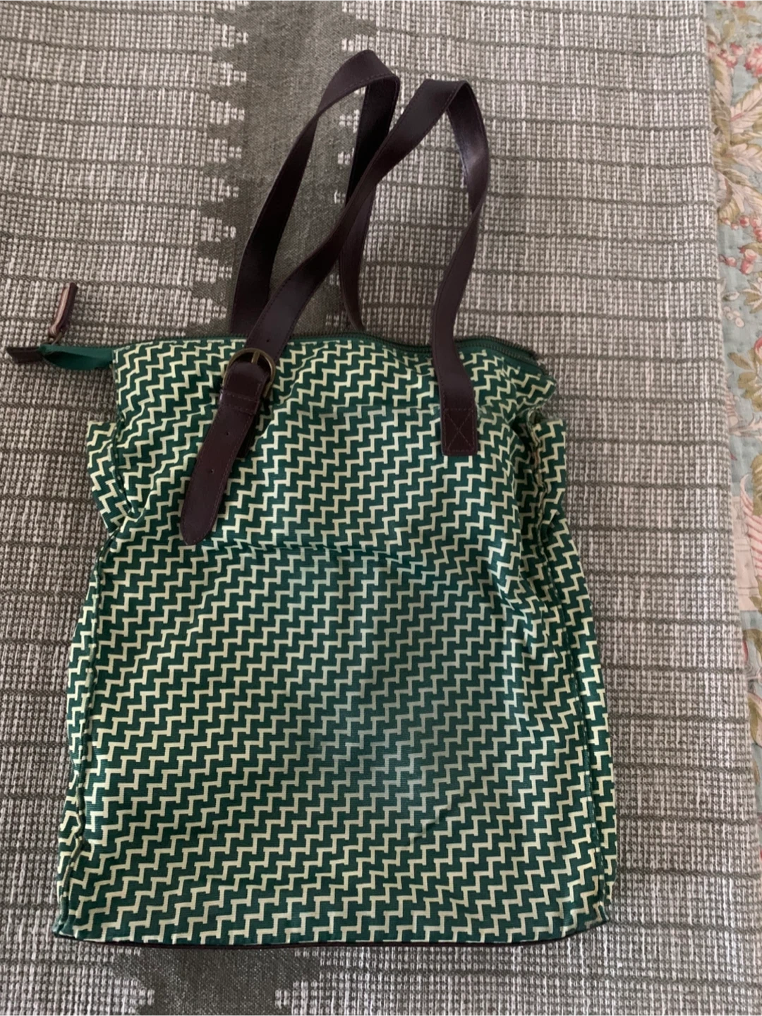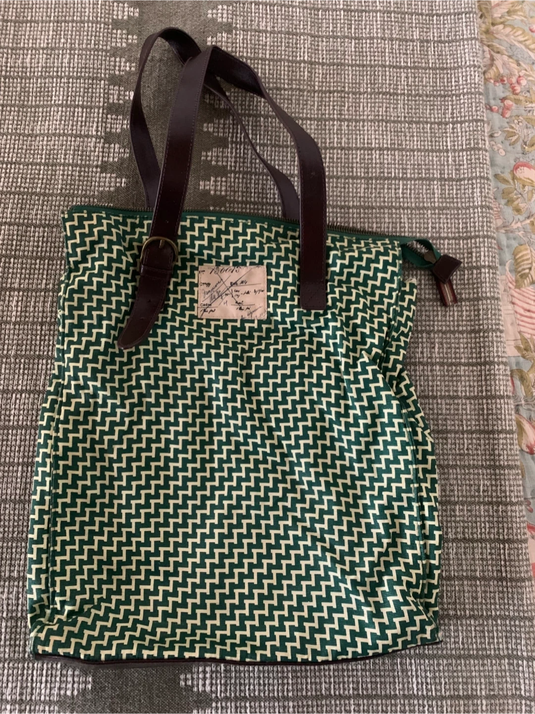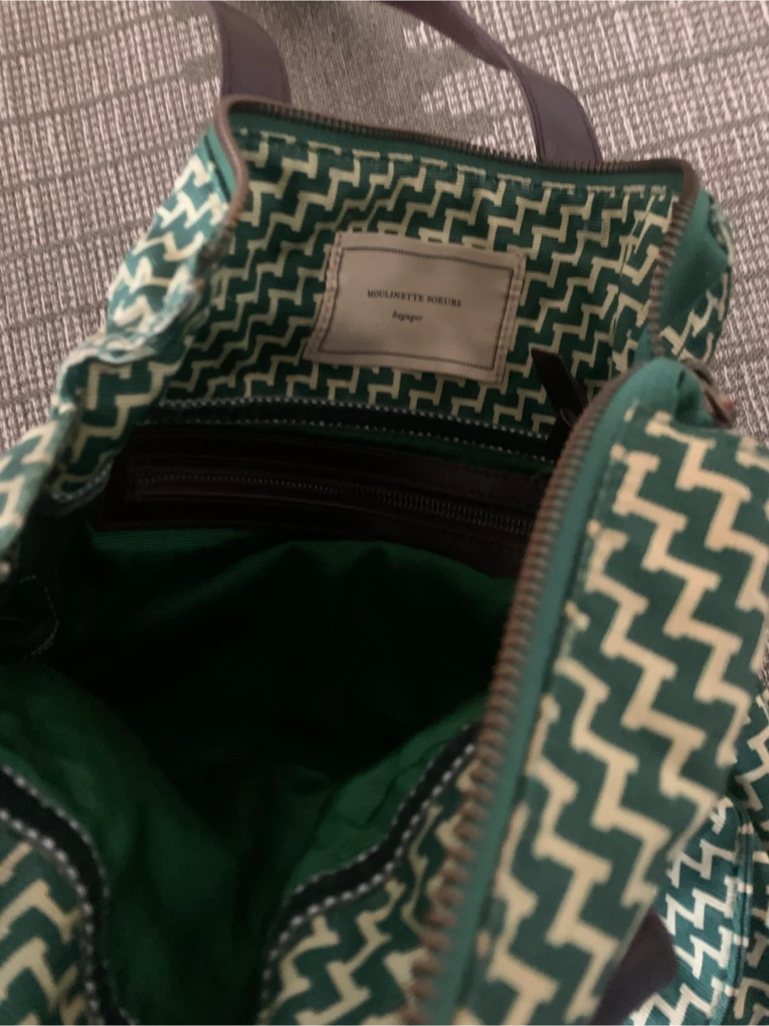 Moulinette Soeurs tote bag with a green and cream chevron pattern. It features dark brown leather straps and a zippered top closure. The interior has a zippered pocket.